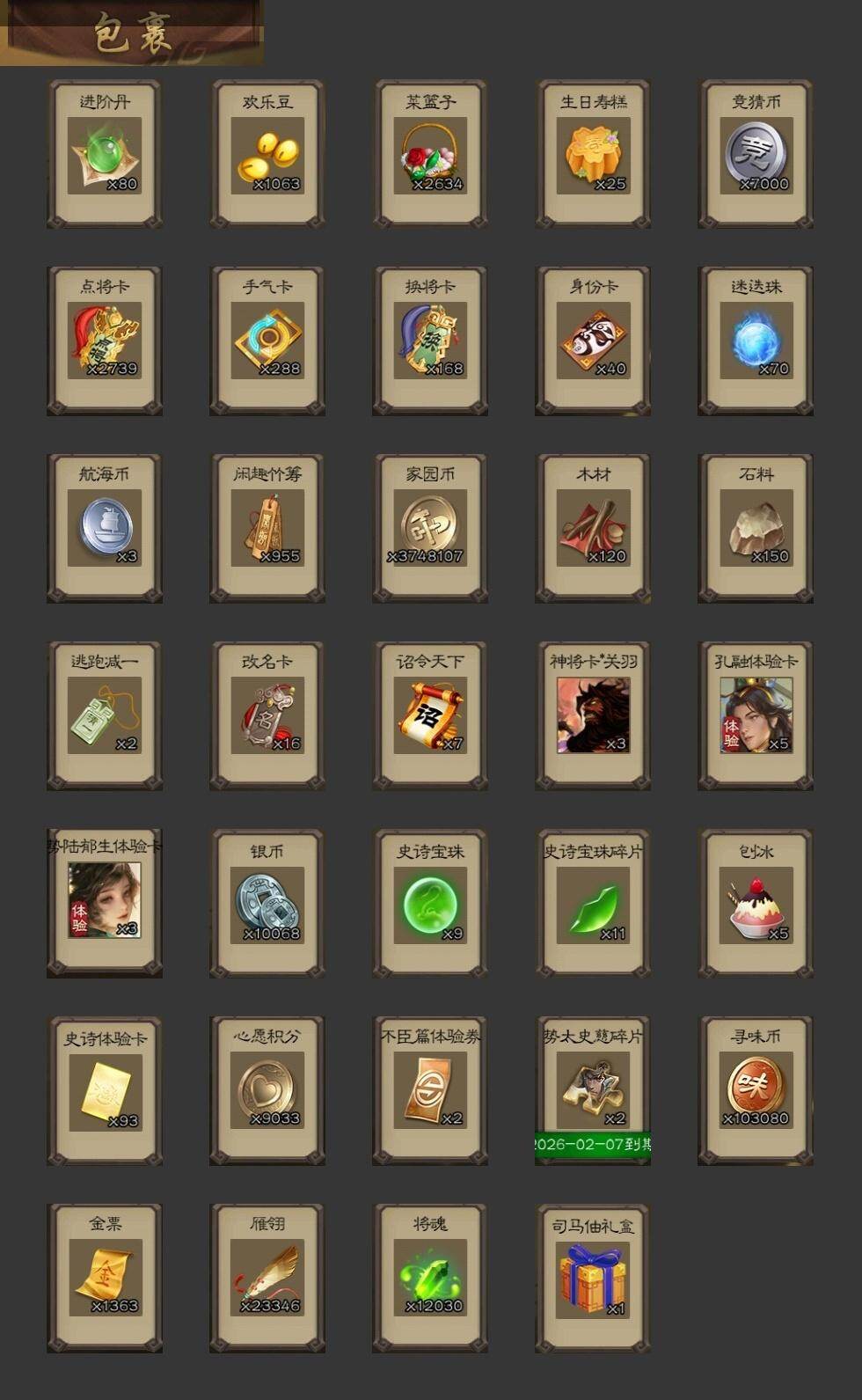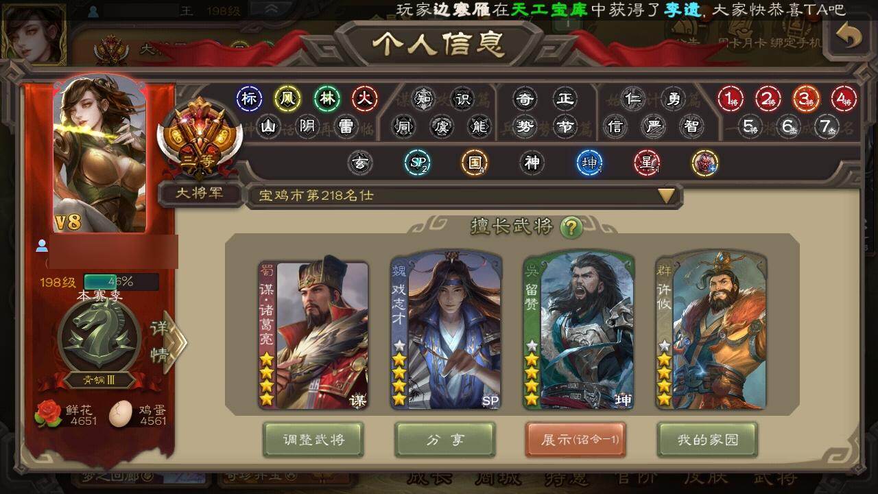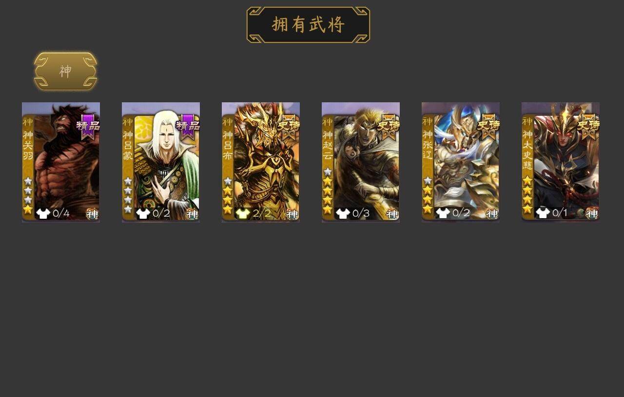 [15170205]【114】官阶:大将军;vip等级:vip8;史诗武将数量:36;动态皮肤数量:31;武将总数:351;史诗宝珠数量:9;将魂数量:12030;神将:6;魏国史诗武将:16;蜀国史诗武将:9;吴国史诗武将:5;群史诗武将:12 神吕布神赵云神张辽神太史慈神关羽神吕蒙sp司马昭星周不疑王粲界钟会曹纯戏志才清河公主关索谋诸葛亮谋赵云谋马超诸葛瞻沙摩柯谯周花鬘董允周处骆统留赞界朱然界徐盛裴秀左慈张让星黄忠麹义沮授界李儒谋张角张绣李傕阎象许攸神诸葛亮-观星唤雨神吕布-监兵噬魅动态神吕布-冠绝天下动态鲍三娘-情定缘起钟会-潜蛟觊天动态曹丕-气荡山河(动态)甄姬-明珠耀躯(动态)sp蔡文姬-兔年冬日动态曹昂-竭战麟伤动态戏志才-举棋若定动态曹纯-虎年春节动态清河公主-魅影萦心动态刘备-龙御天下动态诸葛亮-国之柱石(动态)关索-依心缱绻动态李丰-太仓聚粟动态太史慈-涤荡江东动态周处-义除三害动态孙权-永开吴祚动态孙策-虎踞江东动态孙权-吴王六剑动态孙尚香-兔年春节动态孙尚香-星流霆击动态界孙权-吴王六剑动态界孙尚香-星流霆击动态徐盛-破军杀将动态刘赞-灵魂歌王动态灵雎-霜刃绚练动态袁绍-声震寰宇动态左慈-道法显威(动态)吕布-鼠年七夕动态许攸-盛气凌人动态界吕布-鼠年七夕动态苏飞-肝胆相照动态星甘宁-肝胆相照动态sp赵云-威名尽显动态