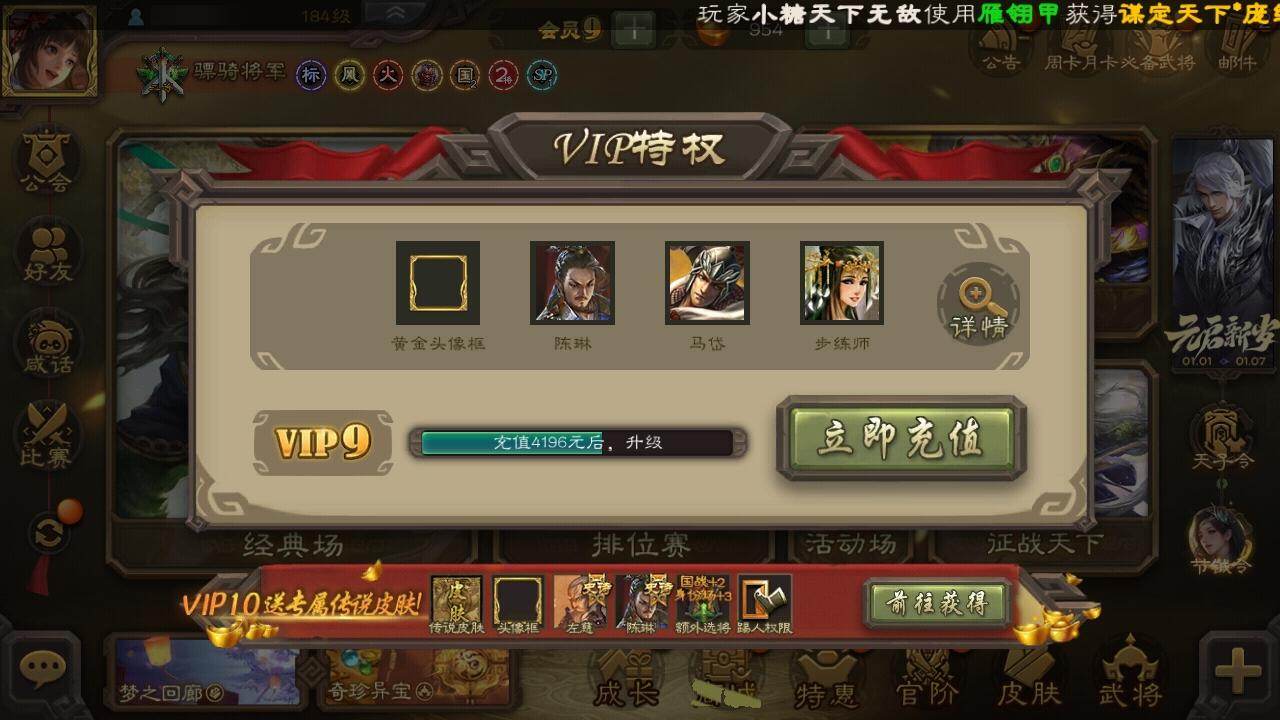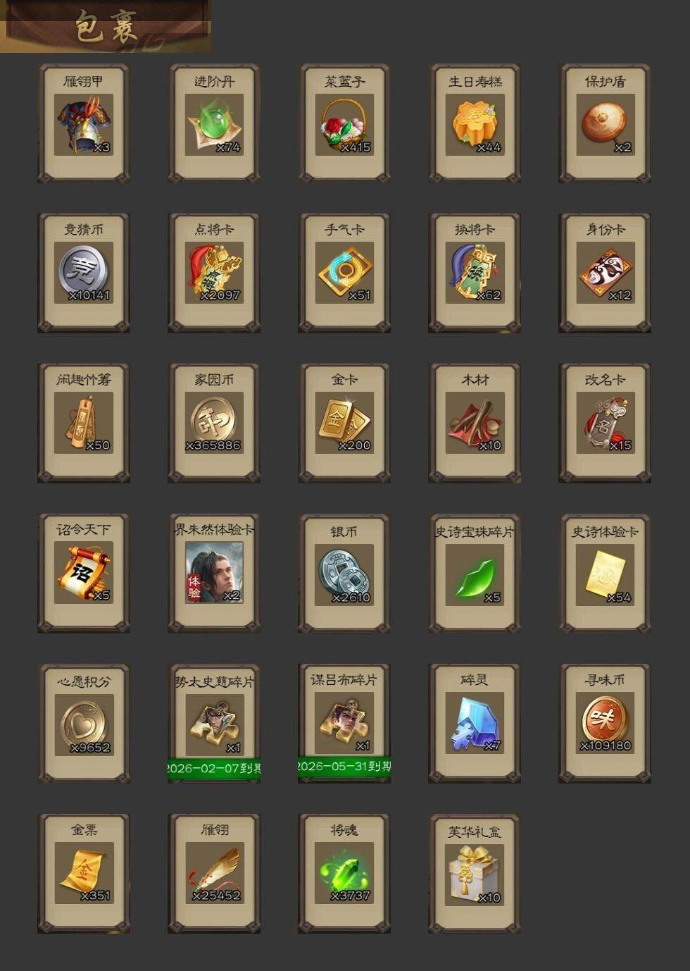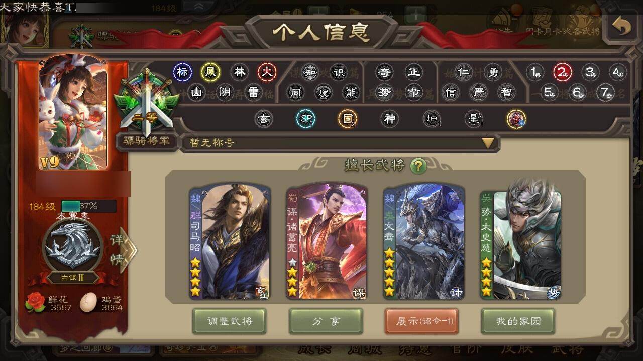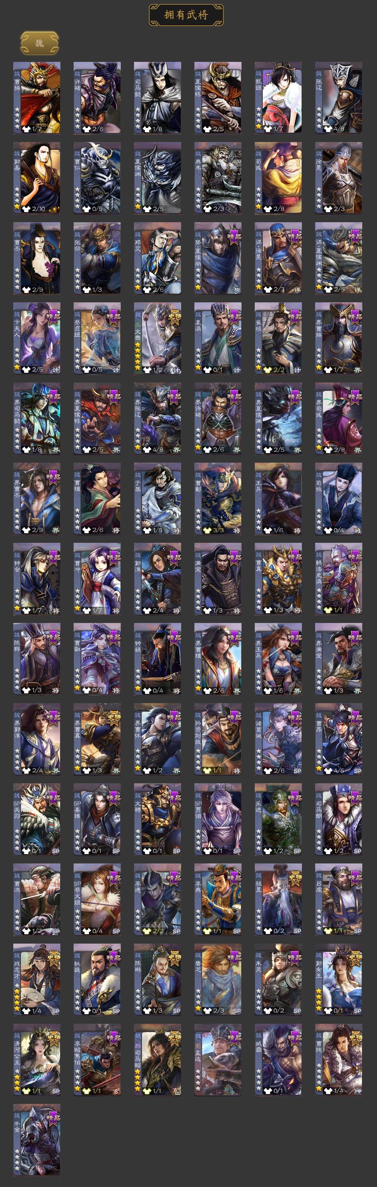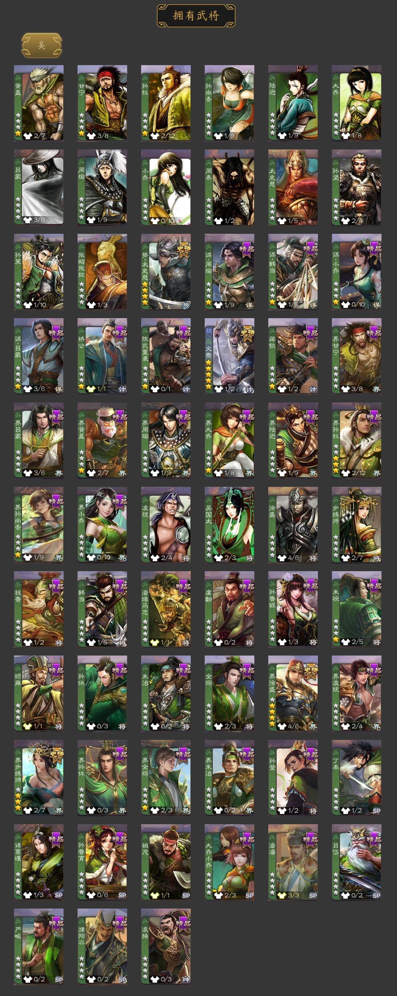 [15170341]【807】官阶:骠骑将军;vip等级:vip9;史诗武将数量:27;动态皮肤数量:16;武将总数:284;史诗宝珠数量:0;将魂数量:3737;神将:2;魏国史诗武将:13;蜀国史诗武将:7;吴国史诗武将:5;群史诗武将:8 神吕布神赵云郭女王界曹真陈琳曹纯戏志才清河公主程昱关索谋诸葛亮谋赵云沙摩柯谯周花鬘董允界徐盛界步练师势太史慈文鸯左慈麹义界李儒公孙康星董卓兀突骨司马昭神吕蒙势夏侯尚sp关羽sp蔡文姬乐进曹昂诸葛诞朱灵文聘sp姜维钟会曹冲郭淮满宠界王异界曹操界司马懿界夏侯惇界张辽界许褚李典曹真韩浩史涣陈群曹叡钟繇司马朗李通孙资刘放吕虔鲁芝界荀彧杜畿界曹丕界曹植界满宠界郭淮卞夫人蔡贞姬袁涣崔琰谋徐晃界曹休李昭焦伯谋夏侯渊牛金界夏侯渊臧霸sp孙尚香关银屏夏侯霸马良关兴张苞廖化界马岱关平简雍刘封界法正界关兴张苞界刘备界关羽界张飞界赵云sp徐庶吴懿周仓张松夏侯氏糜竺李严黄皓界黄月英胡金定吕凯张翼杨仪邓芝傅肜界简雍费祎糜夫人许靖界吴懿彭羕谋庞统界张嶷谋张飞霍峻诸葛果蒋琬费祎甘夫人凌操大乔小乔诸葛瑾孙鲁育程普韩当潘璋马忠虞翻界甘宁界吕蒙界黄盖界周瑜界大乔界陆逊孙鲁班朱桓顾雍孙休朱治全琮孙登界孙权界孙尚香潘濬严畯吕岱界凌统桥公陈武董袭蒋钦濮阳兴谋韩当谋吕蒙谋周瑜界孙休界全琮界朱治谋小乔界小乔孟达友徐庶友庞统伏完刘协界袁术sp赵云张宝伏皇后李儒界于吉华雄袁术界华佗界吕布公孙瓒蔡夫人公孙渊郭图逢纪张鲁严白虎sp黄月英刘虞曹节蔡邕sp太史慈樊稠董承星张辽星张郃界公孙瓒丁原胡车儿界伏皇后羊祜谋刘赪谋陈宫谋卢植阎象木鹿大王张任神曹操-天下归心神张辽-散敌擒孙郭嘉-墨点江山动态荀彧-龙年限定动态张春华-宣穆夜袭动态曹昂-竭战麟伤动态张昌蒲-龙年端午动态清河公主-魅影萦心动态星周不疑-龙年清明动态卧龙诸葛-火烧博望动态关银屏-兔年春节动态关
