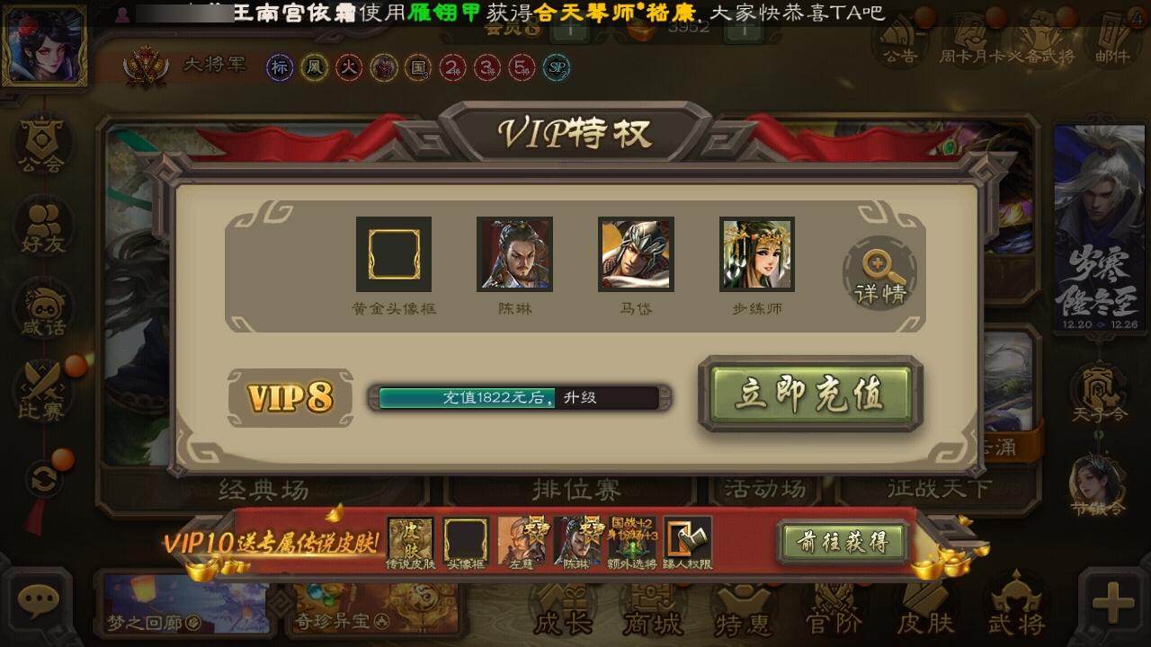 [15170549]【897】官阶:大将军;vip等级:vip8;史诗武将数量:34;动态皮肤数量:29;武将总数:350;史诗宝珠数量:0;将魂数量:1347;神将:7;魏国史诗武将:18;蜀国史诗武将:7;吴国史诗武将:3;群史诗武将:12 神吕布神赵云神陆逊神张辽神太史慈神吕蒙神周瑜星周不疑王粲文鸯魏-司马昭界钟会界于禁郝昭曹婴曹纯戏志才谋赵云谋马超诸葛瞻赵襄沙摩柯傅佥花鬘周处骆统界徐盛谋郭嘉谋黄月英郑玄麹义界左慈界李儒鲍信谋张角李傕阎象许攸星董卓神太史慈-勇撼日月动态神周瑜-波澜不惊神郭嘉-半醉山河神陆逊-绽焰摧枯动态星周不疑-才广志宏动态曹植-龙年中秋动态钟繇-安民护祚(动态)曹丕-气荡山河(动态)甄姬-明珠耀躯(动态)sp蔡文姬-兔年冬日动态张春华-雪中舞刃动态司马昭-昭威淮南(动态)清河公主-魅影萦心动态刘备-龙御天下动态诸葛亮-龙年限定动态费祎-安民护祚(动态)黄月英-明良千古动态诸葛瞻-绵竹之殇动态界黄月英-明良千古动态诸葛果-蛇年限定动态周处-义除三害动态吕蒙-剑起惊澜动态陆逊-龙年七夕动态孙权-永开吴祚动态徐盛-破军杀将动态鲁肃-蛇年端午动态文鸯-势若万钧动态袁绍-声震寰宇动态李儒-鸠杀少帝动态界李儒-鸠杀少帝动态左慈-蛇年限定动态