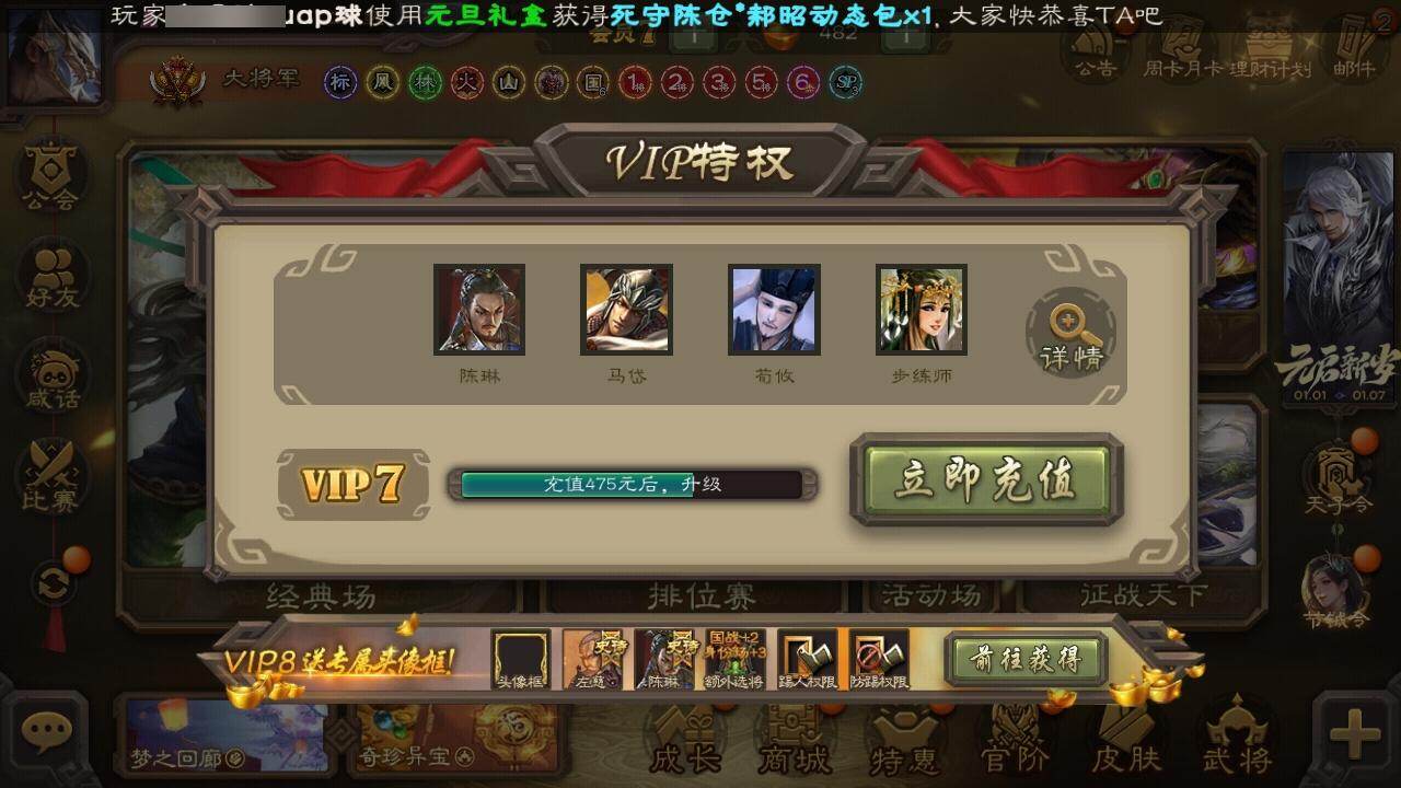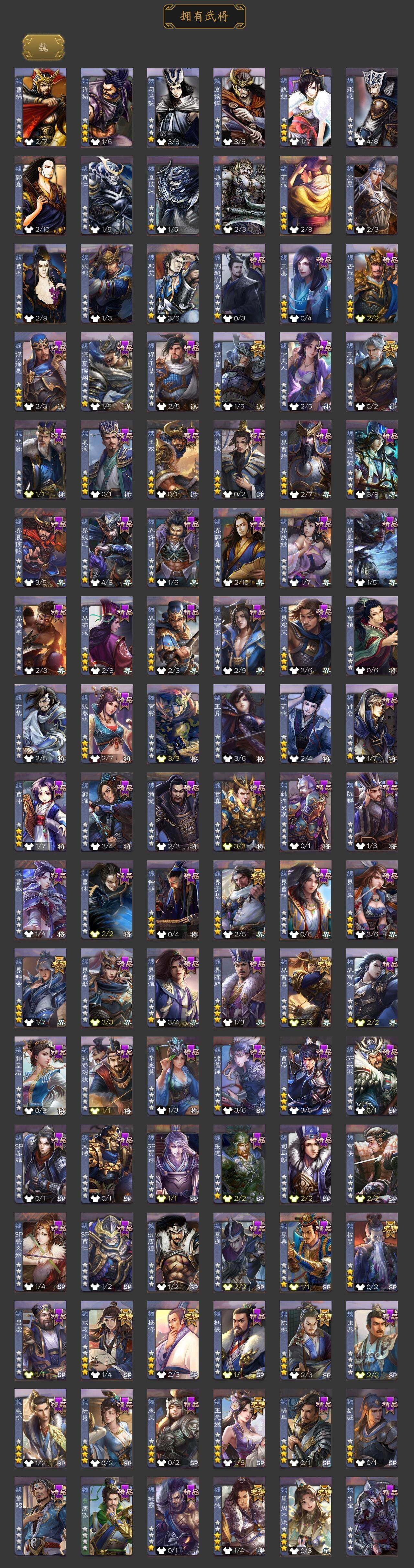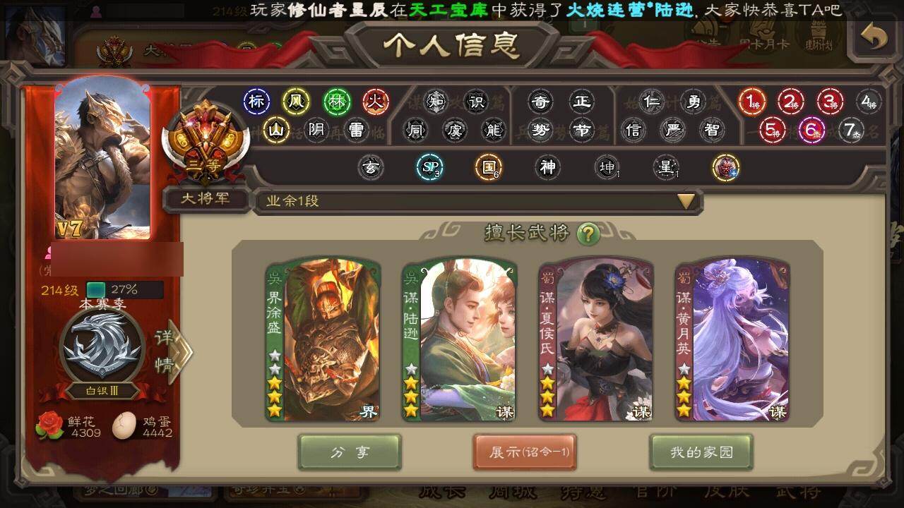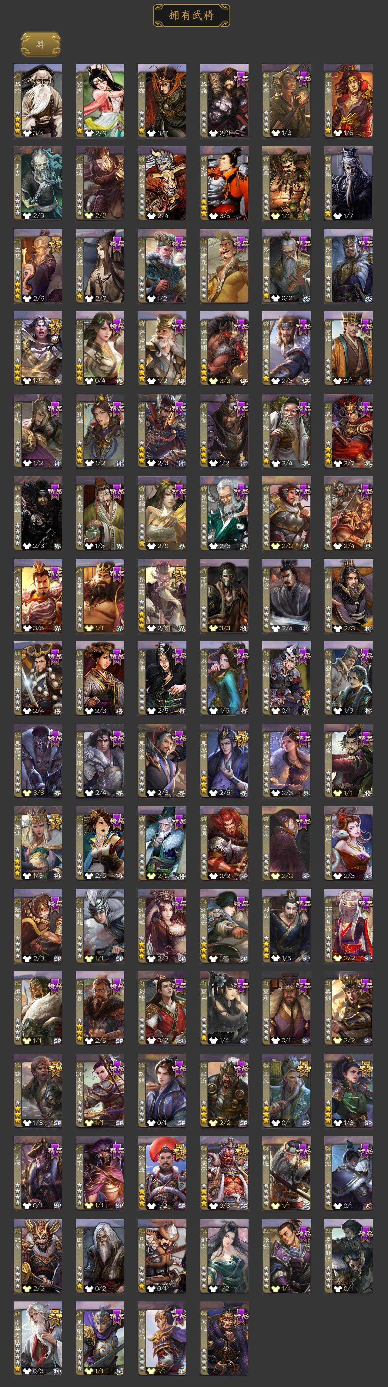 [15170716]【691】官阶:大将军;vip等级:vip7;史诗武将数量:42;动态皮肤数量:27;武将总数:382;史诗宝珠数量:3;将魂数量:3695;神将:2;魏国史诗武将:16;蜀国史诗武将:12;吴国史诗武将:5;群史诗武将:11 神赵云神张辽星周不疑谋曹仁杨修王元姬王凌界钟会界于禁界曹真陈琳曹纯戏志才程昱关索谋夏侯氏谋赵云谋马超诸葛瞻张星彩王平沙摩柯谯周界黄忠花鬘董允谋陆逊吴景界朱然界徐盛贺齐左慈张让王允苏飞麹义南华老仙界左慈界李儒公孙康谋张角兀突骨神吕蒙神周瑜sp关羽sp曹仁sp蔡文姬乐进曹昂诸葛诞朱灵文聘sp姜维张春华钟会曹冲郭淮满宠界王异界曹操界司马懿界夏侯惇界张辽界许褚界郭嘉李典曹真韩浩史涣陈群曹叡曹休钟繇司马朗王基李通郭皇后孙资刘放辛宪英界甄姬吕虔蒯越蒯良界典韦界荀彧界徐晃杜畿界曹丕毌丘俭界邓艾张恭界曹植界曹彰界郭淮卞夫人界陈群华歆袁涣王双崔琰毛玠杨阜阮慧谋徐晃谋于禁界曹休胡班谋夏侯渊牛金界夏侯渊臧霸唐咨董昭sp孙尚香关银屏夏侯霸马良关兴张苞廖化界马岱关平简雍刘封界法正界关兴张苞界刘备界关羽界张飞界赵云界马超sp徐庶吴懿周仓张松刘谌夏侯氏糜竺孙乾李严黄皓界黄月英界诸葛亮赵统赵广严颜界伊籍界卧龙诸葛界庞统界孟获界祝融陈到界姜维界刘禅吕凯张翼杨仪邓芝傅肜费祎糜夫人王甫赵累界周仓向宠宗预刘巴彭羕谋庞统谋黄月英界张嶷谋孟获谋张飞霍峻诸葛果界魏延蒋琬费祎糜芳傅士仁甘夫人鲁肃凌操大乔小乔诸葛恪诸葛瑾孙鲁育程普韩当潘璋马忠虞翻朱然界周泰界甘宁界吕蒙界黄盖界周瑜界大乔界陆逊孙鲁班朱桓顾雍孙休朱治全琮阚泽孙登岑昏界孙权潘濬sp庞统孙亮界孙坚吕岱周鲂周妃界张昭张纮许贡卫温诸葛直界吴国太界凌统界韩当界程普界虞翻界潘璋马忠桥公张温陈武董袭孙翊蒋钦界顾雍界孙鲁班濮阳兴谋韩当谋吕蒙界全琮界朱治界朱桓谋小乔界小乔蔡文姬势黄祖