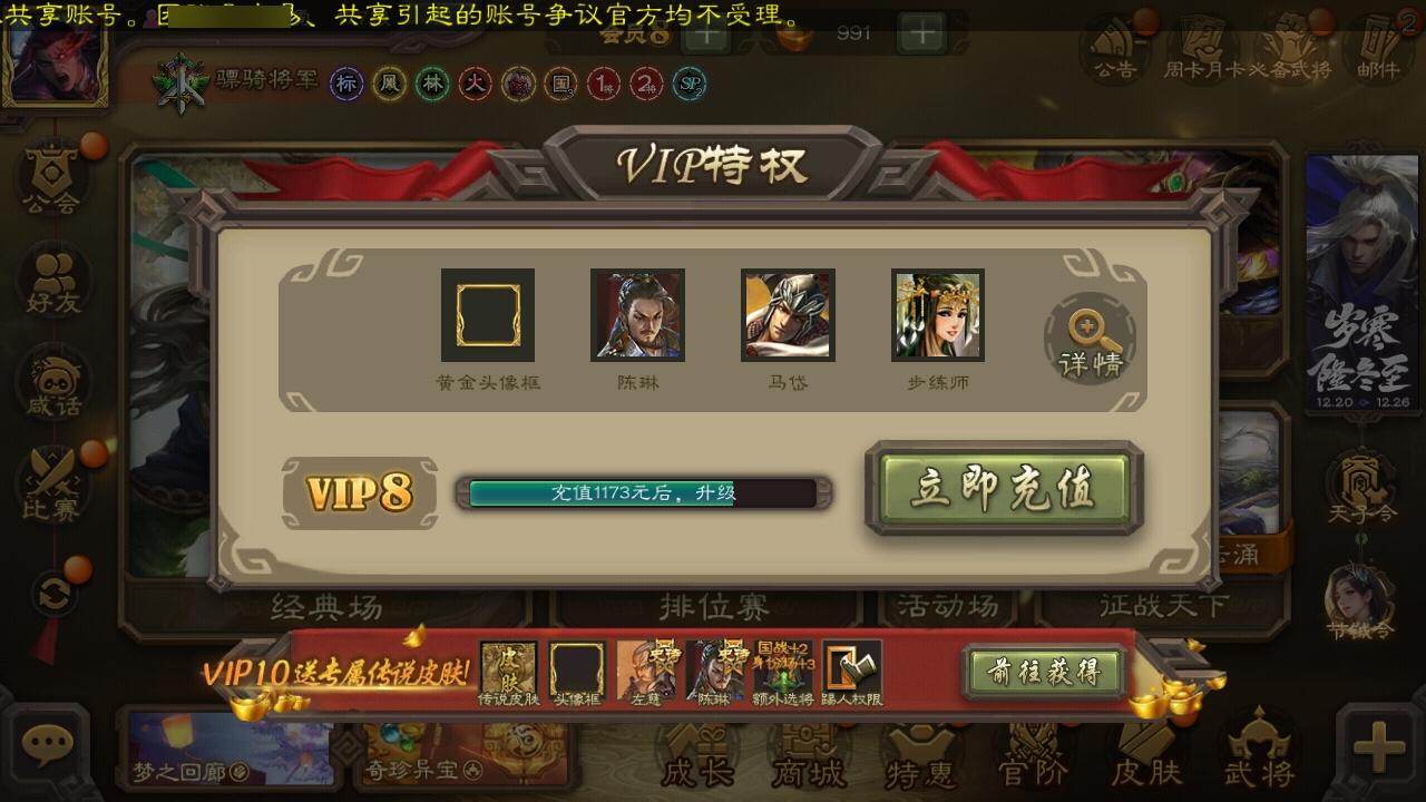 [15171024]【689】官阶:骠骑将军;vip等级:vip8;史诗武将数量:29;动态皮肤数量:26;武将总数:312;史诗宝珠数量:0;将魂数量:6707;神将:4;魏国史诗武将:10;蜀国史诗武将:5;吴国史诗武将:4;群史诗武将:12 神吕布神太史慈神关羽神吕蒙文鸯魏-司马昭司马师界钟会嵇康曹纯戏志才清河公主谋赵云谋马超诸葛瞻沙摩柯花鬘界朱然界徐盛势陆郁生势太史慈谋郭嘉谋黄月英谋荀彧左慈张让星黄忠界李儒卑弥呼谋张角李傕许攸星董卓神太史慈-勇撼日月动态神吕布-监兵噬魅动态郭嘉-以身证道(动态)曹丕-龙年中秋动态司马昭-昭威淮南(动态)星徐晃-斧引霹雳动态清河公主-魅影萦心动态黄忠-烈箭贯云动态)费祎-安民护祚(动态)张飞-明良千古动态卧龙诸葛-火烧博望动态周处-义除三害动态鲁肃-蛇年端午动态文鸯-势若万钧动态高顺-每战必克动态麹义-扬刀立威动态吕布-虓虎之勇动态界吕布-虓虎之勇动态李儒-鸠杀少帝动态界李儒-鸠杀少帝动态庞德公-超脱于世动态sp赵云-威名尽显动态陶谦-安民护祚动态左慈-蛇年限定动态