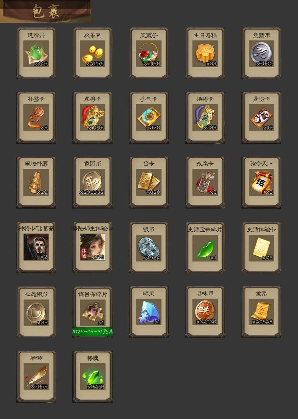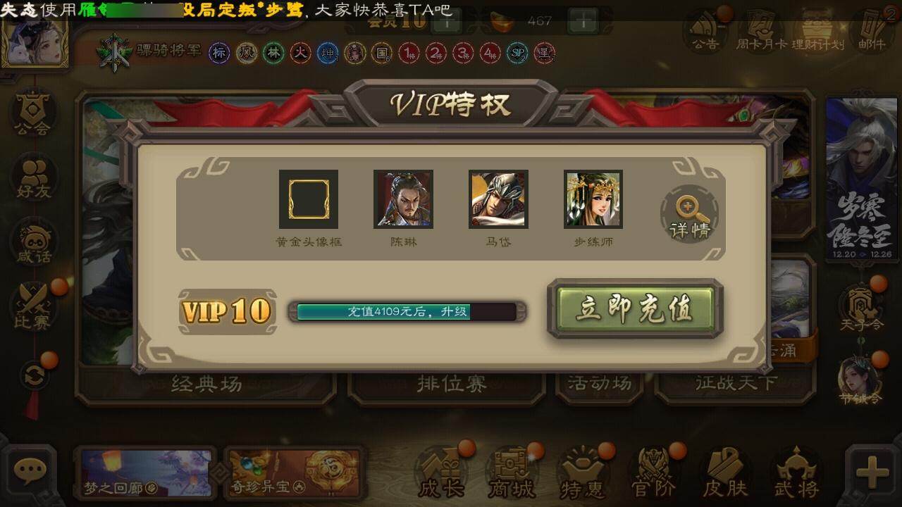 [15171276]【446】官阶:骠骑将军;vip等级:vip10;史诗武将数量:36;动态皮肤数量:17;武将总数:330;史诗宝珠数量:0;将魂数量:9779;神将:5;魏国史诗武将:8;蜀国史诗武将:6;吴国史诗武将:6;群史诗武将:12 神赵云神张辽神关羽神吕蒙神周瑜王粲羊徽瑜司马师马钧界钟会界于禁嵇康郝昭陈琳曹纯戏志才关索谋马超张星彩沙摩柯界黄忠花鬘骆统留赞界朱然界徐盛界步练师势陆郁生谋荀彧张让杨彪星黄忠麹义南华老仙沮授卑弥呼张绣李傕许攸星董卓神吕蒙-兼资文武动态神赵云-战龙在野动态神赵云-神龙天降曹丕-气荡山河(动态)王粲-笔翰如流动态羊徽瑜-牛年中秋动态司马师-牛年中秋动态费祎-安民护祚(动态)李丰-太仓聚粟动态周处-义除三害动态孙权-牛年七夕动态界孙权-牛年七夕动态徐氏-琪花瑶草动态孙鲁育-牛年端午动态刘赞-抗音而歌动态貂蝉-绝世倾城动态界貂蝉-绝世倾城动态星甘宁-肝胆相照动态杨彪-忧心国事动态