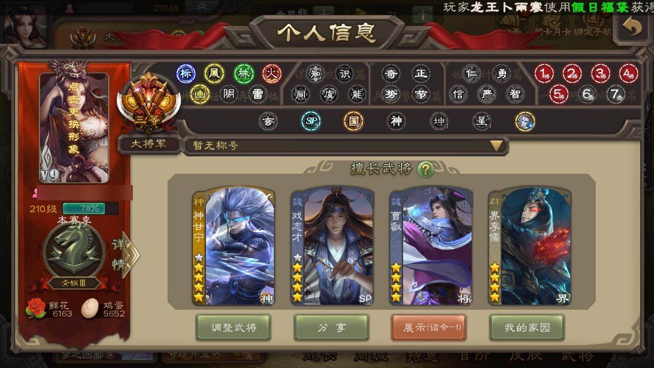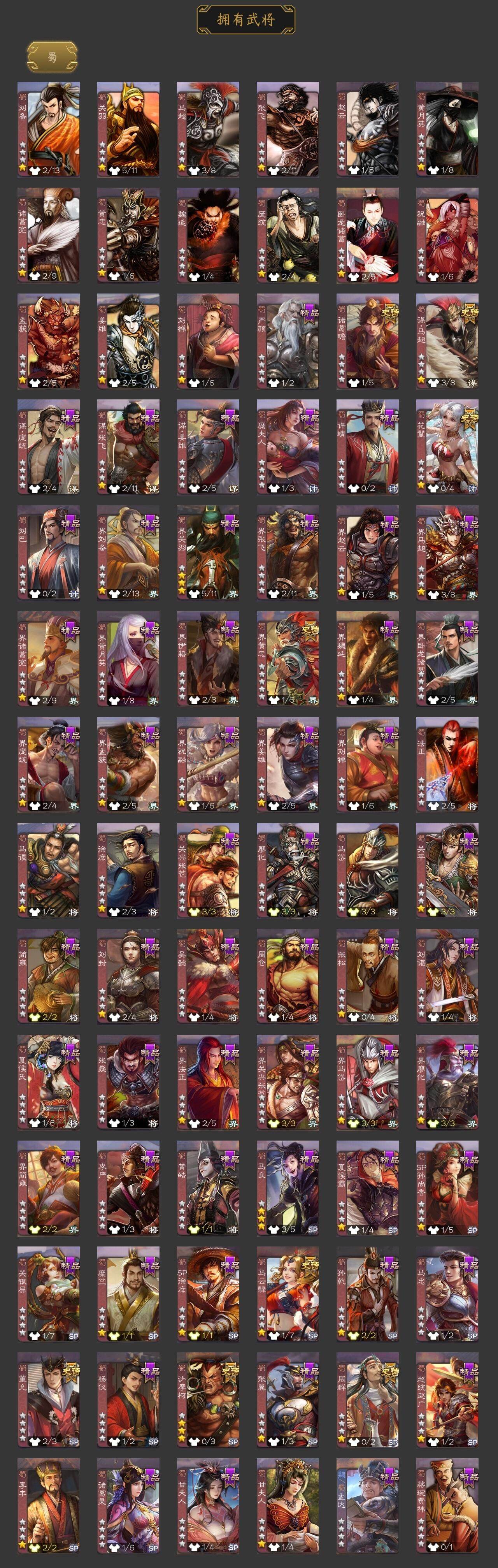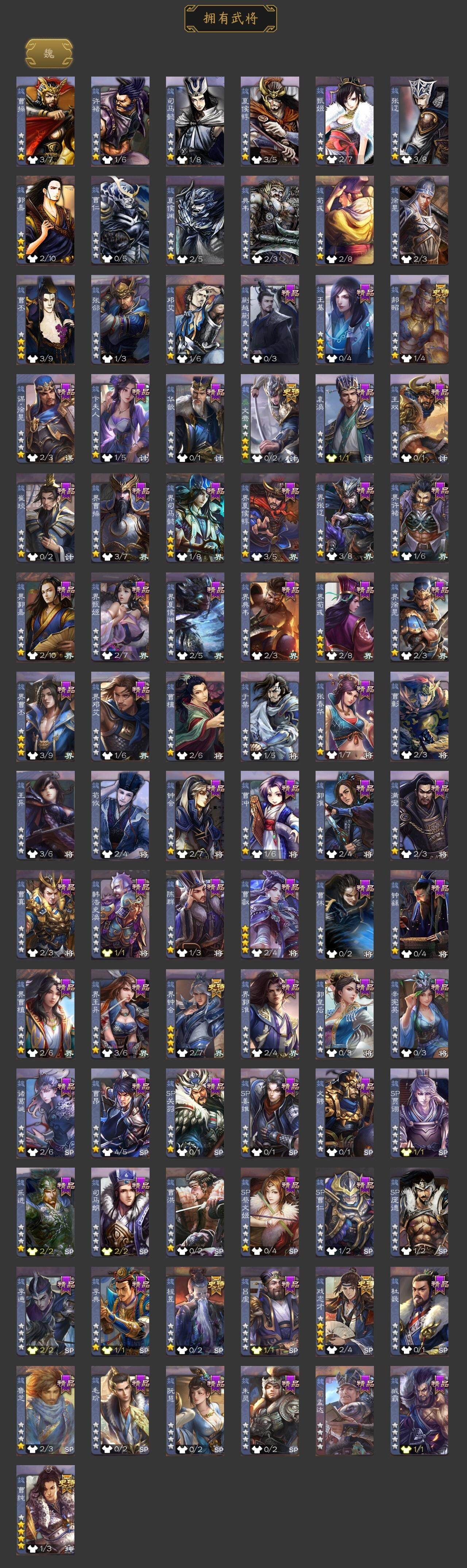 [15171651]【368】官阶:大将军;vip等级:vip9;史诗武将数量:35;动态皮肤数量:25;武将总数:337;史诗宝珠数量:22;将魂数量:3597;神将:8;魏国史诗武将:18;蜀国史诗武将:8;吴国史诗武将:5;群史诗武将:12 神吕布神赵云神刘备神甘宁神张辽神吕蒙神周瑜神诸葛亮文鸯界钟会郝昭曹纯戏志才马云騄谋马超诸葛瞻周群沙摩柯界黄忠花鬘董允孙寒华骆统界朱然界徐盛界步练师左慈苏飞麹义南华老仙沮授界左慈界李儒公孙康卑弥呼张绣李傕许攸神甘宁-万人辟易动态曹丕-气荡山河(动态)甄姬-明珠耀躯(动态)曹叡-睥睨天下动态荀彧-驱虎吞狼动态曹丕-牛年清明动态界曹丕-牛年清明动态曹昂-竭战麟伤动态戏志才-举棋若定动态曹纯-虎年春节动态卧龙诸葛-龙跃凤鸣动态刘备-明良千古动态关羽-明良千古动态马超-牛年春节动态界刘备-明良千古动态界马超-牛年春节动态关索-虎年七夕动态鲍三娘-虎年七夕动态李丰-太仓聚粟动态胡金定-明良千古动态太史慈-涤荡江东动态周处-义除三害动态吕蒙-剑起惊澜动态周瑜-兔年七夕动态孙策-虎踞江东动态孙权-吴王六剑动态界孙权-吴王六剑动态麹义-扬刀立威动态张角-黄天当立动态李儒-鸠杀少帝动态界李儒-鸠杀少帝动态星甘宁-肝胆相照动态