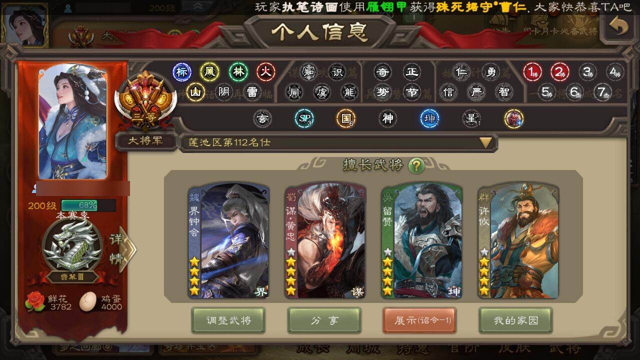 [15172045]【936】官阶:大将军;vip等级:vip8;史诗武将数量:38;动态皮肤数量:36;武将总数:348;史诗宝珠数量:0;将魂数量:4491;神将:5;魏国史诗武将:12;蜀国史诗武将:13;吴国史诗武将:3;群史诗武将:10 神赵云神陆逊神刘备神吕蒙神诸葛亮sp司马昭星周不疑杨修界钟会界于禁界曹真陈琳曹纯戏志才势辛宪英关索谋诸葛亮谋黄忠谋夏侯氏谋赵云谋马超诸葛瞻周群赵襄张星彩沙摩柯谯周花鬘骆统留赞界徐盛裴秀左慈星黄忠星甘宁苏飞界李儒张绣李傕许攸友徐庶钟会-潜蛟觊天动态曹丕-气荡山河(动态)sp蔡文姬-兔年冬日动态荀彧-驱虎吞狼动态曹真-虎年春节动态曹昂-竭战麟伤动态刘备-龙御天下动态黄忠-烈箭贯云动态)关羽-明良千古动态张星彩-临军对阵动态李丰-太仓聚粟动态太史慈-涤荡江东动态周处-义除三害动态孙权-永开吴祚动态孙策-虎踞江东动态周瑜-免年清明动态孙权-猪年端午动态孙权-牛年七夕动态孙尚香-星流霆击动态界孙权-猪年端午动态界孙权-牛年七夕动态界孙尚香-星流霆击动态刘赞-灵魂歌王动态鲁肃-蛇年端午动态陆逊-蛇年清明动态灵雎-霜刃绚练动态袁绍-声震寰宇动态吕布-鼠年七夕动态吕布-虓虎之勇动态吕布-傲睨万物动态左慈-役使鬼神动态许攸-盛气凌人动态界吕布-鼠年七夕动态界吕布-虓虎之勇动态星甘宁-锦帆游侠动态皇甫嵩-奋钺振旅动态左慈-蛇年限定动态