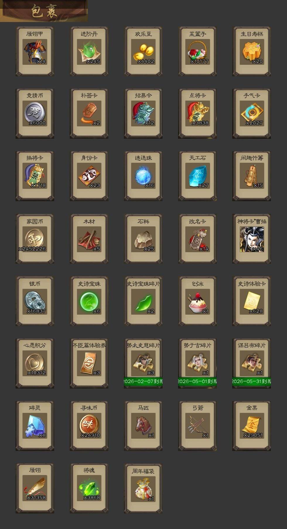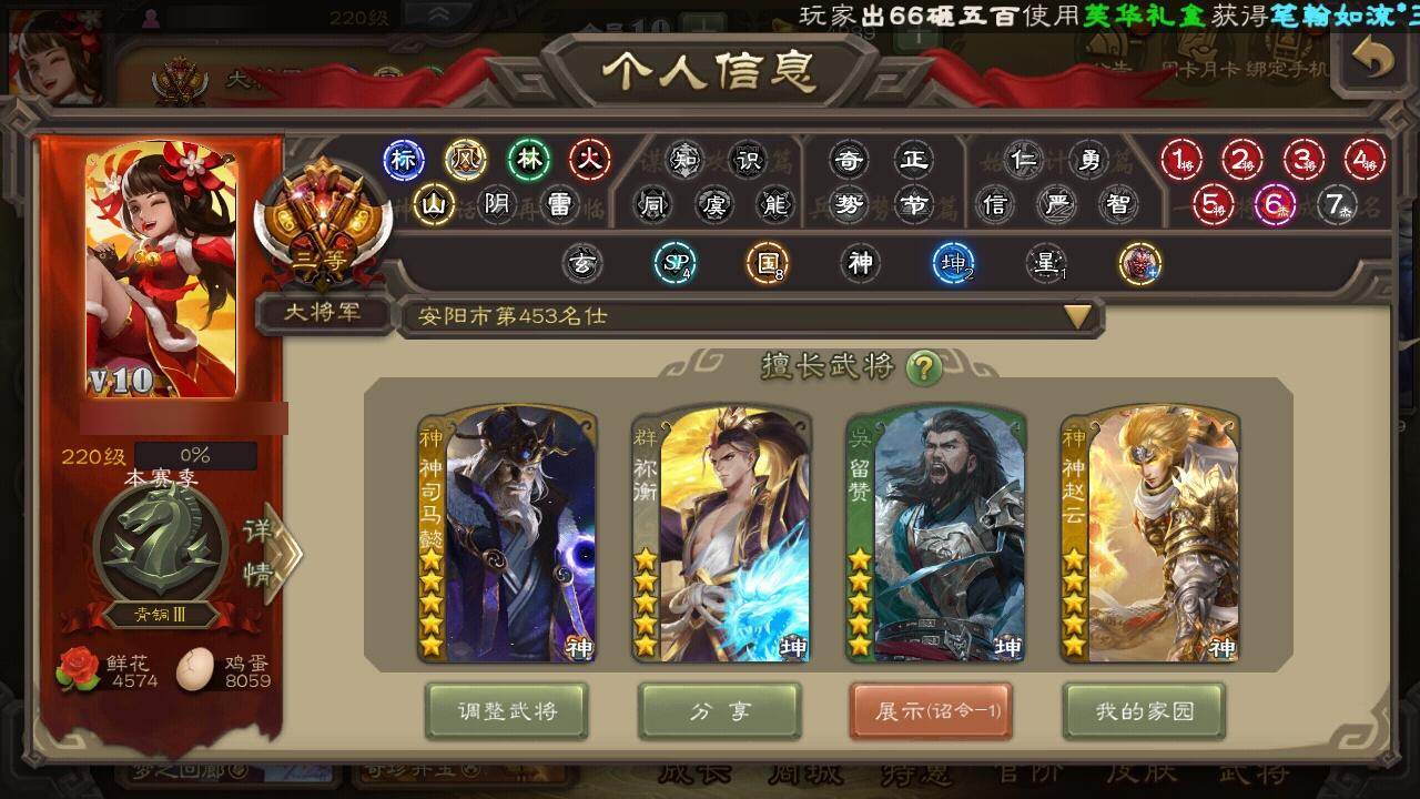 [15172063]【171】官阶:大将军;vip等级:vip10;史诗武将数量:47;动态皮肤数量:33;武将总数:369;史诗宝珠数量:6;将魂数量:3868;神将:9;魏国史诗武将:15;蜀国史诗武将:9;吴国史诗武将:6;群史诗武将:20 神吕布神赵云神司马懿神陆逊神张辽神太史慈神吕蒙神周瑜神诸葛亮王粲魏-司马昭界钟会曹婴曹纯戏志才谋赵云谋马超诸葛瞻张星彩王平沙摩柯谯周界黄忠花鬘周处骆统留赞界徐盛界步练师贺齐裴秀左慈郑玄张让张琪瑛星黄忠王允陶谦苏飞司马徽麹义庞德公祢衡沮授界李儒公孙康杜预鲍信李傕许攸神太史慈-勇撼日月动态神陆逊-绽焰摧枯动态神周瑜-陵光引灵动态神诸葛亮-观星唤雨神曹操-天下归心神吕布-监兵噬魅动态神赵云-战龙在野动态神司马懿-鉴往知来动态甄姬-明珠耀躯(动态)曹丕-龙年中秋动态sp蔡文姬-兔年冬日动态张春华-雪中舞刃动态界曹植-鼠年端午动态戏志才-举棋若定动态朱灵-以战破氐动态司马昭-昭威淮南(动态)费祎-安民护祚(动态)马超-牛年春节动态赵云-牛年春节动态界赵云-牛年春节动态界马超-牛年春节动态sp孙尚香-猪年圣诞动态赵襄-猪年春节动态鲍三娘-虎年七夕动态诸葛果-蛇年限定动态孙茹-龙年七夕动态周处-义除三害动态吕蒙-剑起惊澜动态孙权-猪年端午动态大乔-鼠年春分动态小乔-鼠年春分动态周妃-笼中箜响动态界大乔-鼠年春分动态界孙权-猪年端午动态界小乔-鼠年春分动态刘赞-灵魂歌王动态麹义-扬刀立威动态吕布-鼠年七夕动态界吕布-鼠年七夕动态李儒-鸠杀少帝动态界李儒-鸠杀少帝动态董白-猪年春节动态祢衡-击鼓骂曹动态左慈-蛇年限定动态