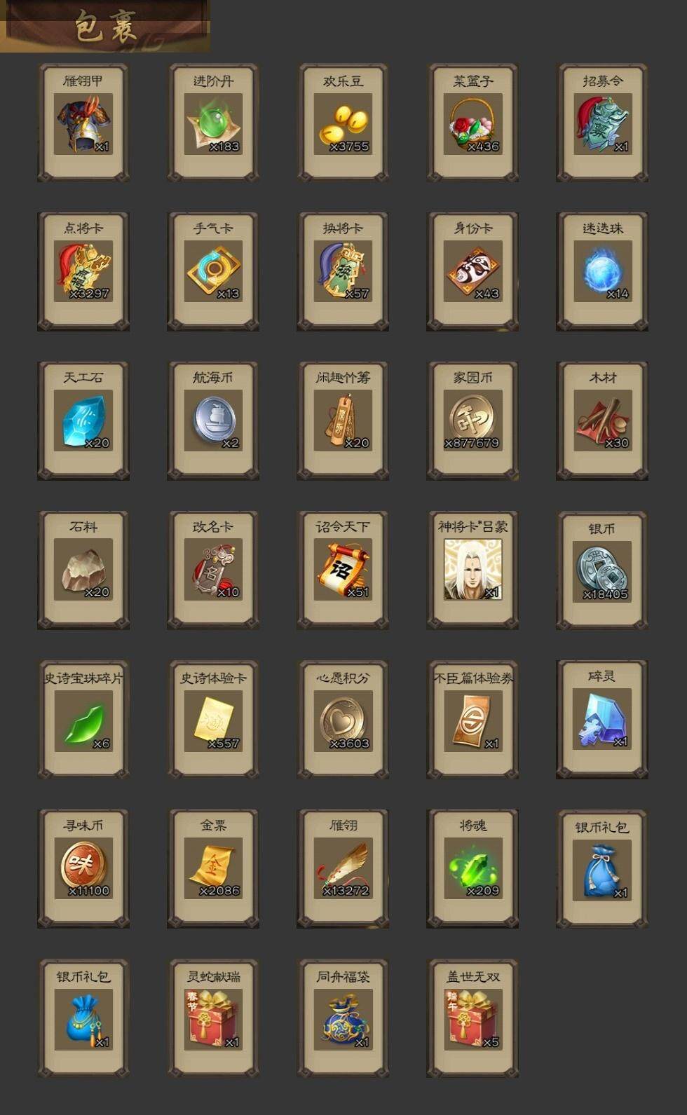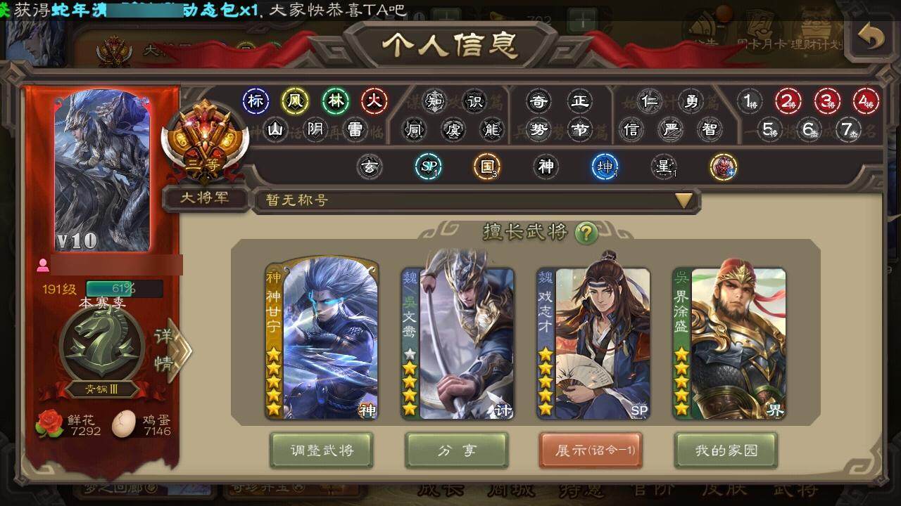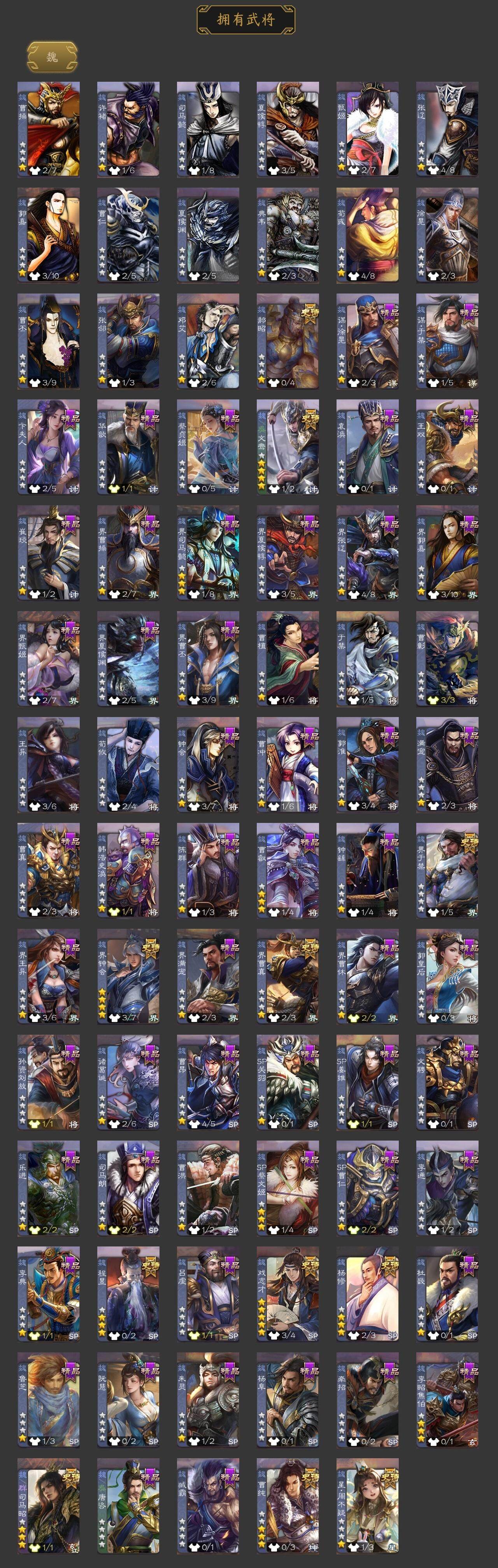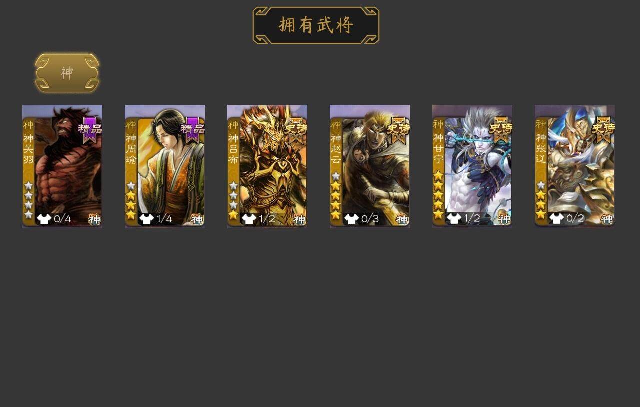 [15172080]【72】官阶:大将军;vip等级:vip10;史诗武将数量:49;动态皮肤数量:32;武将总数:325;史诗宝珠数量:0;将魂数量:209;神将:6;魏国史诗武将:28;蜀国史诗武将:12;吴国史诗武将:5;群史诗武将:17 神吕布神赵云神甘宁神张辽神关羽神周瑜星周不疑杨修文鸯魏-司马昭界钟会界于禁界曹真郝昭曹纯戏志才马云騄谋夏侯氏谋赵云谋马超诸葛瞻周群赵襄王平沙摩柯谯周界黄忠花鬘周处骆统留赞界徐盛界步练师谋公孙瓒左慈郑玄张让星黄忠陶谦苏飞麹义南华老仙祢衡沮授界李儒公孙康卑弥呼谋张角张绣许攸神甘宁-万人辟易动态神吕布-监兵噬魅动态星周不疑-才广志宏动态钟会-龙年端午(动态)曹丕-气荡山河(动态)甄姬-明珠耀躯(动态)sp蔡文姬-兔年冬日动态荀彧-驱虎吞狼动态邓艾-神兵天降动态张春华-牛年立冬动态钟会-谋谟之勋动态界钟会-谋谟之勋动态曹昂-竭战麟伤动态戏志才-举棋若定动态朱灵-以战破氐动态司马昭-昭威淮南(动态)星徐晃-斧引霹雳动态刘备-龙御天下动态马超-牛年春节动态马超-虎年冬至动态黄月英-虎年中秋动态界马超-牛年春节动态鲍三娘-虎年七夕动态李丰-太仓聚粟动态诸葛果-蛇年限定动态周处-义除三害动态陆逊-龙年七夕动态孙策-虎踞江东动态孙权-牛年七夕动态界孙权-牛年七夕动态徐盛-破军杀将动态步练师-牛年七夕动态界步练师-牛年七夕动态文鸯-势若万钧动态袁绍-声震寰宇动态麹义-扬刀立威动态吕布-鼠年七夕动态界吕布-鼠年七夕动态