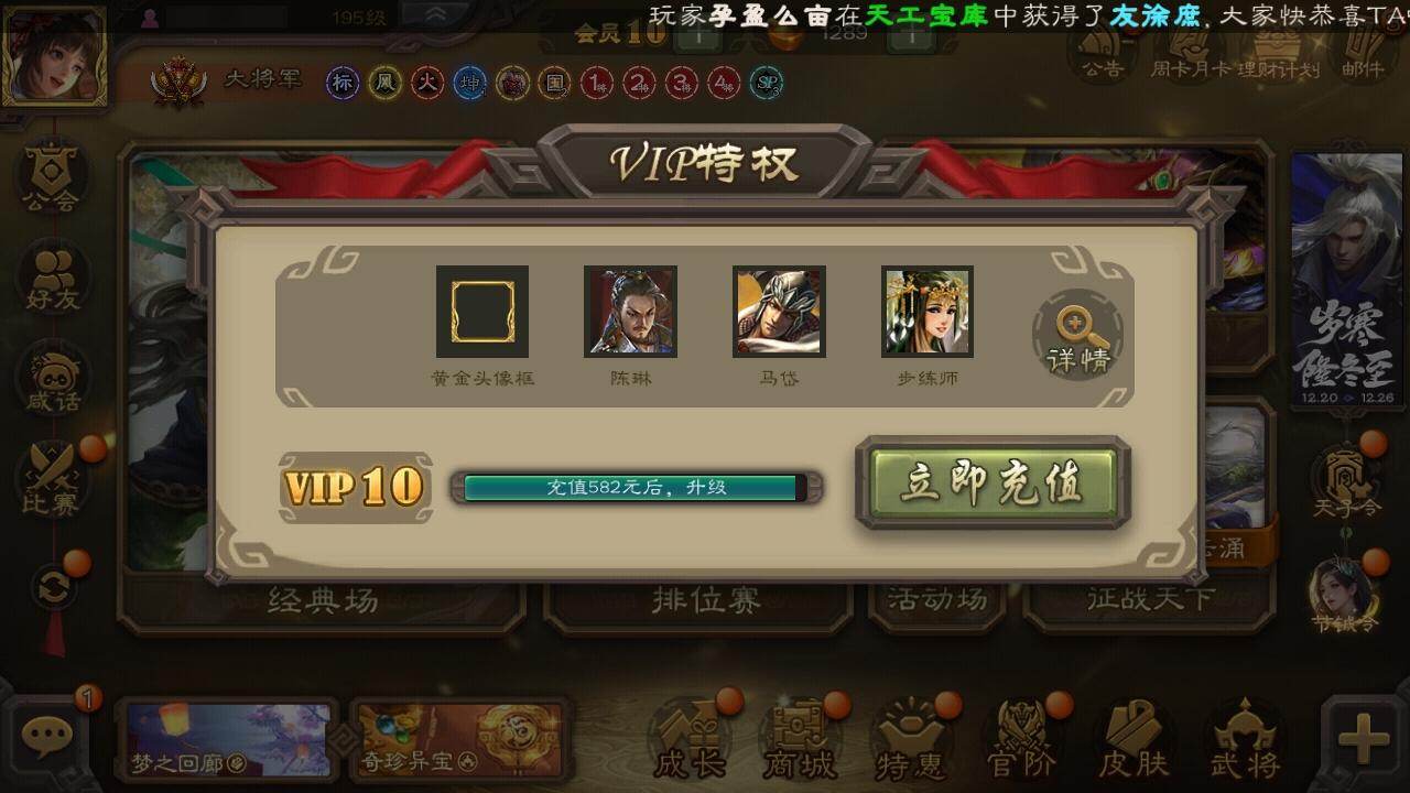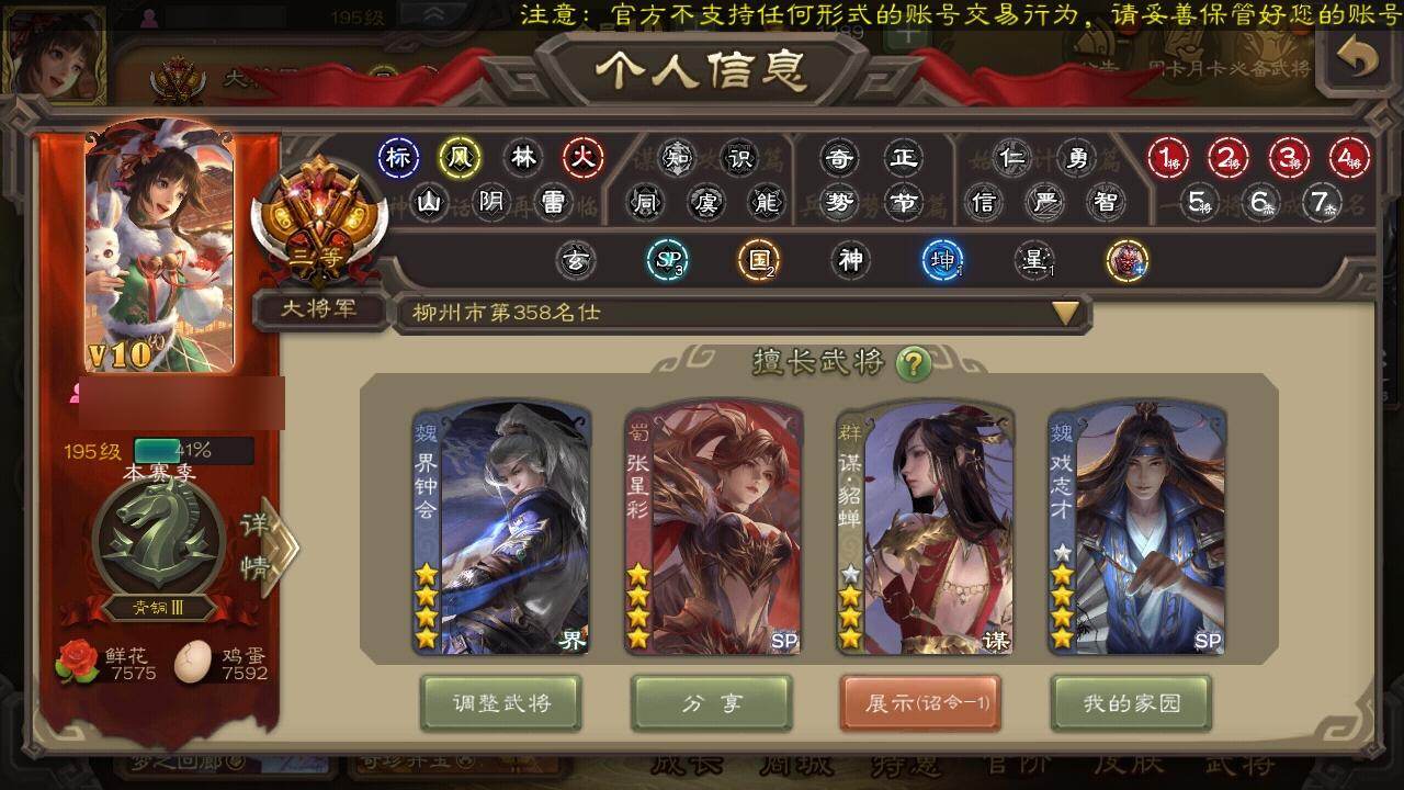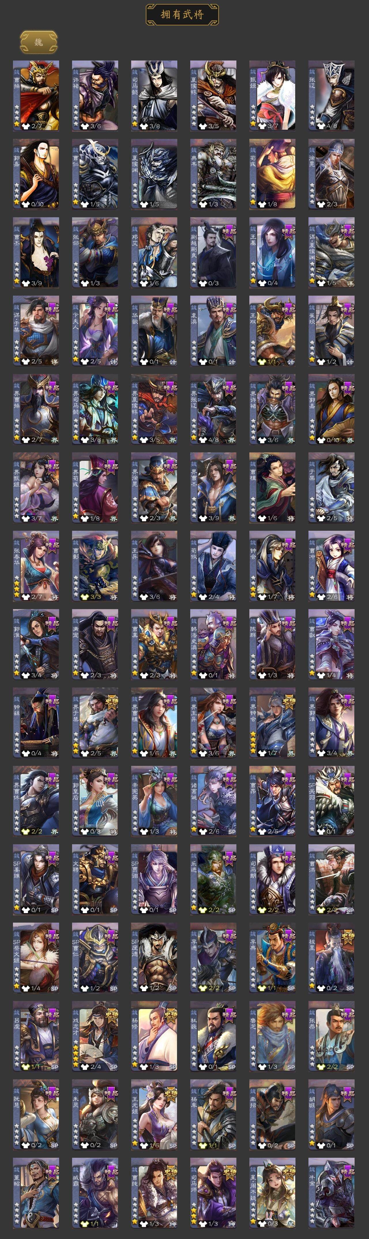 [15172103]【85】官阶:大将军;vip等级:vip10;史诗武将数量:33;动态皮肤数量:28;武将总数:325;史诗宝珠数量:0;将魂数量:2109;神将:4;魏国史诗武将:12;蜀国史诗武将:8;吴国史诗武将:3;群史诗武将:11 神赵云神太史慈神吕蒙神周瑜星周不疑杨修王元姬司马师界钟会界于禁曹纯戏志才关索谋赵云诸葛瞻张星彩沙摩柯谯周花鬘董允周处留赞界徐盛谋黄月英十常侍谋貂蝉左慈杨彪星黄忠麹义南华老仙沮授界李儒卑弥呼神太史慈-勇撼日月动态神曹操-天下归心神赵云-战龙在野动态钟会-潜蛟觊天动态曹丕-气荡山河(动态)sp蔡文姬-兔年冬日动态张春华-雪中舞刃动态戏志才-举棋若定动态曹纯-长坂败备动态孟获-祸崇南疆动态刘备-龙御天下动态诸葛亮-龙年限定动态关索-依心缱绻动态马超-虎年冬至动态黄月英-明良千古动态界黄月英-明良千古动态关银屏-兔年春节动态张星彩-临军对阵动态吕蒙-剑起惊澜动态孙权-永开吴祚动态周瑜-兔年七夕动态孙寒华-莲华熠熠动态周瑜-免年清明动态孙尚香-兔年春节动态徐盛-破军杀将动态刘赞-灵魂歌王动态貂蝉-忧君难寐动态袁绍-声震寰宇动态李儒-鸠杀少帝动态界李儒-鸠杀少帝动态何太后-蛇蝎为心动态张琪瑛-虎年冬至动态皇甫嵩-奋钺振旅动态