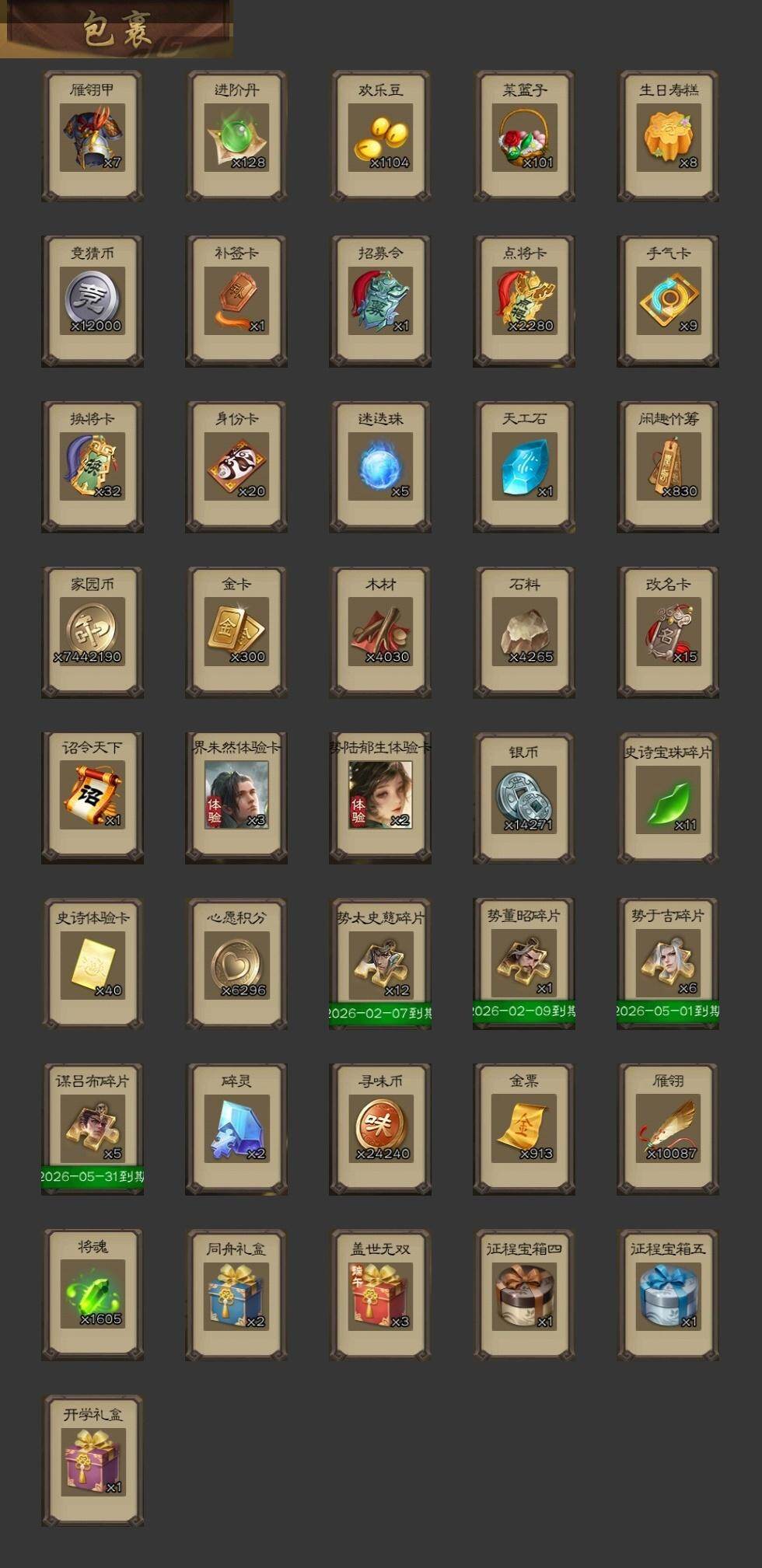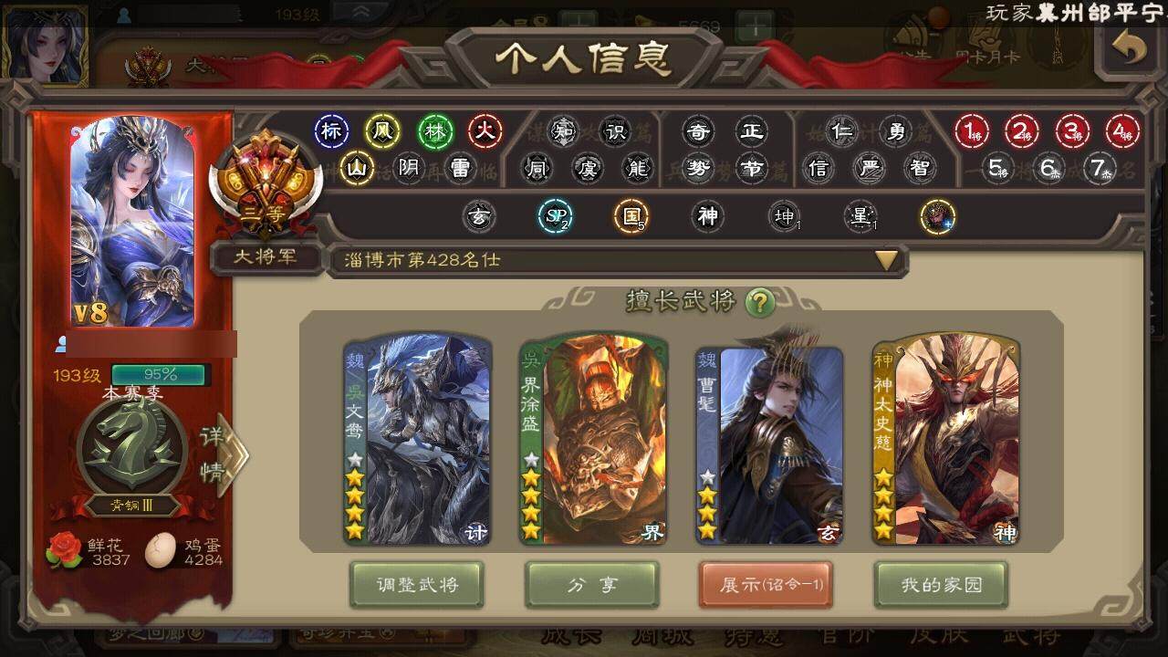 [15172348]【438】官阶:大将军;vip等级:vip8;史诗武将数量:30;动态皮肤数量:32;武将总数:337;史诗宝珠数量:0;将魂数量:1605;神将:6;魏国史诗武将:18;蜀国史诗武将:4;吴国史诗武将:4;群史诗武将:11 神吕布神赵云神陆逊神太史慈神吕蒙神周瑜曹髦星周不疑文鸯界钟会曹纯清河公主谋赵云谋马超沙摩柯谋关羽周处骆统界徐盛贺齐左慈张让星黄忠麹义沮授界左慈卑弥呼谋张角许攸友徐庶星董卓神太史慈-勇撼日月动态神吕蒙-心生万象神赵云-神龙天降星周不疑-才广志宏动态钟繇-安民护祚(动态)曹丕-气荡山河(动态)甄姬-明珠耀躯(动态)sp蔡文姬-兔年冬日动态钟会-谋谟之勋动态界钟会-谋谟之勋动态曹昂-竭战麟伤动态清河公主-魅影萦心动态花鬘-依心缱绻动态孟获-祸崇南疆动态诸葛亮-龙年限定动态费祎-安民护祚(动态)关羽-明良千古动态诸葛果-蛇年限定动态周处-义除三害动态吕蒙-剑起惊澜动态陆逊-龙年七夕动态黄盖-兔年端午动态孙权-永开吴祚动态徐盛-破军杀将动态文鸯-势若万钧动态高顺-每战必克动态许攸-火烧乌巢动态左慈-道法显威(动态)南华老仙-冠绝天下动态麹义-扬刀立威动态吕布-虓虎之勇动态界吕布-虓虎之勇动态庞德公-超脱于世动态sp赵云-威名尽显动态皇甫嵩-奋钺振旅动态左慈-蛇年限定动态