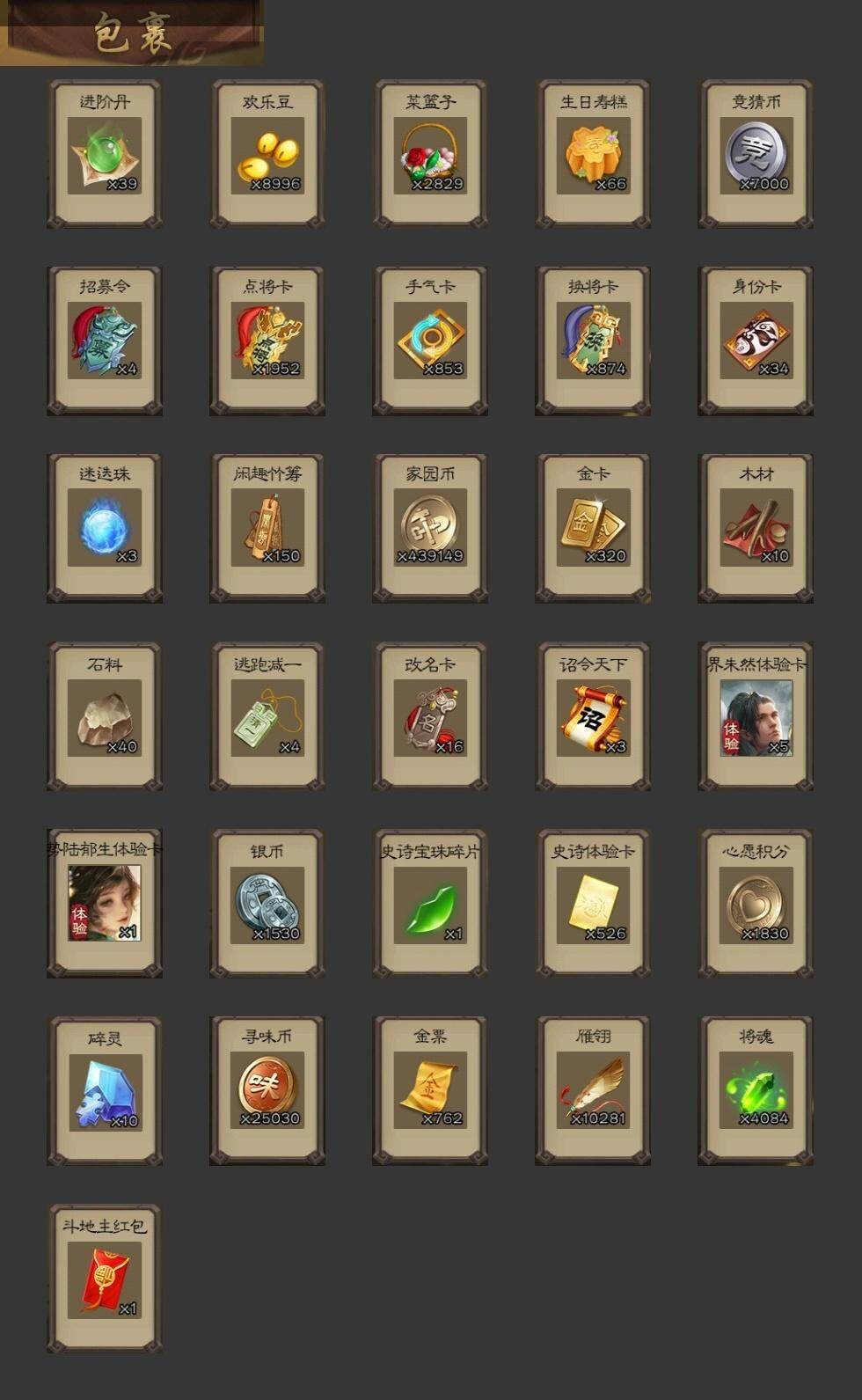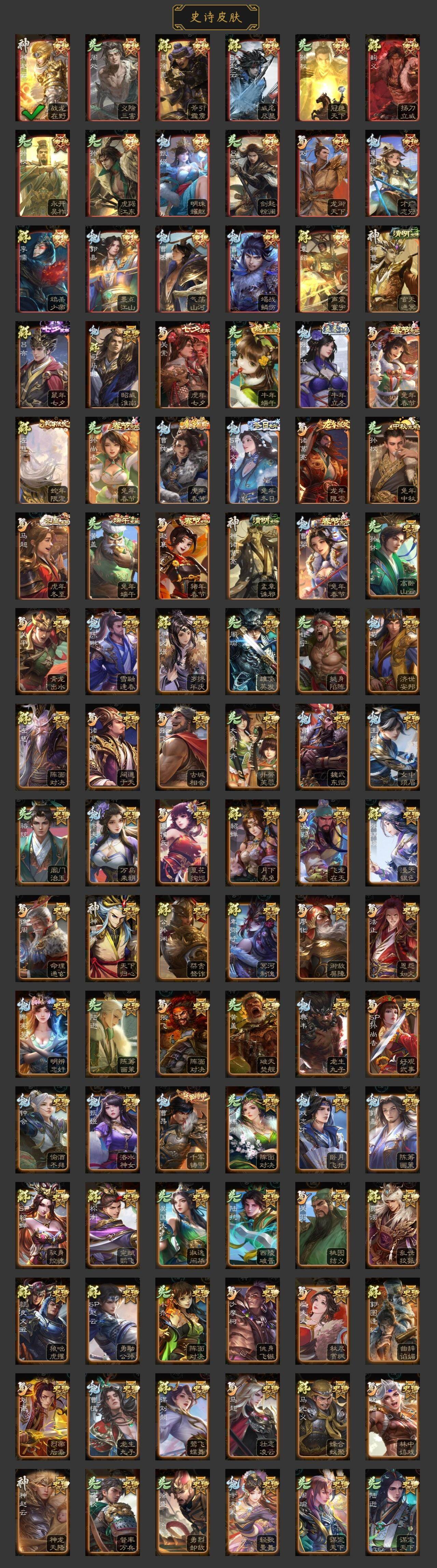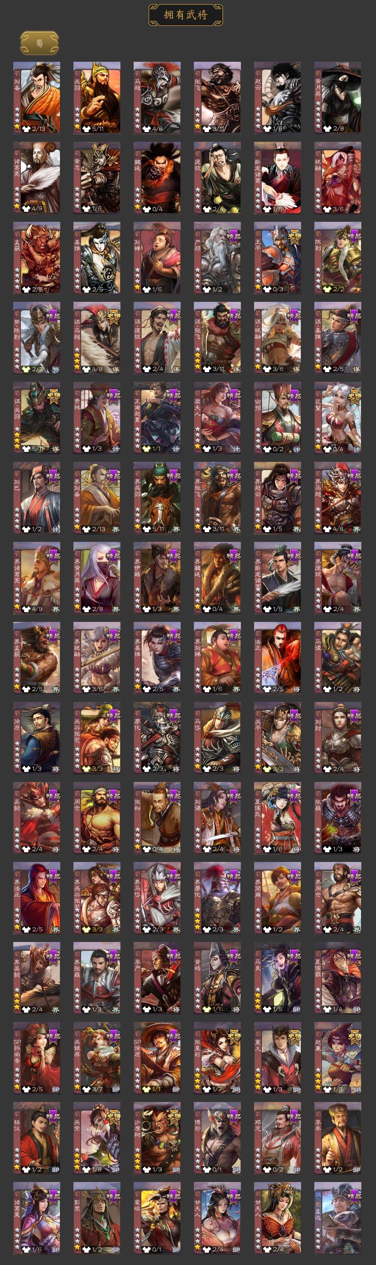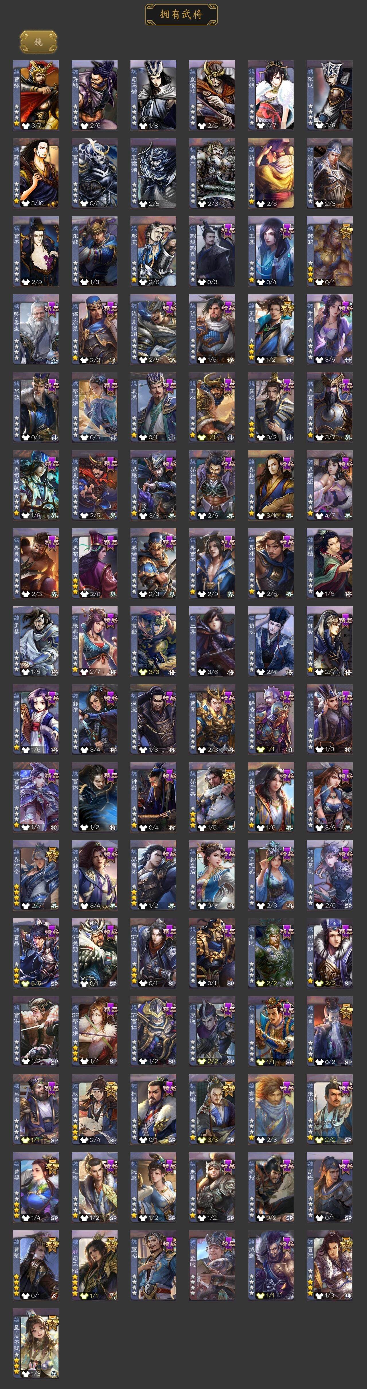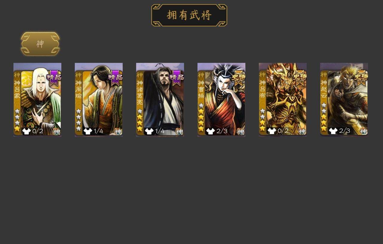 [15172968]【58】官阶:大将军;vip等级:vip9;史诗武将数量:38;动态皮肤数量:33;武将总数:357;史诗宝珠数量:0;将魂数量:4084;神将:6;魏国史诗武将:20;蜀国史诗武将:9;吴国史诗武将:3;群史诗武将:11 神曹操神吕布神赵云神吕蒙神周瑜神诸葛亮曹髦星周不疑王粲魏-司马昭界钟会界于禁郝昭陈琳曹婴曹纯戏志才关索谋马超赵襄张星彩王平沙摩柯花鬘董允谋关羽周处吴景界徐盛左慈郑玄苏飞麹义南华老仙沮授界李儒公孙康谋张角李傕星董卓神诸葛亮-孟章诛邪动态神曹操-天下归心神曹操-玄天通冥动态神赵云-战龙在野动态神赵云-神龙天降星周不疑-才广志宏动态曹丕-气荡山河(动态)甄姬-明珠耀躯(动态)sp蔡文姬-兔年冬日动态张春华-牛年立冬动态曹昂-竭战麟伤动态曹婴-兔年春节动态曹纯-虎年春节动态司马昭-昭威淮南(动态)星徐晃-斧引霹雳动态刘备-龙御天下动态诸葛亮-龙年限定动态马超-虎年冬至动态关银屏-兔年春节动态赵襄-猪年春节动态关索-虎年七夕动态周处-义除三害动态吕蒙-剑起惊澜动态黄盖-兔年端午动态孙权-兔年中秋动态孙权-永开吴祚动态孙策-虎踞江东动态孙权-冠绝天下动态孙尚香-兔年春节动态孙鲁育-牛年端午动态袁绍-声震寰宇动态麹义-扬刀立威动态吕布-鼠年七夕动态界吕布-鼠年七夕动态李儒-鸠杀少帝动态界李儒-鸠杀少帝动态sp赵云-威名尽显动态左慈-蛇年限定动态