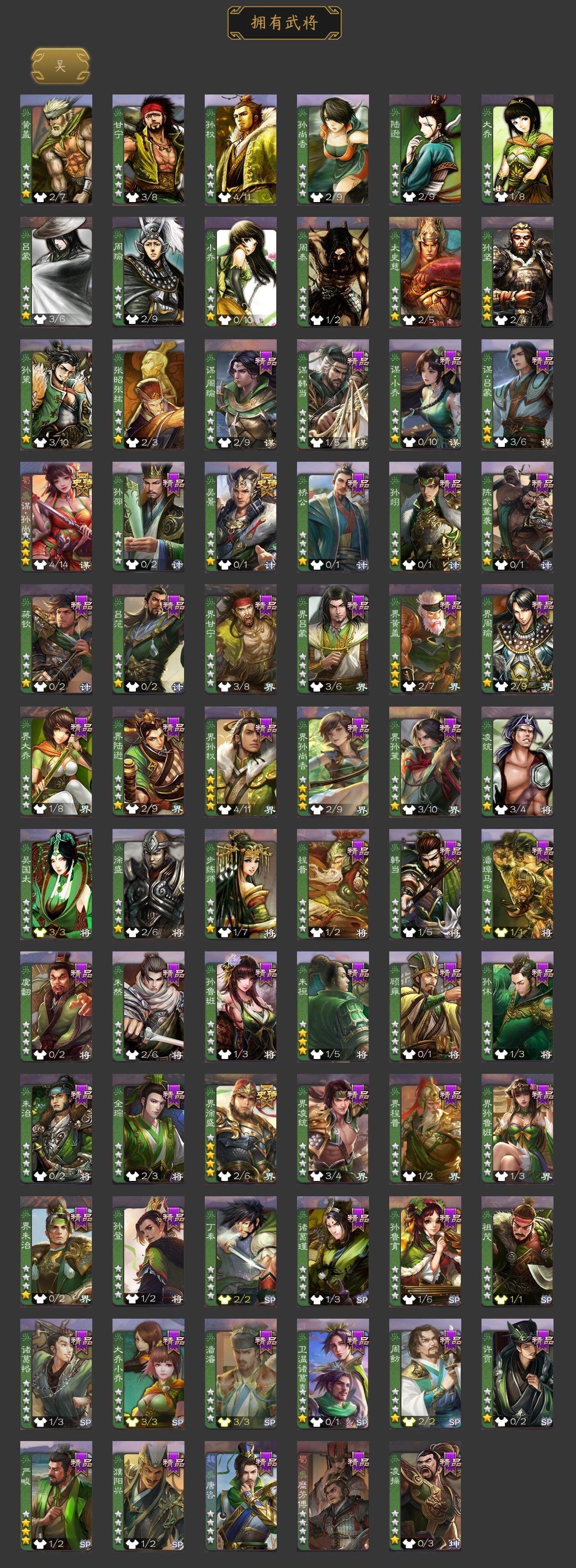 [15173112]【889】官阶:骠骑将军;vip等级:vip8;史诗武将数量:27;动态皮肤数量:26;武将总数:318;史诗宝珠数量:0;将魂数量:2382;神将:2;魏国史诗武将:8;蜀国史诗武将:10;吴国史诗武将:2;群史诗武将:6 神赵云神吕蒙杨修魏-司马昭司马师界钟会界曹真曹纯戏志才关索谋孙尚香谋马超诸葛瞻张星彩沙摩柯花鬘董允谋关羽吴景界徐盛十常侍左慈张让麹义公孙康许攸神郭嘉-虎年清明动态张昌蒲-龙年端午(动态)甄姬-明珠耀躯(动态)sp蔡文姬-兔年冬日动态司马昭-昭威淮南(动态)关羽-以身证道(动态)关索-依心缱绻动态马超-虎年冬至动态马超-星夜袭曹动态界马超-星夜袭曹动态张星彩-虎年端午动态李丰-太仓聚粟动态诸葛果-蛇年限定动态太史慈-涤荡江东动态周处-义除三害动态吕蒙-剑起惊澜动态孙权-永开吴祚动态周瑜-免年清明动态孙权-牛年七夕动态孙策-猪年七夕动态界孙权-牛年七夕动态界孙策-猪年七夕动态陆逊-蛇年清明动态麹义-扬刀立威动态吕布-鼠年七夕动态许攸-盛气凌人动态界吕布-鼠年七夕动态皇甫嵩-奋钺振旅动态