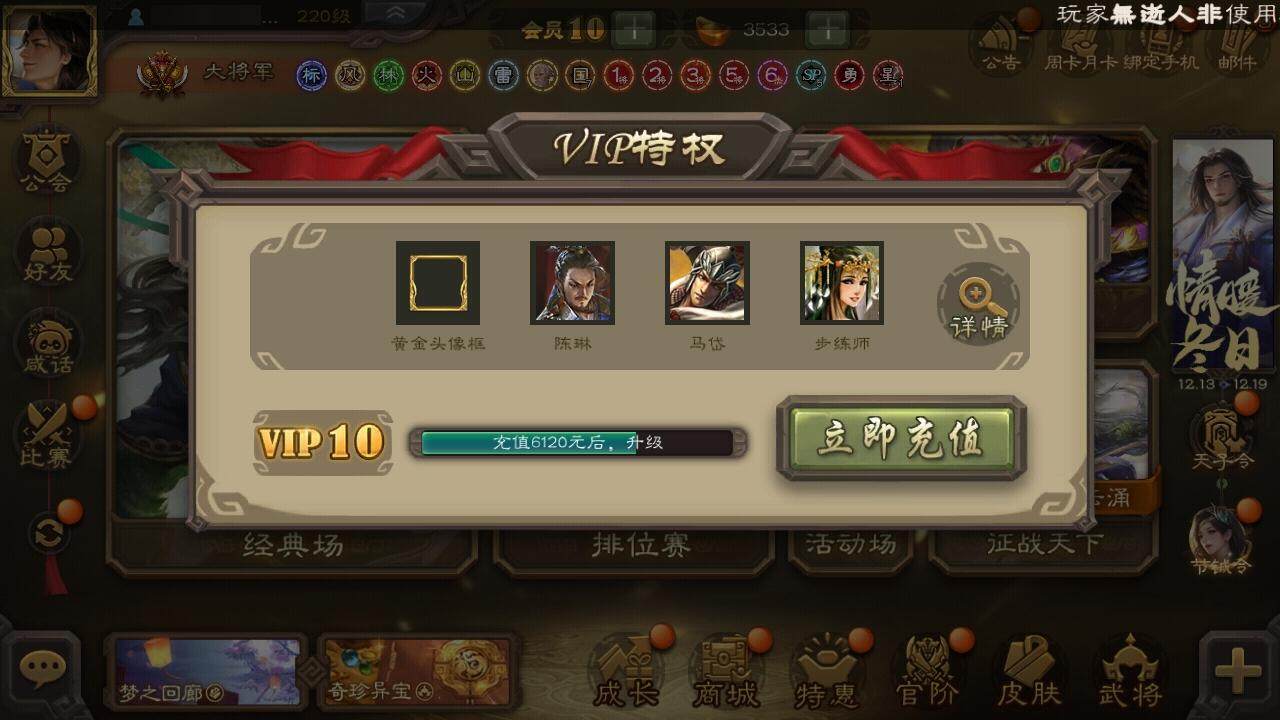 [15173731]【89】官阶:大将军;vip等级:vip10;史诗武将数量:48;动态皮肤数量:41;武将总数:429;史诗宝珠数量:0;将魂数量:7360;神将:11;魏国史诗武将:15;蜀国史诗武将:10;吴国史诗武将:6;群史诗武将:18 神吕布神赵云神陆逊神甘宁神张辽神太史慈神孙策神关羽神吕蒙神周瑜神诸葛亮星周不疑杨修文鸯王元姬司马师界钟会界于禁郝昭陈琳曹纯戏志才关索谋赵云谋马超诸葛瞻赵襄沙摩柯谯周界黄忠花鬘董允吴景骆统界朱然界徐盛界步练师贺齐谋郭嘉谋黄月英裴秀左慈张仲景张让星黄忠星甘宁苏飞麹义界左慈界李儒公孙康鲍信张绣李傕阎象许攸神张辽-威震江东神太史慈-勇撼日月动态神甘宁-万人辟易动态神关羽-佑子伐吴神吕蒙-兼资文武动态神周瑜-陵光引灵动态神诸葛亮-孟章诛邪动态神吕布-冠绝天下动态神赵云-战龙在野动态钟会-潜蛟觊天动态曹丕-气荡山河(动态)sp蔡文姬-兔年冬日动态曹丕-牛年清明动态界曹丕-牛年清明动态朱灵-以战破氐动态曹纯-虎年春节动态司马师-牛年中秋动态孟获-祸崇南疆动态刘备-龙御天下动态关羽-明良千古动态马超-牛年春节动态马超-星夜袭曹动态赵云-牛年春节动态黄月英-虎年中秋动态诸葛瞻-绵竹之殇动态界赵云-牛年春节动态界马超-牛年春节动态界马超-星夜袭曹动态关索-虎年七夕动态李丰-太仓聚粟动态诸葛果-蛇年限定动态周处-义除三害动态孙权-永开吴祚动态孙策-虎踞江东动态孙权-牛年七夕动态孙权-冠绝天下动态孙尚香-星流霆击动态周瑜-鼠年春节动态界周瑜-鼠年春节动态界孙权-牛年七夕动态界孙尚香-星流霆击动态徐盛-破军杀将动态孙鲁育-牛年端午动态文鸯-势若万钧动态许攸-火烧乌巢动态袁绍-声震寰宇动态麹义-扬刀立威动态吕布-鼠年七夕动态界吕布-鼠年七夕动态李儒-鸠杀少帝动态界李儒-鸠杀少帝动态张鲁-虎年冬至动态苏飞-肝胆相照动态张琪瑛-虎年冬至动态星甘宁-肝胆相