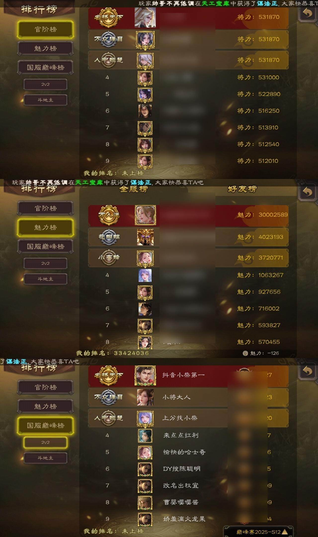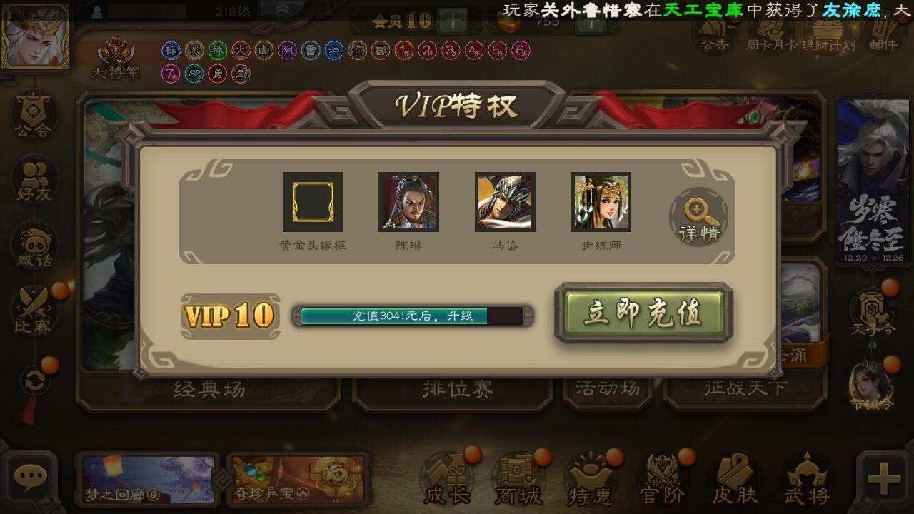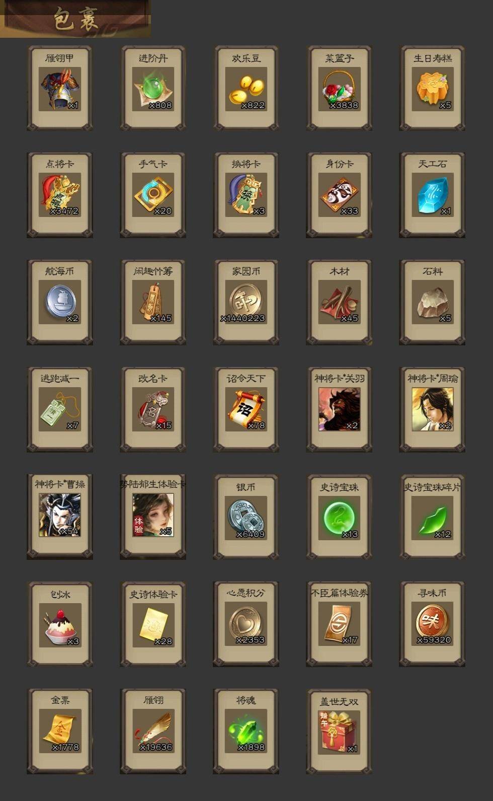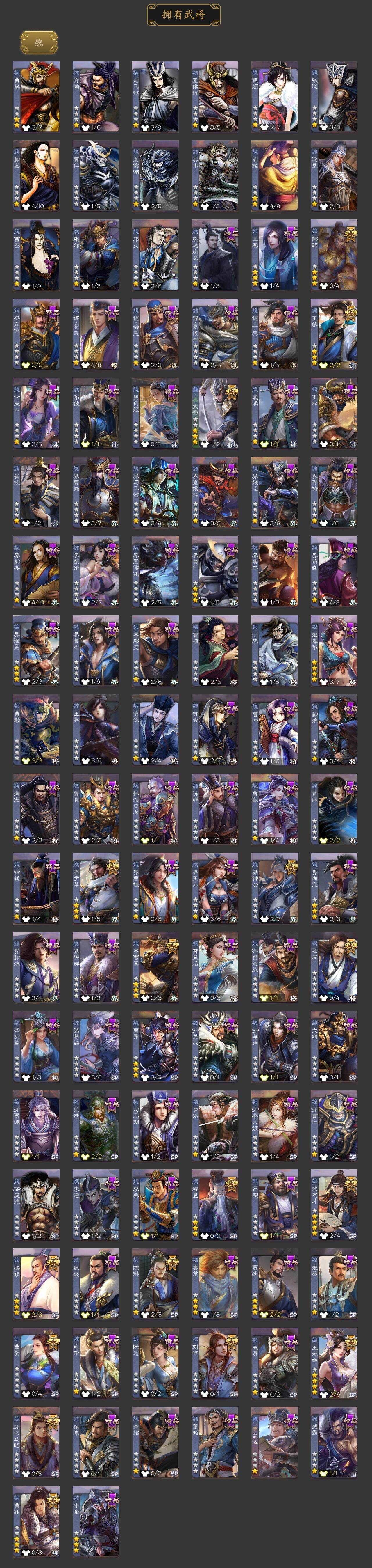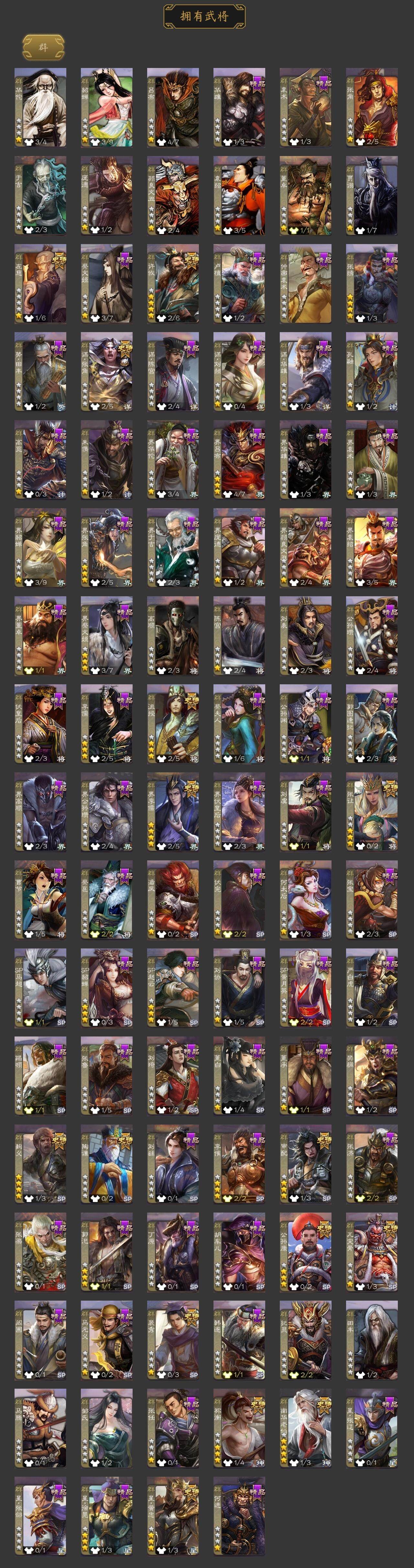 [15173838]【398】官阶:大将军;vip等级:vip10;史诗武将数量:52;动态皮肤数量:38;武将总数:413;史诗宝珠数量:13;将魂数量:1898;神将:7;魏国史诗武将:22;蜀国史诗武将:10;吴国史诗武将:8;群史诗武将:17 神赵云神张辽神太史慈神关羽神吕蒙神周瑜神诸葛亮sp司马昭王粲杨修文鸯王元姬界钟会界于禁界曹真嵇康郝昭陈琳曹婴曹纯戏志才刘晔马云騄谋马超诸葛瞻赵襄张星彩王平沙摩柯谯周界黄忠花鬘周处孙皓骆统留赞界朱然界徐盛界步练师贺齐谋荀彧裴秀左慈张让星黄忠陶谦审配麹义南华老仙祢衡沮授界李儒公孙康谋张角张绣李傕许攸神荀彧-虎年清明动态神吕蒙-兼资文武动态神赵云-战龙在野动态星周不疑-才广志宏动态荀彧-驱虎吞狼动态邓艾-神兵天降动态王粲-笔翰如流动态界邓艾-神兵天降动态张春华-牛年立冬动态张春华-宣穆夜袭动态戏志才-举棋若定动态杨修-鼠年端午动态王元姬-鼠年冬至动态羊徽瑜-牛年中秋动态刘备-龙御天下动态刘备-龙骧麟振动态刘备-明良千古动态关羽-明良千古动态马超-牛年春节动态黄月英-虎年中秋动态黄月英-明良千古动态诸葛亮-虎年中秋动态诸葛瞻-绵竹之殇动态界刘备-龙骧麟振动态界刘备-明良千古动态界马超-牛年春节动态界黄月英-明良千古动态夏侯氏-明良千古动态关银屏-兔年春节动态马云騄-明良千古动态关索-虎年七夕动态鲍三娘-虎年七夕动态胡金定-明良千古动态孙权-兔年中秋动态孙策-虎踞江东动态孙尚香-星流霆击动态孙策-长沙桓王动态界孙尚香-星流霆击动态界孙策-长沙恒王动态步练师-牛年七夕动态孙鲁班-牛年端午动态界步练师-牛年七夕动态刘赞-灵魂歌王动态文鸯-势若万钧动态袁绍-声震寰宇动态南华老仙-冠绝天下动态貂蝉-鼠年七夕动态吕布-鼠年七夕动态吕布-傲睨万物动态张角-黄天当立动态许攸-盛气凌人动态界吕布-鼠年七夕动态界貂蝉-鼠年七夕动态李儒-鸠杀