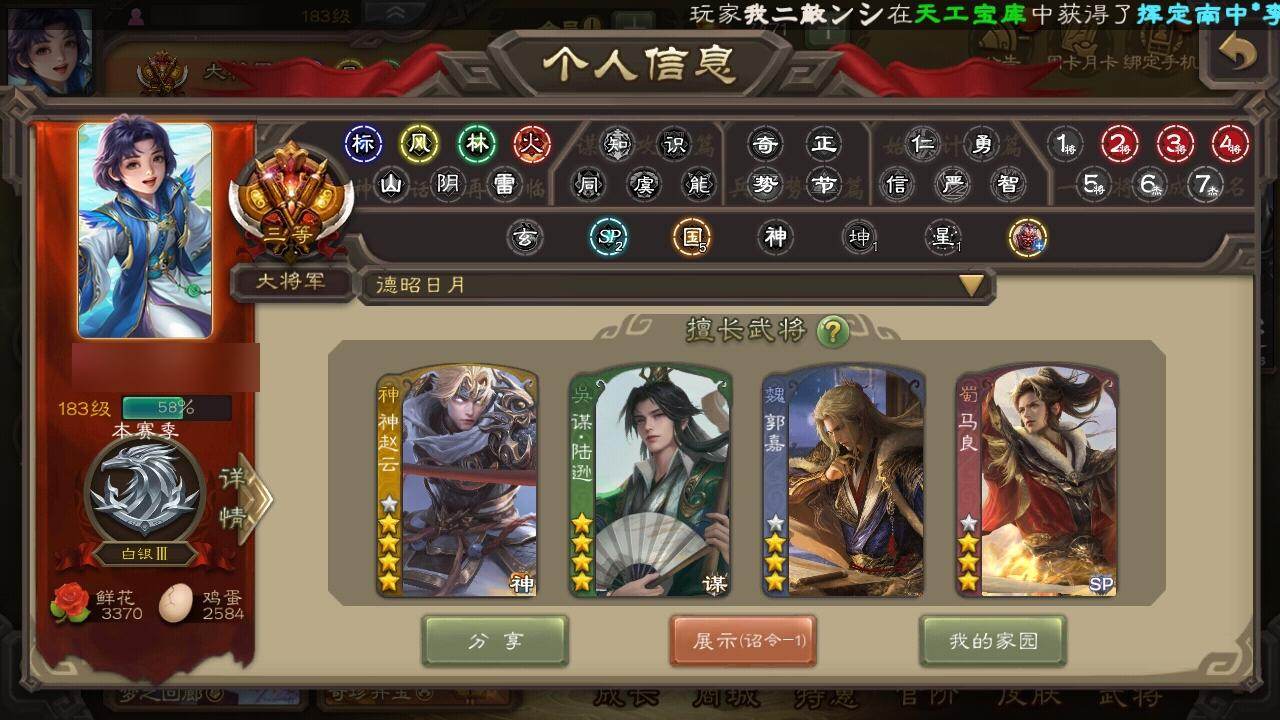 [15174244]【881】官阶:大将军;vip等级:vip9;史诗武将数量:38;动态皮肤数量:45;武将总数:361;史诗宝珠数量:11;将魂数量:3889;神将:6;魏国史诗武将:38;蜀国史诗武将:7;吴国史诗武将:6;群史诗武将:12 神吕布神赵云神陆逊神太史慈神吕蒙神周瑜星周不疑杨修文鸯魏-司马昭界钟会曹婴曹纯戏志才蒋干关索马云騄谋赵云张星彩沙摩柯谯周花鬘谋陆逊周处吴景界朱然界徐盛势陆郁生谋荀彧郑玄张让张琪瑛星黄忠麹义沮授界左慈界李儒谋张角李傕星董卓神郭嘉-虎年清明动态神太史慈-勇撼日月动态神孙策-霸王再世动态神赵云-鳞振九霄郭嘉-以身证道(动态)星周不疑-才广志宏动态张昌蒲-龙年端午(动态)钟会-龙年端午(动态)曹植-龙年中秋动态钟会-潜蛟觊天动态钟繇-安民护祚(动态)曹丕-气荡山河(动态)星周不疑-龙年清明动态甄姬-明珠耀躯(动态)sp蔡文姬-兔年冬日动态甄姬-牛年清明动态界甄姬-牛年清明动态曹昂-竭战麟伤动态戏志才-举棋若定动态曹婴-兔年春节动态司马昭-昭威淮南(动态)星徐晃-斧引霹雳动态清河公主-魅影萦心动态关羽-明良千古动态马超-虎年冬至动态sp孙尚香-明良千古动态马良-荡然由心动态诸葛果-蛇年限定动态周处-义除三害动态孙权-永开吴祚动态周瑜-免年清明动态徐盛-破军杀将动态孙鲁育-牛年端午动态孙寒华-蛇年限定动态鲁肃-蛇年端午动态陆逊-蛇年清明动态文鸯-势若万钧动态袁绍-声震寰宇动态左慈-道法显威(动态)麹义-扬刀立威动态李儒-鸠杀少帝动态界李儒-鸠杀少帝动态刘焉-雄踞益州动态sp赵云-威名尽显动态左慈-蛇年限定动态谋刘赪-冠绝天下动态