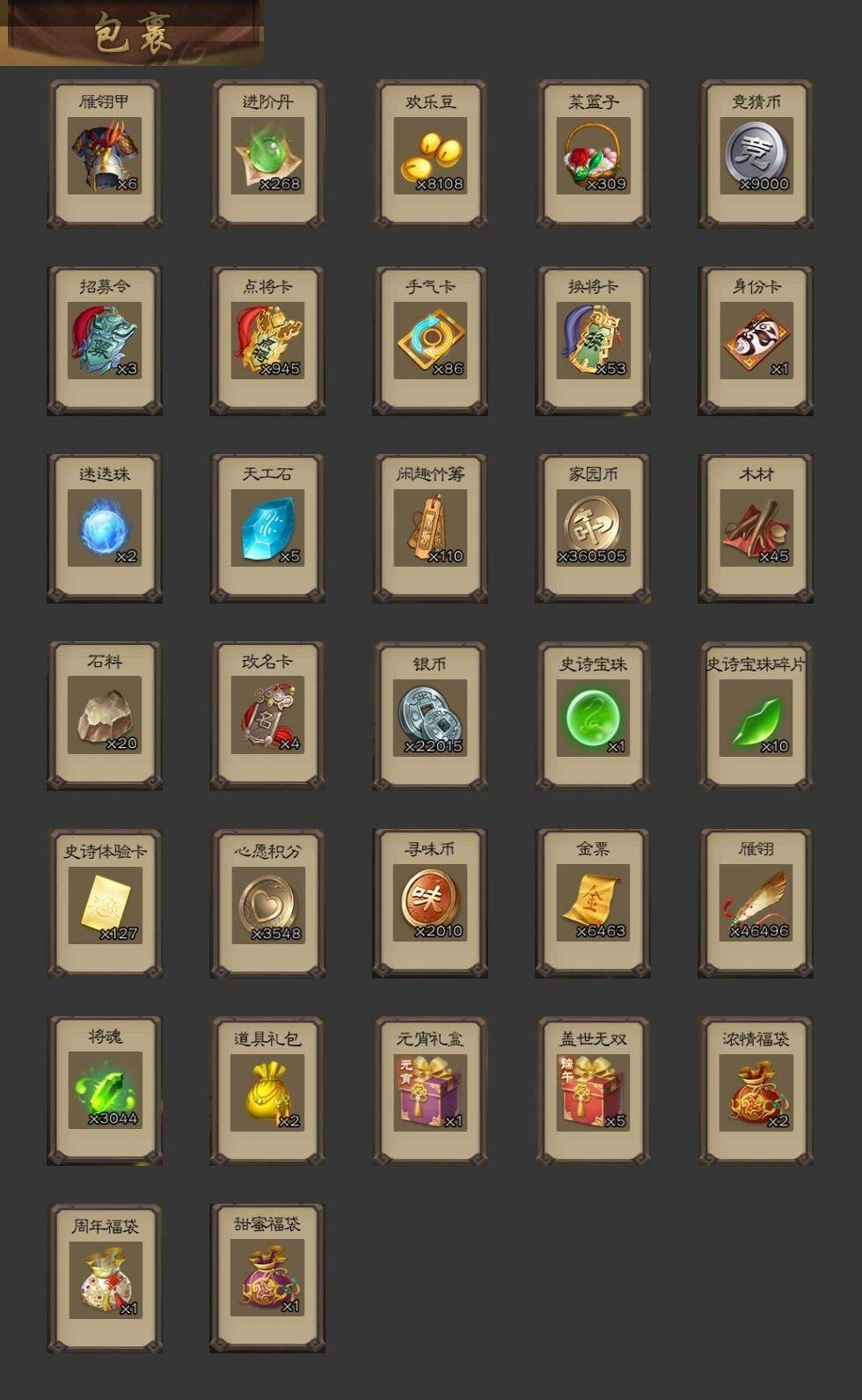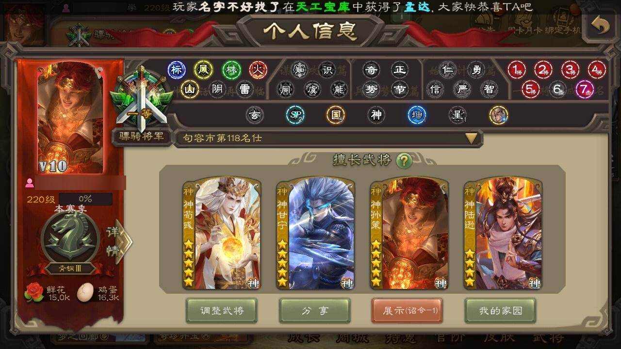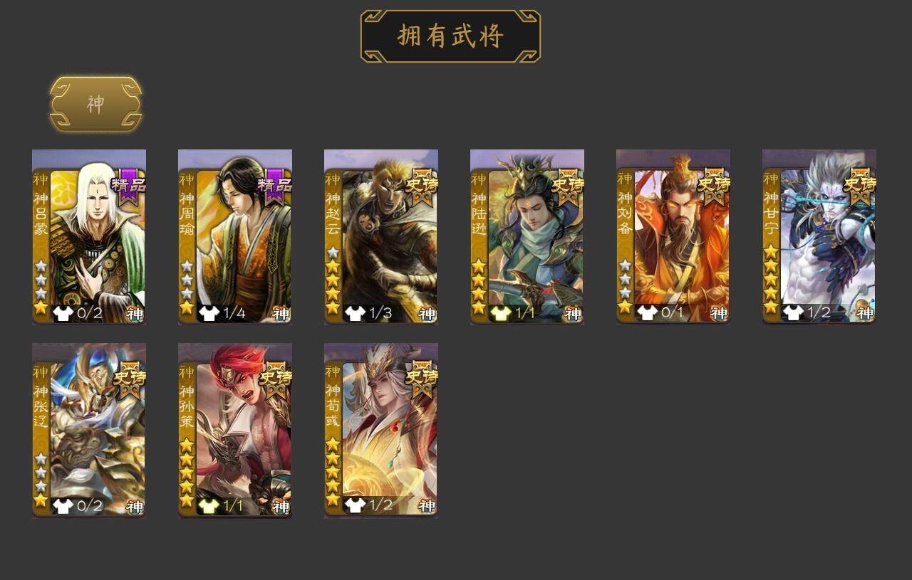[15174485]【358】官阶:骠骑将军;vip等级:vip10;史诗武将数量:28;动态皮肤数量:13;武将总数:330;史诗宝珠数量:1;将魂数量:3044;神将:9;魏国史诗武将:6;蜀国史诗武将:4;吴国史诗武将:3;群史诗武将:7 神赵云神陆逊神刘备神甘宁神张辽神孙策神荀彧神吕蒙神周瑜王粲杨修嵇康陈琳曹纯戏志才谋赵云张星彩沙摩柯花鬘骆统留赞界徐盛左慈星黄忠星甘宁南华老仙沮授张绣许攸神孙策-霸王再世动态神荀彧-虎年清明动态神甘宁-万人辟易动态神陆逊-绽焰摧枯动态神赵云-战龙在野动态星周不疑-才广志宏动态许褚-兔年端午动态曹婴-兔年春节动态关银屏-兔年春节动态李丰-太仓聚粟动态诸葛果-蛇年限定动态许攸-火烧乌巢动态吕布-虓虎之勇动态界吕布-虓虎之勇动态苏飞-肝胆相照动态星甘宁-肝胆相照动态