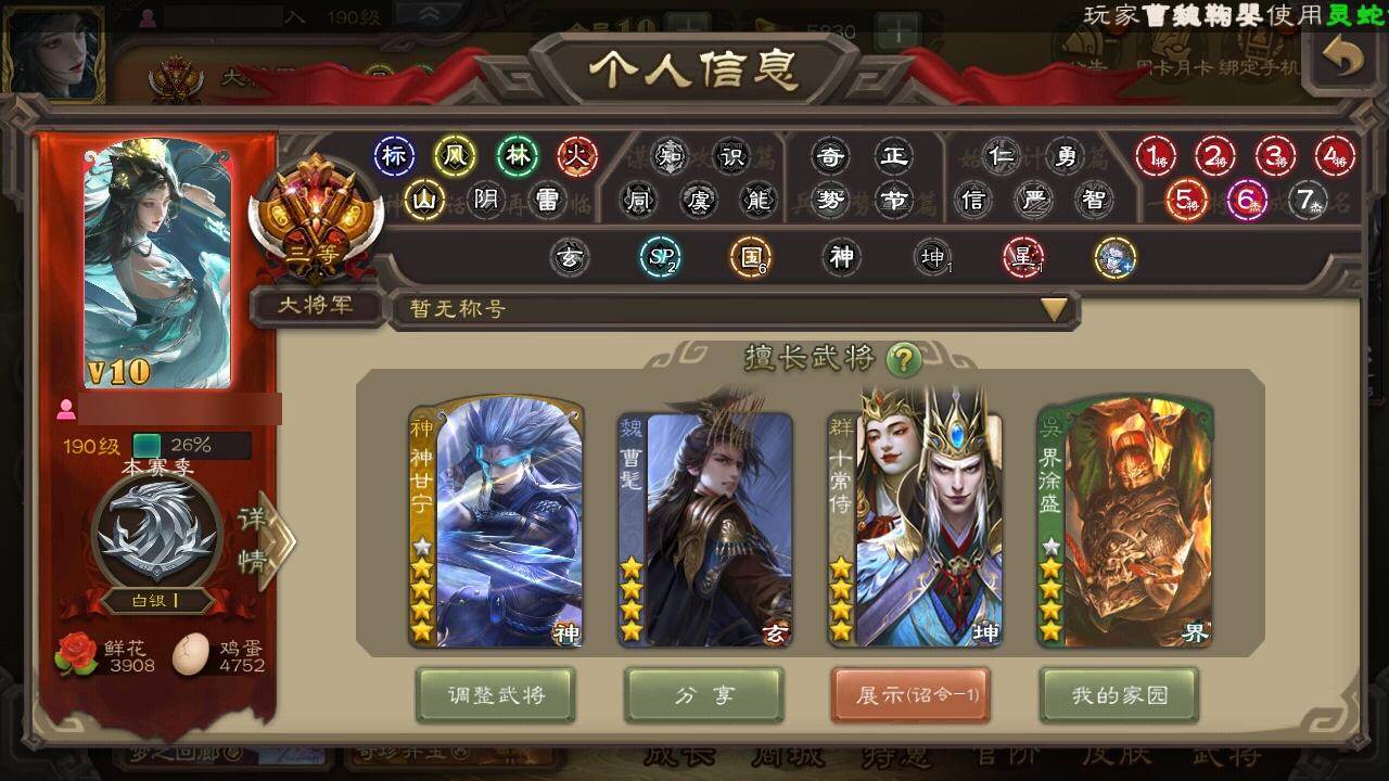 [15174645]【632】官阶:大将军;vip等级:vip10;史诗武将数量:34;动态皮肤数量:31;武将总数:360;史诗宝珠数量:26;将魂数量:3312;神将:6;魏国史诗武将:22;蜀国史诗武将:5;吴国史诗武将:2;群史诗武将:15 神吕布神赵云神甘宁神张辽神吕蒙神周瑜曹髦星周不疑魏-司马昭界钟会郝昭曹婴曹纯戏志才清河公主谋赵云赵襄沙摩柯谯周花鬘周处界徐盛谋荀彧十常侍裴秀左慈郑玄张让星黄忠麹义南华老仙沮授界李儒谋张角阎象友徐庶星董卓神鲁肃-九州为局神张辽-散敌擒孙神周瑜-波澜不惊神甘宁-万人辟易动态神赵云-神龙天降星周不疑-才广志宏动态张昌蒲-龙年端午(动态)钟会-龙年端午(动态)甄姬-明珠耀躯(动态)曹昂-竭战麟伤动态曹婴-兔年春节动态曹纯-虎年春节动态王元姬-鼠年冬至动态司马昭-昭威淮南(动态)星徐晃-斧引霹雳动态清河公主-魅影萦心动态诸葛亮-龙年限定动态卧龙诸葛-火烧博望动态周处-义除三害动态吕蒙-剑起惊澜动态孙寒华-威灵尽显动态孙权-冠绝天下动态孙尚香-兔年春节动态小乔-鼠年春分动态界小乔-鼠年春分动态徐盛-破军杀将动态孙寒华-蛇年限定动态鲁肃-蛇年端午动态陆逊-蛇年清明动态貂蝉-舞惑群心动态李儒-业火毒计动态麹义-扬刀立威动态杜预-龙吟破竹动态何太后-蛇蝎为心动态杨彪-忧心国事动态左慈-蛇年限定动态