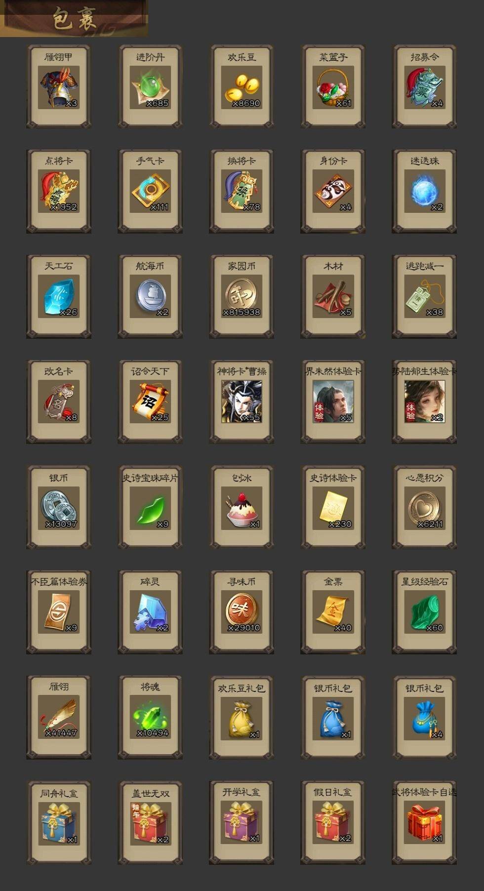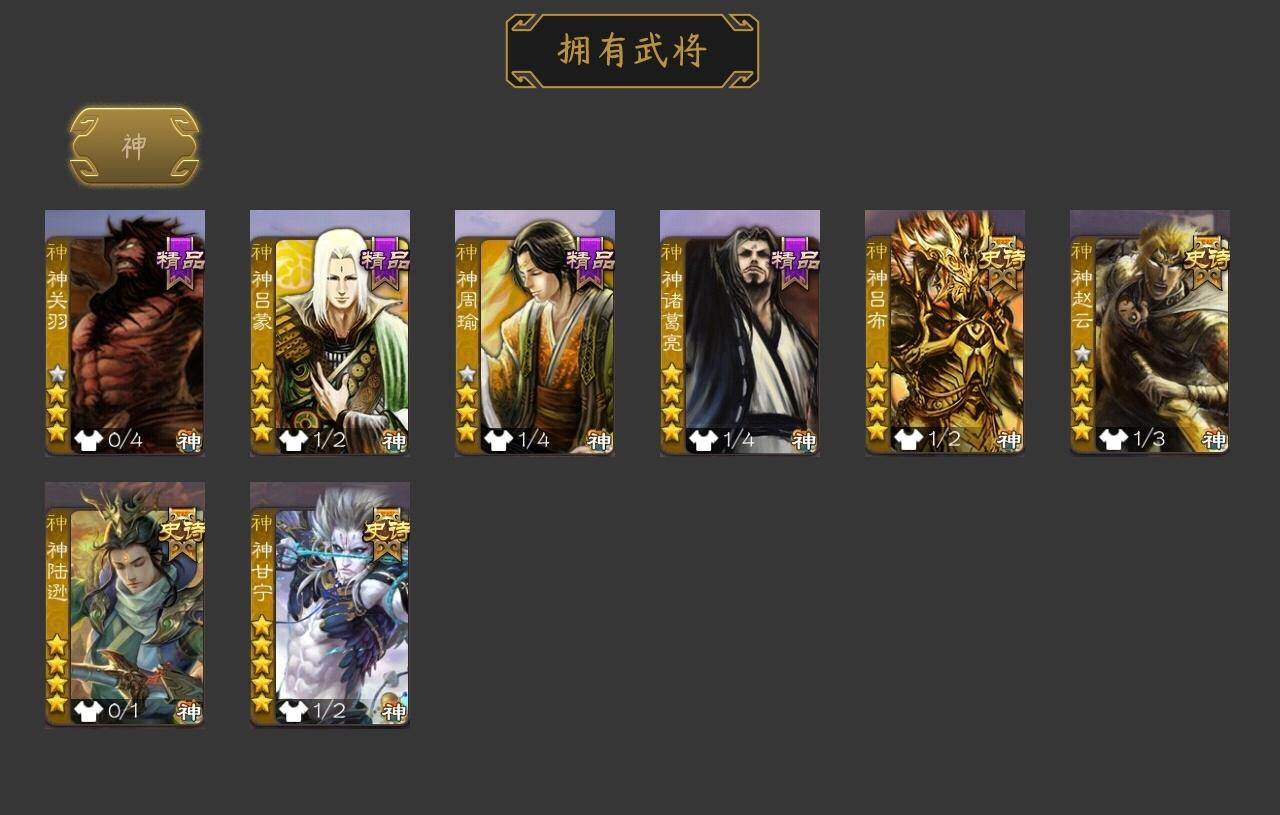 [15174698]【778】官阶:大将军;vip等级:vip14;史诗武将数量:52;动态皮肤数量:46;武将总数:394;史诗宝珠数量:0;将魂数量:10494;神将:8;魏国史诗武将:25;蜀国史诗武将:10;吴国史诗武将:6;群史诗武将:19 神吕布神赵云神陆逊神甘宁神关羽神吕蒙神周瑜神诸葛亮sp司马昭杨修马钧界钟会界于禁嵇康郝昭陈琳曹婴曹纯戏志才刘晔关索马云騄诸葛瞻赵襄张星彩王平沙摩柯界黄忠花鬘董允谋孙策吴景骆统留赞界徐盛贺齐左慈郑玄张让徐荣星黄忠星甘宁陶谦苏飞司马徽审配麹义庞德公祢衡沮授界左慈卑弥呼张绣李傕许攸神太史慈-勇撼日月动态神甘宁-万人辟易动态神吕蒙-兼资文武动态神诸葛亮-孟章诛邪动态神曹操-玄天通冥动态神吕布-监兵噬魅动态神赵云-战龙在野动态曹丕-猪年端午动态张郃-背水一战动态邓艾-神兵天降动态王基-独秉固志动态界曹丕-猪年端午动态界邓艾-神兵天降动态张春华-雪中舞刃动态钟会-谋谟之勋动态界钟会-谋谟之勋动态戏志才-举棋若定动态杨修-鼠年端午动态曹婴-锋芒毕露动态朱灵-以战破氐动态曹纯-长坂败备动态刘备-龙御天下动态卧龙诸葛-龙跃凤鸣动态法正-恩山怨海动态马超-牛年春节动态黄月英-鼠年春节动态诸葛亮-虎年中秋动态刘禅-猪年端午动态界马超-牛年春节动态界黄月英-鼠年春节动态界刘禅-猪年端午动态夏侯氏-猪年中秋动态sp孙尚香-猪年圣诞动态关银屏-鼠年中秋动态张星彩-猪年中秋动态赵襄-猪年春节动态关索-鼠年中秋动态鲍三娘-虎年七夕动态周处-义除三害动态孙权-永开吴祚动态孙权-猪年端午动态孙尚香-星流霆击动态大乔-猪年七夕动态孙策-猪年七夕动态小乔-猪年大雪动态小乔-如花似朵动态界大乔-猪年七夕动态界孙权-猪年端午动态界孙尚香-星流霆击动态界小乔-猪年大雪动态界小乔-如花似朵动态界孙策-猪年七夕动态朱然-剑舞枫飞动态徐氏-琪花瑶草动态孙鲁育-猪