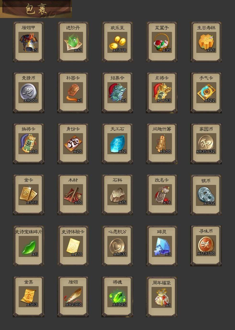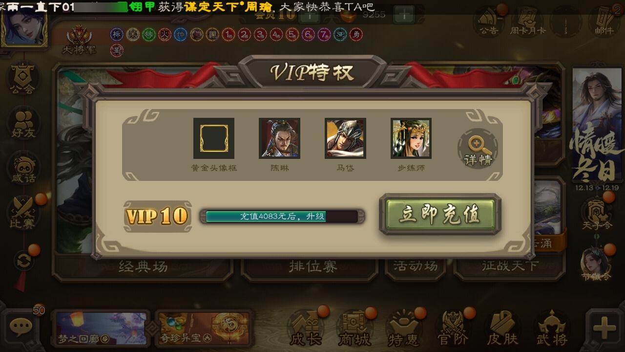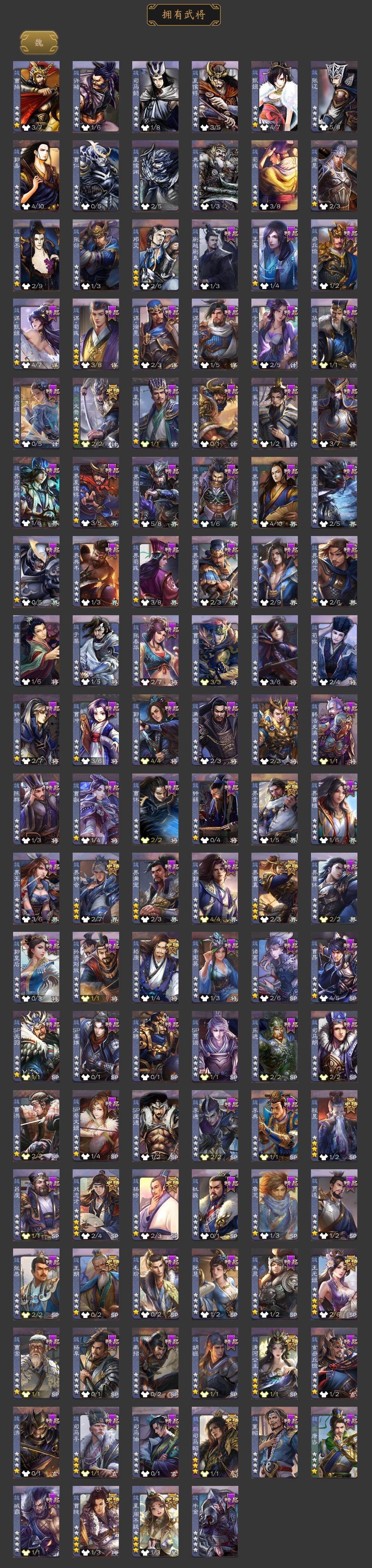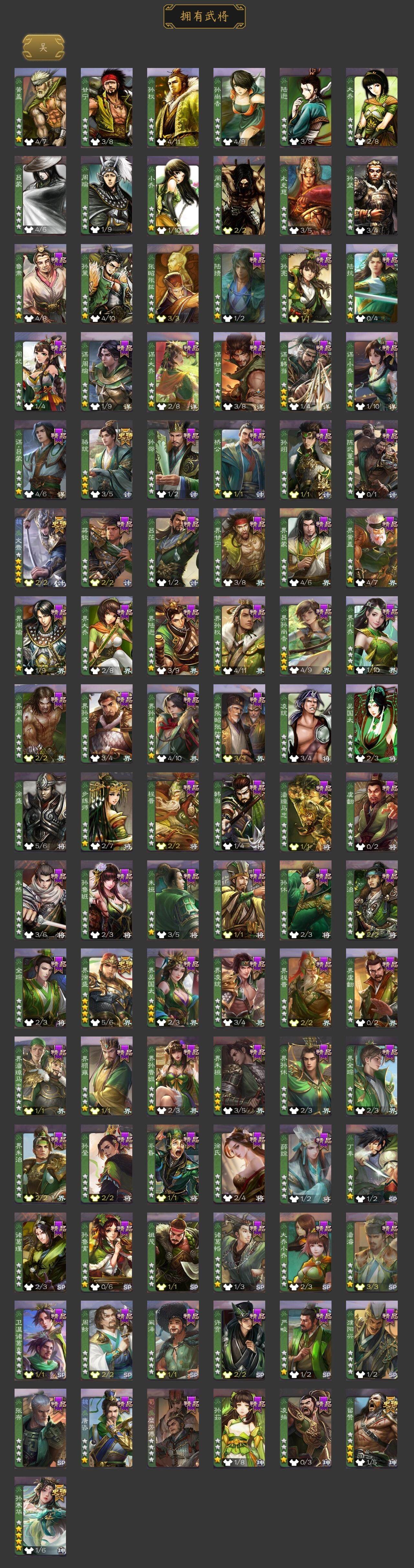 [15174767]【162】官阶:大将军;vip等级:vip10;史诗武将数量:44;动态皮肤数量:37;武将总数:420;史诗宝珠数量:0;将魂数量:6425;神将:6;魏国史诗武将:27;蜀国史诗武将:10;吴国史诗武将:4;群史诗武将:17 神吕布神赵云神甘宁神吕蒙神周瑜神诸葛亮星周不疑杨修文鸯王元姬王朗魏-司马昭界钟会界于禁界曹真嵇康曹纯戏志才清河公主关索谋赵云谋马超诸葛瞻赵襄沙摩柯谯周界黄忠花鬘董允孙寒华骆统留赞界徐盛谋荀彧左慈张让星黄忠麹义南华老仙祢衡沮授界李儒公孙康鲍信谋张角张绣李傕阎象许攸星董卓神甘宁-万人辟易动态星周不疑-才广志宏动态曹丕-气荡山河(动态)甄姬-明珠耀躯(动态)sp蔡文姬-兔年冬日动态张春华-雪中舞刃动态曹真-虎年春节动态曹昂-竭战麟伤动态程昱-泰山捧日动态戏志才-举棋若定动态朱灵-以战破氐动态曹纯-长坂败备动态司马昭-昭威淮南(动态)星徐晃-斧引霹雳动态清河公主-魅影萦心动态刘备-龙御天下动态诸葛果-蛇年限定动态太史慈-涤荡江东动态周处-义除三害动态吕蒙-剑起惊澜动态孙权-兔年中秋动态孙权-永开吴祚动态孙策-虎踞江东动态文鸯-破宇开天动态孙尚香-星流霆击动态界孙尚香-星流霆击动态徐盛-破军杀将动态鲁肃-蛇年端午动态文鸯-势若万钧动态袁绍-声震寰宇动态麹义-扬刀立威动态李儒-鸠杀少帝动态界李儒-鸠杀少帝动态sp貂蝉-驭魂千机动态皇甫嵩-奋钺振旅动态谋刘赪-冠绝天下动态