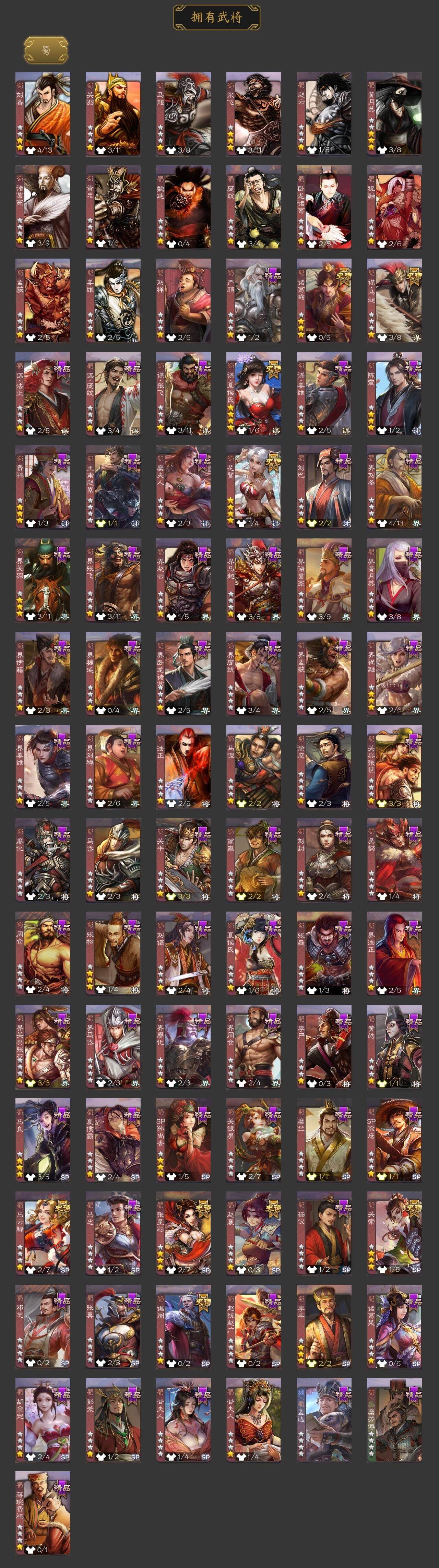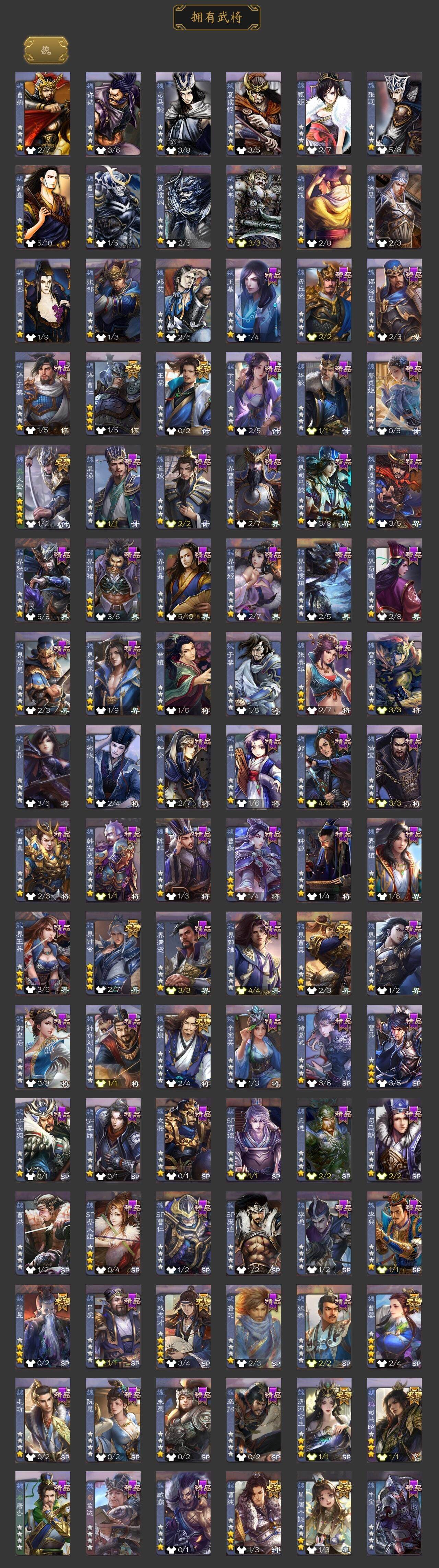 [15175387]【305】官阶:大将军;vip等级:vip9;史诗武将数量:41;动态皮肤数量:38;武将总数:366;史诗宝珠数量:22;将魂数量:4473;神将:7;魏国史诗武将:23;蜀国史诗武将:9;吴国史诗武将:5;群史诗武将:11 神吕布神赵云神刘备神张辽神吕蒙神周瑜神诸葛亮星周不疑谋曹仁王粲文鸯魏-司马昭界钟会界曹真嵇康曹婴曹纯戏志才清河公主关索马云騄谋夏侯氏谋马超诸葛瞻赵襄张星彩谯周花鬘周处吴景孙寒华骆统界徐盛左慈张让星黄忠麹义南华老仙界左慈杜预谋张角李傕阎象星董卓神荀彧-虎年清明动态神吕蒙-心生万象神诸葛亮-观星唤雨神曹操-天下归心神赵云-战龙在野动态星周不疑-才广志宏动态许褚-兔年端午动态荀彧-驱虎吞狼动态邓艾-神兵天降动态戏志才-举棋若定动态曹婴-兔年春节动态曹婴-锋芒毕露动态曹纯-虎年春节动态王元姬-鼠年冬至动态司马昭-昭威淮南(动态)星徐晃-斧引霹雳动态清河公主-魅影萦心动态花鬘-依心缱绻动态刘备-龙御天下动态马超-牛年春节动态黄月英-明良千古动态界马超-牛年春节动态界黄月英-明良千古动态夏侯氏-明良千古动态马云騄-牛年春节动态张星彩-猪年中秋动态关索-虎年七夕动态李丰-太仓聚粟动态卧龙诸葛-火烧博望动态孙策-兔年中秋动态吕蒙-剑起惊澜动态孙权-永开吴祚动态孙策-虎踞江东动态孙寒华-莲华熠熠动态孙寒华-威灵尽显动态大乔-猪年七夕动态界大乔-猪年七夕动态孙寒华-蛇年限定动态骆统-落笔生花动态文鸯-势若万钧动态灵雎-霜刃绚练动态袁绍-声震寰宇动态杜预-龙吟破竹动态貂蝉-绝世倾城动态吕布-傲睨万物动态界貂蝉-绝世倾城动态左慈-蛇年限定动态