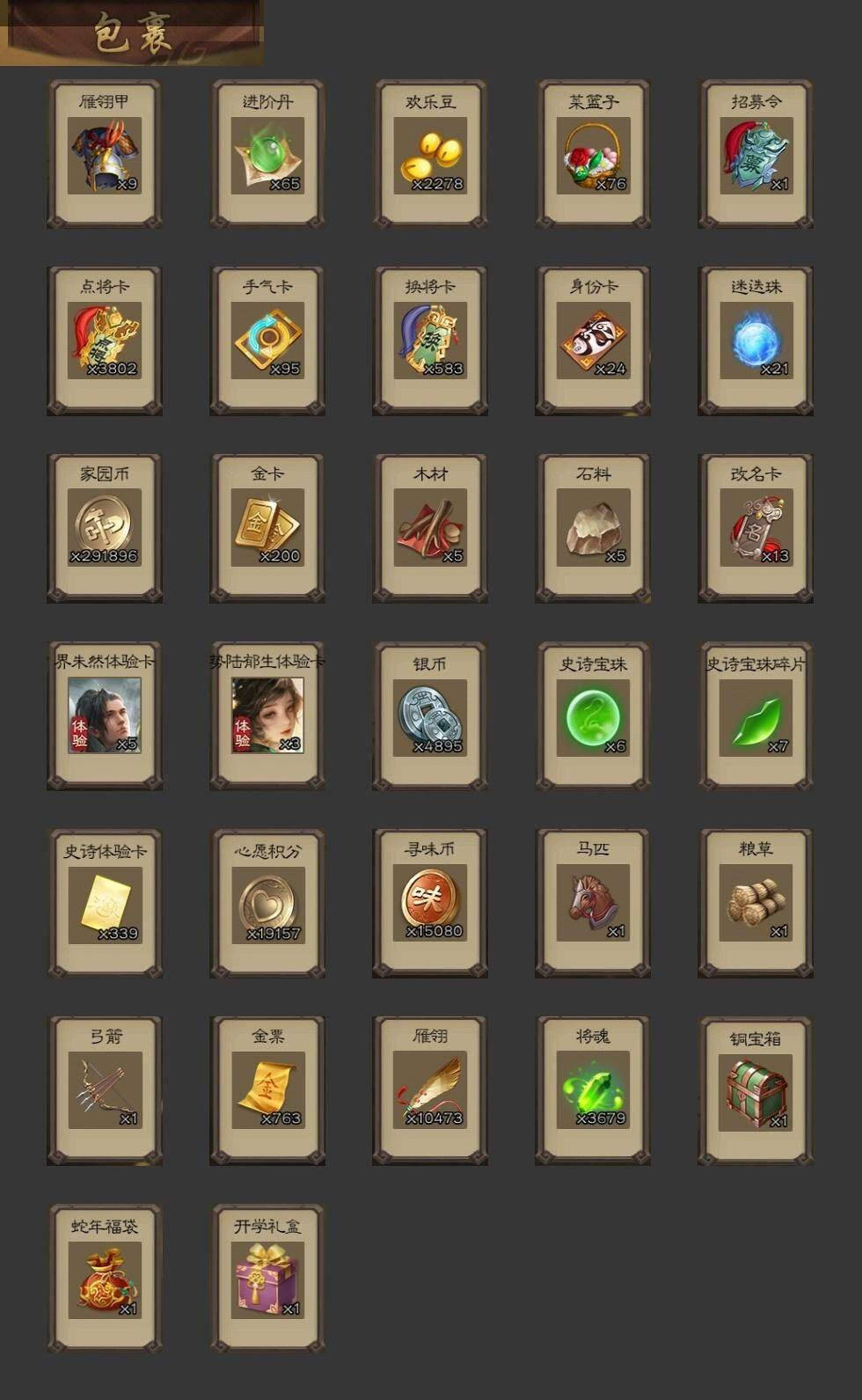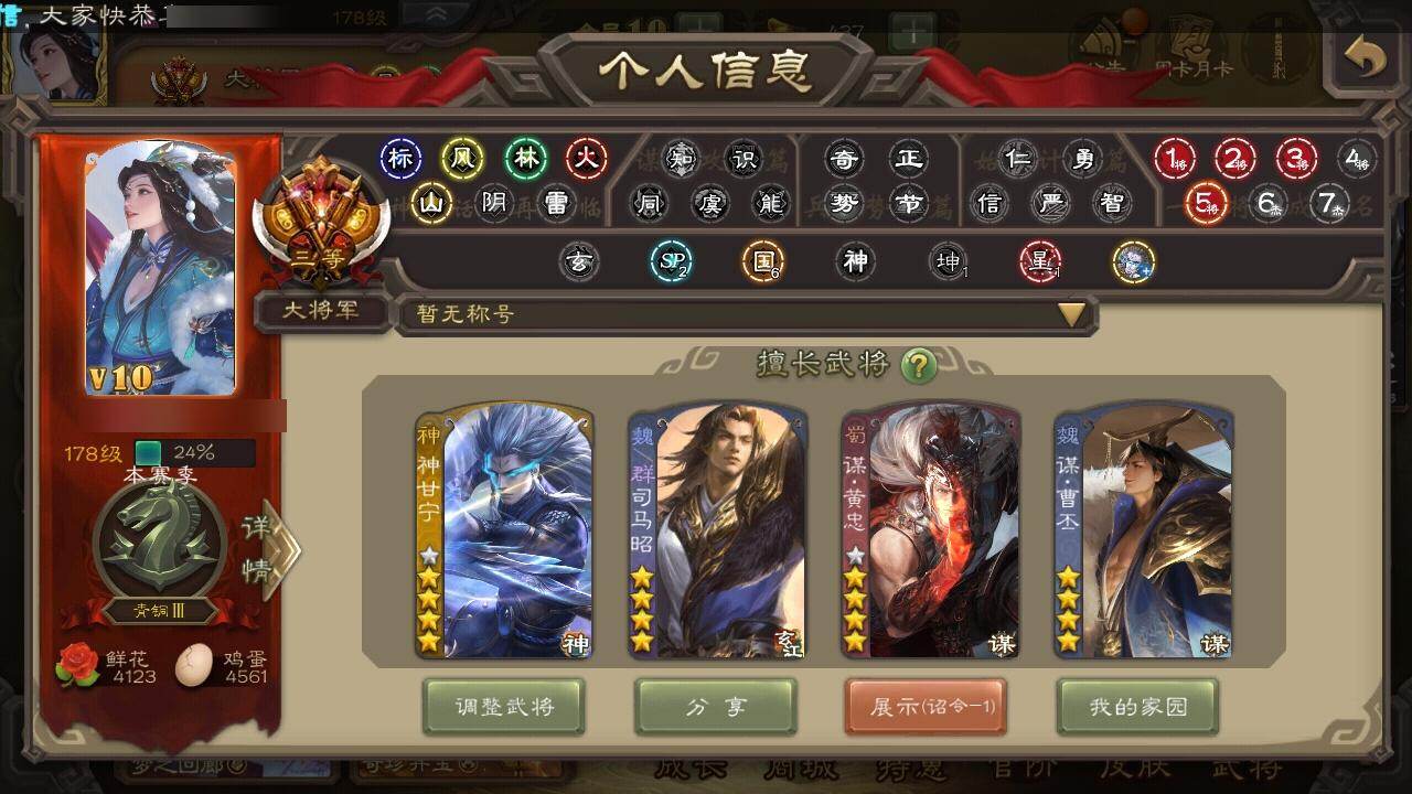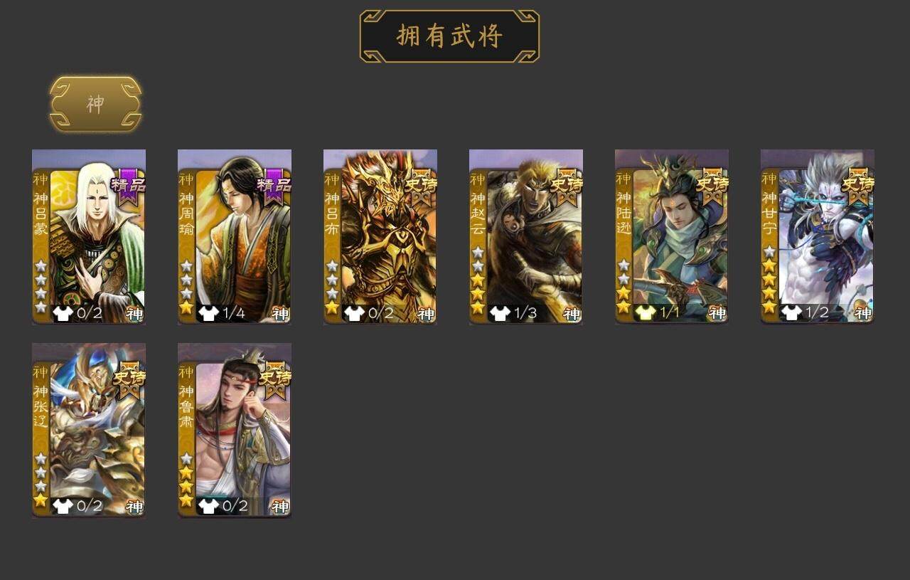 [15176356]【434】官阶:大将军;vip等级:vip10;史诗武将数量:35;动态皮肤数量:31;武将总数:327;史诗宝珠数量:6;将魂数量:3679;神将:8;魏国史诗武将:23;蜀国史诗武将:8;吴国史诗武将:3;群史诗武将:5 神吕布神赵云神陆逊神甘宁神张辽神吕蒙神周瑜神鲁肃曹髦星周不疑杨修王元姬魏-司马昭界钟会嵇康陈琳曹婴曹纯戏志才谋曹丕关索谋黄忠谋马超张星彩沙摩柯谯周花鬘董允留赞界徐盛势陆郁生左慈麹义界李儒谋张角李傕神甘宁-万人辟易动态神陆逊-绽焰摧枯动态神周瑜-陵光引灵动态神曹操-天下归心神赵云-神龙天降星周不疑-才广志宏动态曹植-龙年中秋动态曹丕-气荡山河(动态)甄姬-明珠耀躯(动态)曹丕-龙年中秋动态sp蔡文姬-兔年冬日动态邓艾-神兵天降动态曹婴-兔年春节动态曹纯-虎年春节动态王元姬-鼠年冬至动态司马昭-昭威淮南(动态)星徐晃-斧引霹雳动态花鬘-依心缱绻动态刘备-龙御天下动态黄忠-烈箭贯云动态)张星彩-临军对阵动态诸葛果-蛇年限定动态周处-义除三害动态吕蒙-剑起惊澜动态孙权-永开吴祚动态徐盛-破军杀将动态刘赞-灵魂歌王动态鲁肃-蛇年端午动态麹义-扬刀立威动态李儒-鸠杀少帝动态界李儒-鸠杀少帝动态sp赵云-威名尽显动态皇甫嵩-奋钺振旅动态陶谦-安民护祚动态