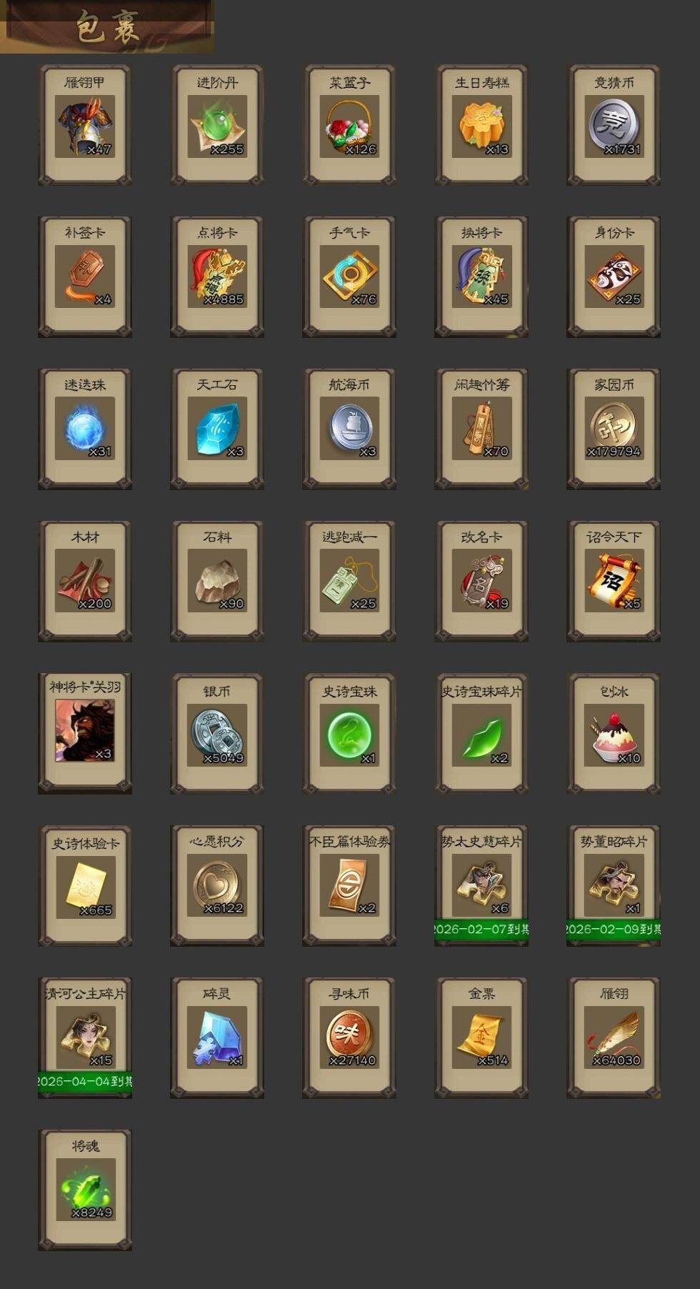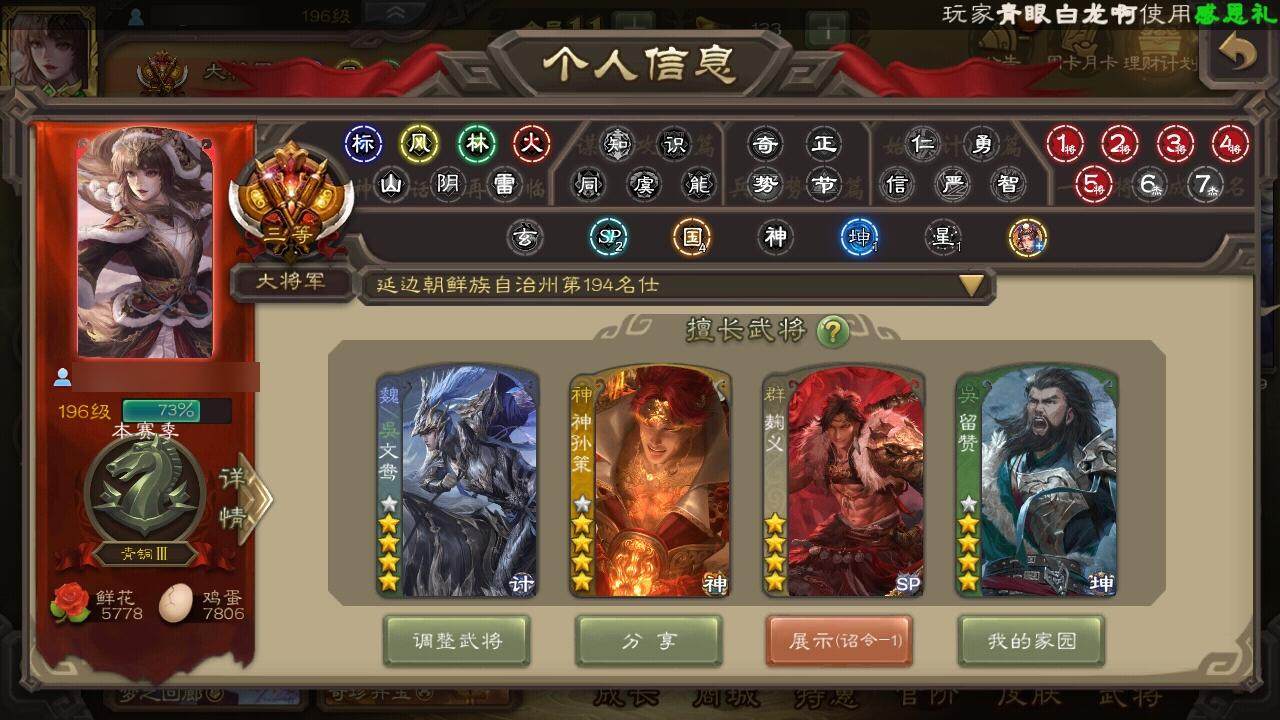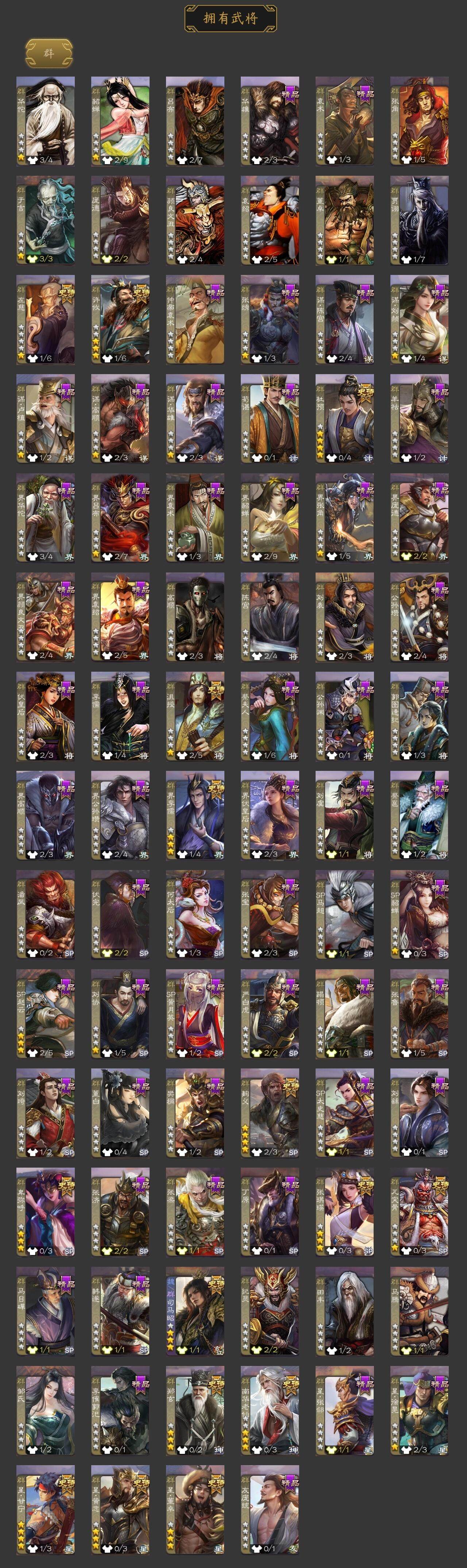 [15176939]【208】官阶:大将军;vip等级:vip11;史诗武将数量:47;动态皮肤数量:44;武将总数:350;史诗宝珠数量:1;将魂数量:8249;神将:7;魏国史诗武将:29;蜀国史诗武将:9;吴国史诗武将:8;群史诗武将:14 神吕布神赵云神太史慈神孙策神吕蒙神周瑜神诸葛亮王粲羊徽瑜文鸯王元姬魏-司马昭马钧界钟会界曹真陈琳曹纯戏志才马云騄谋夏侯氏谋赵云谋马超诸葛瞻赵襄沙摩柯谯周花鬘周处吴景孙寒华骆统留赞界朱然界徐盛界步练师左慈郑玄张琪瑛星黄忠星甘宁麹义南华老仙沮授界李儒杜预卑弥呼张绣许攸星董卓神郭嘉-虎年清明动态神太史慈-勇撼日月动态神孙策-霸王再世动态神荀彧-虎年清明动态神吕蒙-兼资文武动态神诸葛亮-观星唤雨神曹操-玄天通冥动态神赵云-战龙在野动态神司马懿-鉴往知来动态曹丕-气荡山河(动态)甄姬-明珠耀躯(动态)sp蔡文姬-兔年冬日动态荀彧-驱虎吞狼动态邓艾-神兵天降动态界邓艾-神兵天降动态张春华-雪中舞刃动态曹昂-竭战麟伤动态戏志才-举棋若定动态朱灵-以战破氐动态曹纯-虎年春节动态王元姬-鼠年冬至动态羊徽瑜-牛年中秋动态司马昭-昭威淮南(动态)星徐晃-斧引霹雳动态清河公主-魅影萦心动态刘备-龙御天下动态诸葛亮-龙年限定动态关羽-明良千古动态马超-牛年春节动态马超-明良千古动态马超-星夜袭曹动态诸葛亮-明良千古动态界马超-牛年春节动态界马超-星夜袭曹动态夏侯氏-明良千古动态sp孙尚香-明良千古动态马云騄-明良千古动态张星彩-虎年端午动态鲍三娘-虎年七夕动态诸葛果-蛇年限定动态太史慈-涤荡江东动态周处-义除三害动态孙权-永开吴祚动态周瑜-兔年七夕动态孙权-牛年七夕动态孙尚香-兔年春节动态孙尚香-星流霆击动态小乔-猪年大雪动态界孙权-牛年七夕动态界孙尚香-星流霆击动态孙鲁育-猪年春节动态孙鲁育-牛年端午动态刘赞-灵魂歌王动态文鸯-势若万钧动态麹义-扬刀立威动态许