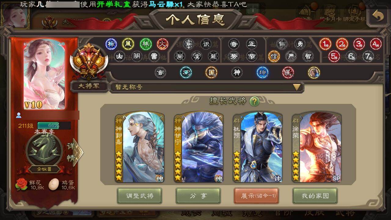 [15176953]【229】官阶:大将军;vip等级:vip10;史诗武将数量:45;动态皮肤数量:46;武将总数:377;史诗宝珠数量:0;将魂数量:8785;神将:7;魏国史诗武将:37;蜀国史诗武将:6;吴国史诗武将:7;群史诗武将:15 神吕布神赵云神甘宁神张辽神郭嘉神吕蒙神周瑜王粲杨修王凌魏-司马昭司马师界钟会界于禁曹纯戏志才清河公主关索马云騄谋赵云周群沙摩柯花鬘周处吴景骆统留赞界徐盛界步练师贺齐裴秀界沮授左慈张让徐荣陶谦苏飞审配麹义南华老仙沮授界李儒公孙康杜预星董卓神郭嘉-虎年清明动态神甘宁-万人辟易动态神赵云-神龙天降许褚-虎啸生风动态司马懿-牛年立冬动态张辽-登峰陷阵动态荀彧-驱虎吞狼动态曹丕-牛年清明动态界司马懿-牛年立冬动态界张辽-登峰陷阵动态界许褚-虎啸生风动态界曹丕-牛年清明动态钟会-谋谟之勋动态曹真-虎年春节动态界钟会-谋谟之勋动态戏志才-举棋若定动态朱灵-以战破氐动态曹纯-虎年春节动态曹纯-长坂败备动态司马昭-昭威淮南(动态)星徐晃-斧引霹雳动态清河公主-魅影萦心动态花鬘-依心缱绻动态刘备-龙骧麟振动态马超-牛年春节动态诸葛亮-明良千古动态界刘备-龙骧麟振动态界马超-牛年春节动态界诸葛亮-明良千古动态夏侯氏-明良千古动态关银屏-兔年春节动态关索-虎年七夕动态周处-义除三害动态黄盖-兔年端午动态周瑜-兔年七夕动态孙策-虎踞江东动态周瑜-免年清明动态黄盖-鏖战赤壁动态孙权-吴王六剑动态孙尚香-星流霆击动态小乔-鼠年春分动态界黄盖-鏖战赤壁动态界孙权-吴王六剑动态界孙尚香-星流霆击动态徐盛-破军杀将动态刘赞-灵魂歌王动态陆逊-蛇年清明动态骆统-落笔生花动态徐荣-横行四海动态麹义-扬刀立威动态杜预-龙吟破竹动态貂蝉-绝世倾城动态吕布-虓虎之勇动态张角-迅雷风烈动态袁绍-一往无前动态界吕布-虓虎之勇动态界貂蝉-绝世倾城动态界张角-迅雷风烈动态