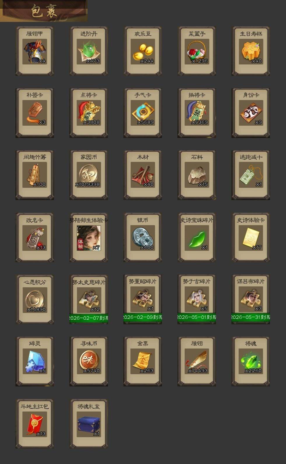 [15177648]【469】官阶:骠骑将军;vip等级:vip10;史诗武将数量:40;动态皮肤数量:20;武将总数:322;史诗宝珠数量:0;将魂数量:2260;神将:8;魏国史诗武将:14;蜀国史诗武将:8;吴国史诗武将:5;群史诗武将:14 神吕布神赵云神陆逊神张辽神郭嘉神吕蒙神周瑜神诸葛亮曹髦王元姬魏-司马昭界钟会界曹真曹纯戏志才刘晔马云騄谋赵云诸葛瞻沙摩柯谯周傅佥界黄忠谋关羽吴景骆统留赞界朱然界徐盛左慈张让徐荣星黄忠麹义刘焉界李儒公孙康卑弥呼谋张角张绣许攸友徐庶星董卓神司马懿-鉴往知来动态郭嘉-以身证道(动态)星周不疑-才广志宏动态甄姬-明珠耀躯(动态)曹丕-猪年端午动态界曹丕-猪年端午动态司马昭-昭威淮南(动态)星徐晃-斧引霹雳动态费祎-安民护祚(动态)关索-虎年七夕动态太史慈-涤荡江东动态周处-义除三害动态吕蒙-剑起惊澜动态黄盖-兔年端午动态徐盛-破军杀将动态刘赞-灵魂歌王动态鲁肃-蛇年端午动态麹义-扬刀立威动态刘焉-雄踞益州动态杨彪-忧心国事动态