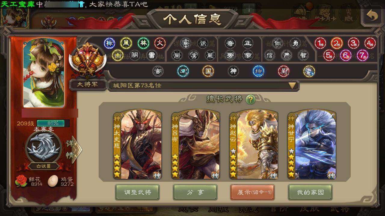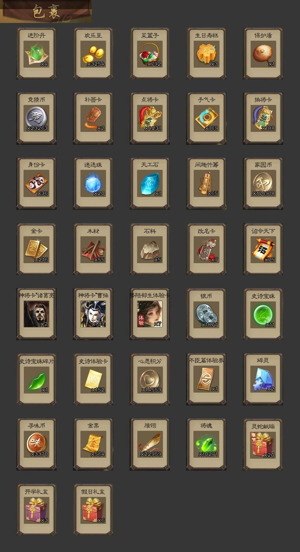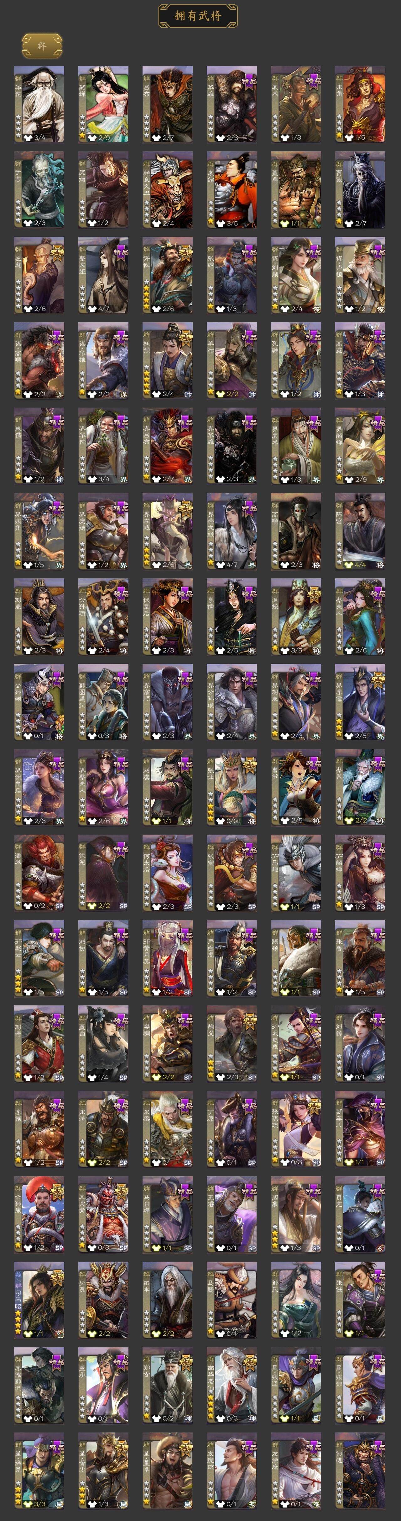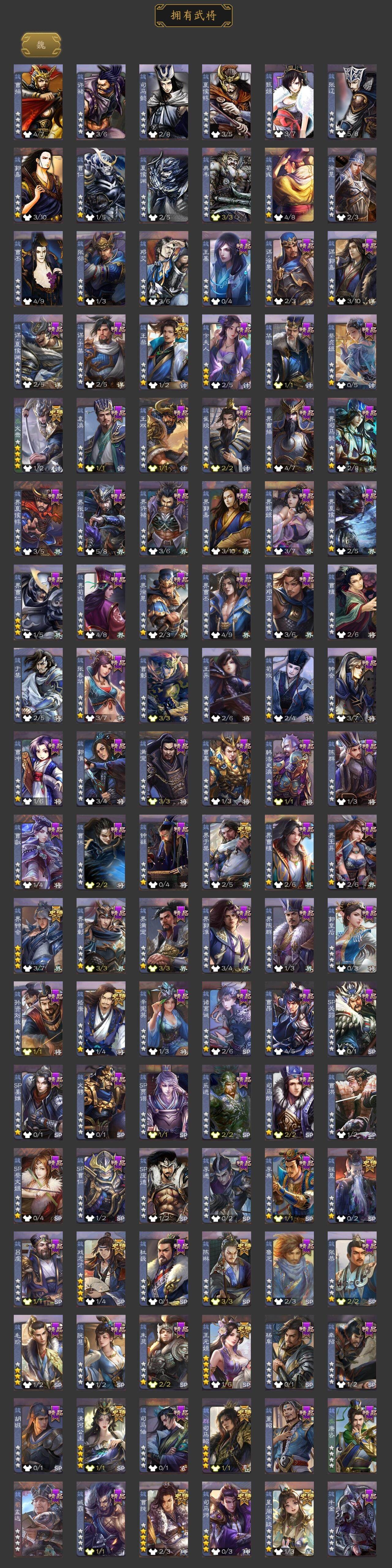 [15178199]【554】官阶:大将军;vip等级:vip10;史诗武将数量:52;动态皮肤数量:45;武将总数:405;史诗宝珠数量:11;将魂数量:10271;神将:8;魏国史诗武将:32;蜀国史诗武将:10;吴国史诗武将:7;群史诗武将:19 神吕布神赵云神陆逊神甘宁神张辽神太史慈神吕蒙神周瑜星周不疑王粲文鸯王元姬魏-司马昭司马师界钟会界于禁嵇康陈琳曹纯戏志才清河公主关索谋赵云谋马超诸葛瞻周群张星彩王平沙摩柯花鬘董允孙寒华骆统留赞界朱然界徐盛界步练师势陆郁生谋郭嘉左慈郑玄张让张琪瑛星黄忠麹义南华老仙沮授界左慈界李儒公孙康杜预张绣李傕阎象许攸友徐庶星董卓神鲁肃-九州为局神太史慈-勇撼日月动态神甘宁-万人辟易动态神吕布-冠绝天下动态神赵云-战龙在野动态郭嘉-以身证道(动态)星周不疑-才广志宏动态曹丕-气荡山河(动态)甄姬-明珠耀躯(动态)曹丕-龙年中秋动态许褚-兔年端午动态邓艾-神兵天降动态界邓艾-神兵天降动态张春华-宣穆夜袭动态钟会-谋谟之勋动态界钟会-谋谟之勋动态曹昂-竭战麟伤动态朱灵-以战破氐动态曹纯-虎年春节动态王元姬-鼠年冬至动态司马昭-昭威淮南(动态)星徐晃-斧引霹雳动态清河公主-魅影萦心动态刘备-龙御天下动态诸葛亮-龙年限定动态关羽-明良千古动态马超-牛年春节动态界马超-牛年春节动态sp孙尚香-明良千古动态胡金定-明良千古动态孙茹-龙年七夕动态周处-义除三害动态孙寒华-莲华熠熠动态孙寒华-威灵尽显动态周瑜-免年清明动态徐氏-琪花瑶草动态孙鲁育-牛年端午动态孙茹-烟水悠悠动态刘赞-灵魂歌王动态孙寒华-蛇年限定动态陆逊-蛇年清明动态文鸯-势若万钧动态曹节-龙年中秋动态蔡夫人-计上心来动态袁绍-声震寰宇动态麹义-扬刀立威动态杜预-龙吟破竹动态许攸-盛气凌人动态卑弥呼-鬼渊蝶引动态杨彪-忧心国事动态