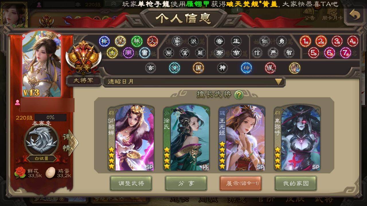 [15178237]【809】官阶:大将军;vip等级:vip13;史诗武将数量:62;动态皮肤数量:49;武将总数:428;史诗宝珠数量:0;将魂数量:0;神将:11;魏国史诗武将:23;蜀国史诗武将:12;吴国史诗武将:8;群史诗武将:19 神吕布神赵云神陆逊神刘备神甘宁神张辽神荀彧神关羽神吕蒙神周瑜神诸葛亮sp司马昭王粲杨修王元姬马钧界钟会界于禁界曹真嵇康郝昭陈琳曹婴曹纯戏志才刘晔关索马云騄谋夏侯氏谋赵云谋马超诸葛瞻赵襄张星彩王平沙摩柯界黄忠董允孙皓骆统留赞界朱然界徐盛界步练师贺齐势陆郁生左慈张让徐荣星黄忠王允陶谦苏飞司马徽审配麹义南华老仙祢衡沮授界左慈卑弥呼张绣李傕许攸势于吉神荀彧-虎年清明动态神甘宁-万人辟易动态神陆逊-绽焰摧枯动态神周瑜-陵光引灵动态神周瑜-焰腾麒麟动态神吕布-监兵噬魅动态神赵云-战龙在野动态曹植-龙年中秋动态星周不疑-龙年清明动态曹冲-五陵英少动态甄姬-牛年清明动态界甄姬-牛年清明动态界曹植-鼠年端午动态辛宪英-鼠年春节动态程昱-泰山捧日动态戏志才-举棋若定动态曹婴-锋芒毕露动态朱灵-以战破氐动态王元姬-鼠年冬至动态花鬘-依心缱绻动态卧龙诸葛-龙跃凤鸣动态费祎-安民护祚(动态)关索-依心缱绻动态刘备-猪年圣诞动态刘备-龙骧麟振动态赵云-牛年春节动态黄月英-虎年中秋动态魏延-麒麟生角动态界刘备-猪年圣诞动态界刘备-龙骧麟振动态界赵云-牛年春节动态界魏延-麒麟生角动态sp孙尚香-猪年圣诞动态马云騄-牛年春节动态赵襄-猪年春节动态孙权-猪年端午动态陆逊-猪年圣诞动态大乔-鼠年春分动态周瑜-鼠年春节动态界周瑜-鼠年春节动态界大乔-鼠年春分动态界陆逊-猪年圣诞动态界孙权-猪年端午动态步练师-牛年七夕动态孙鲁班-牛年端午动态界步练师-牛年七夕动态徐氏-琪花瑶草动态刘赞-抗音而歌动态貂蝉-舞惑群心动态左慈-役使鬼神动态许攸-盛气凌人动态sp貂蝉