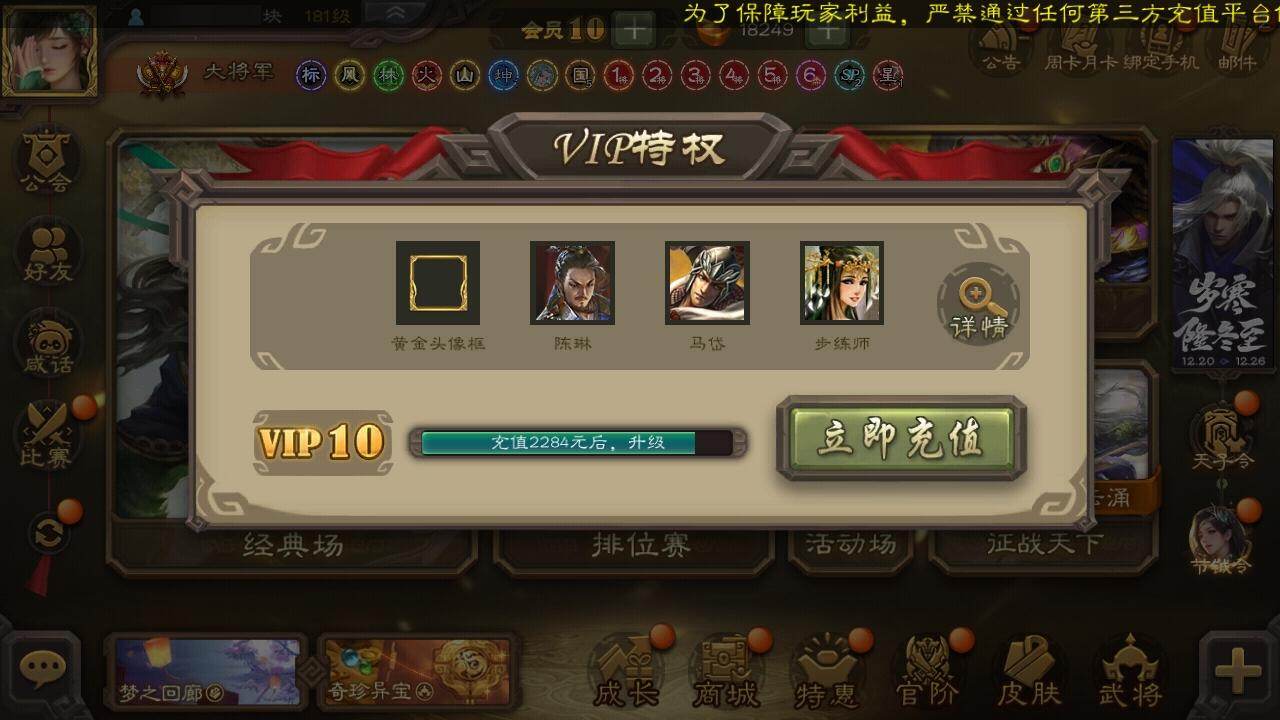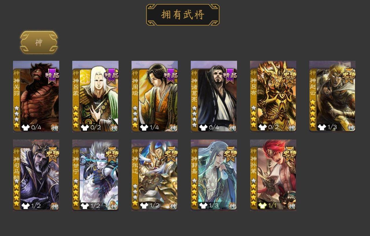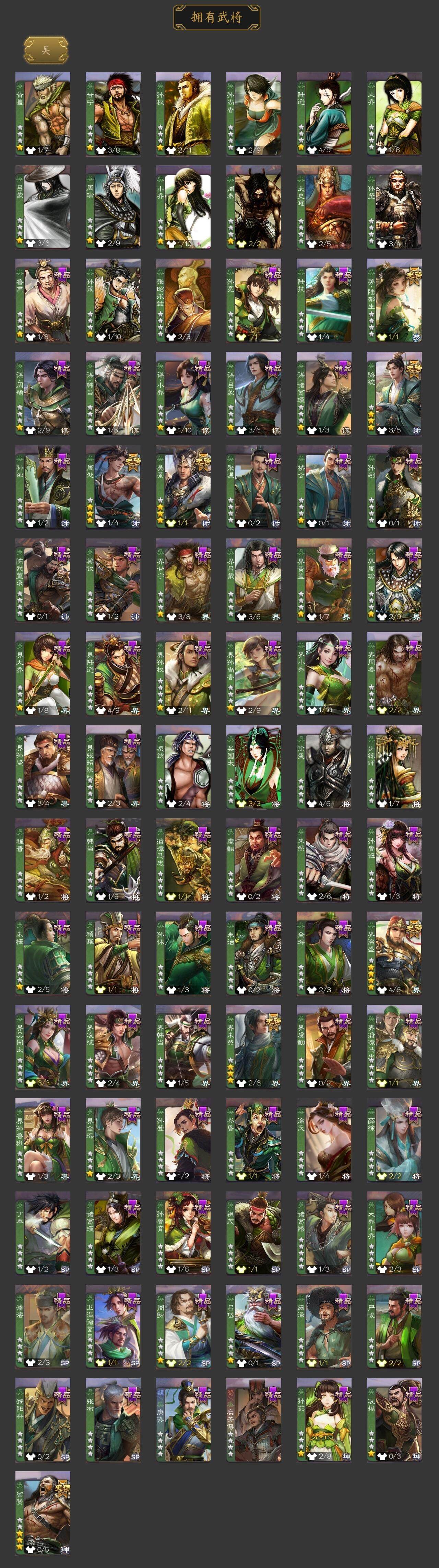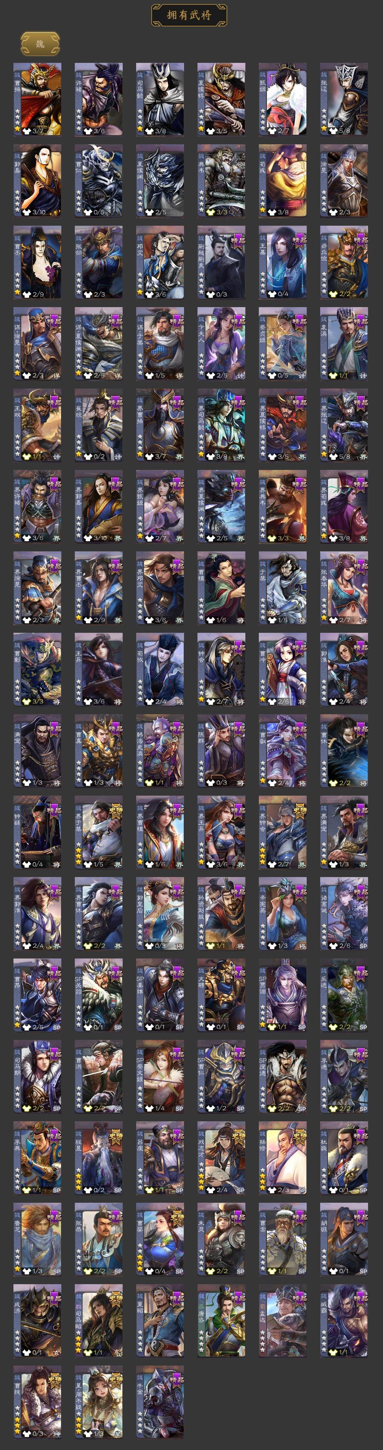 [15178468]【124】官阶:大将军;vip等级:vip10;史诗武将数量:49;动态皮肤数量:40;武将总数:400;史诗宝珠数量:9;将魂数量:8407;神将:11;魏国史诗武将:33;蜀国史诗武将:11;吴国史诗武将:7;群史诗武将:18 神吕布神赵云神司马懿神甘宁神张辽神郭嘉神孙策神关羽神吕蒙神周瑜神诸葛亮星周不疑杨修魏-司马昭界钟会界于禁曹婴曹纯戏志才谋诸葛亮马云騄谋赵云谋马超诸葛瞻周群张星彩王平沙摩柯花鬘谋关羽周处吴景骆统留赞界朱然界徐盛势陆郁生裴秀左慈张让星黄忠司马徽麹义南华老仙祢衡沮授界左慈界李儒公孙康张绣李傕阎象许攸友徐庶星董卓神郭嘉-虎年清明动态神太史慈-勇撼日月动态神孙策-霸王再世动态神张辽-散敌擒孙神甘宁-万人辟易动态神赵云-战龙在野动态神司马懿-鉴往知来动态星周不疑-才广志宏动态曹丕-气荡山河(动态)甄姬-明珠耀躯(动态)sp蔡文姬-兔年冬日动态许褚-虎啸生风动态司马懿-牛年立冬动态界司马懿-牛年立冬动态界许褚-虎啸生风动态张春华-牛年立冬动态钟会-谋谟之勋动态界钟会-谋谟之勋动态戏志才-举棋若定动态朱灵-以战破氐动态司马昭-昭威淮南(动态)张辽-龙生九子(动态)星徐晃-斧引霹雳动态清河公主-魅影萦心动态刘备-龙御天下动态诸葛亮-龙年限定动态关羽-明良千古动态马云騄-牛年春节动态鲍三娘-柳娇桃艳动态甘夫人-为君担忧动态卧龙诸葛-火烧博望动态孙茹-龙年七夕动态周处-义除三害动态孙权-永开吴祚动态徐盛-破军杀将动态孙茹-烟水悠悠动态袁绍-声震寰宇动态左慈-道法显威(动态)貂蝉-绝世倾城动态许攸-盛气凌人动态界貂蝉-绝世倾城动态李儒-鸠杀少帝动态界李儒-鸠杀少帝动态sp赵云-威名尽显动态祢衡-狷介疏狂动态