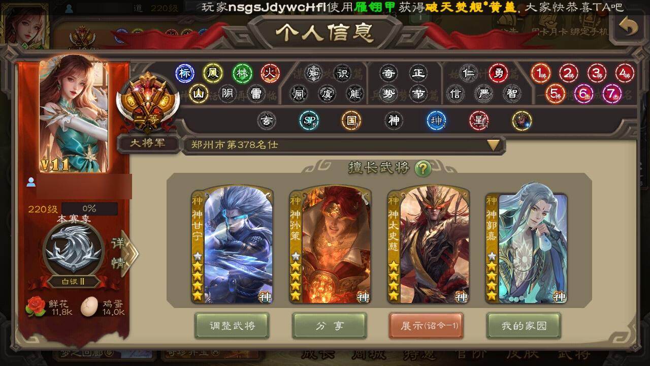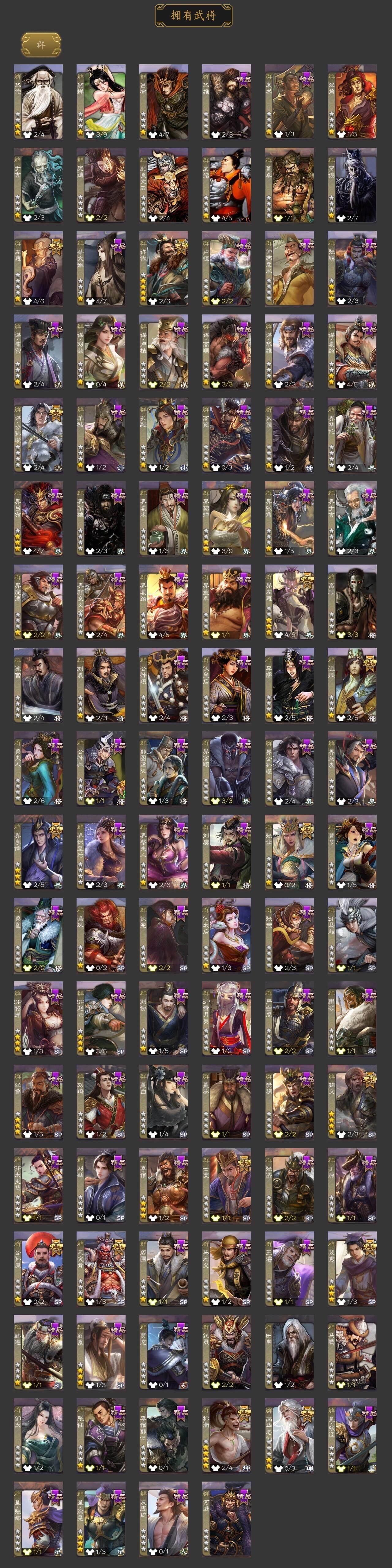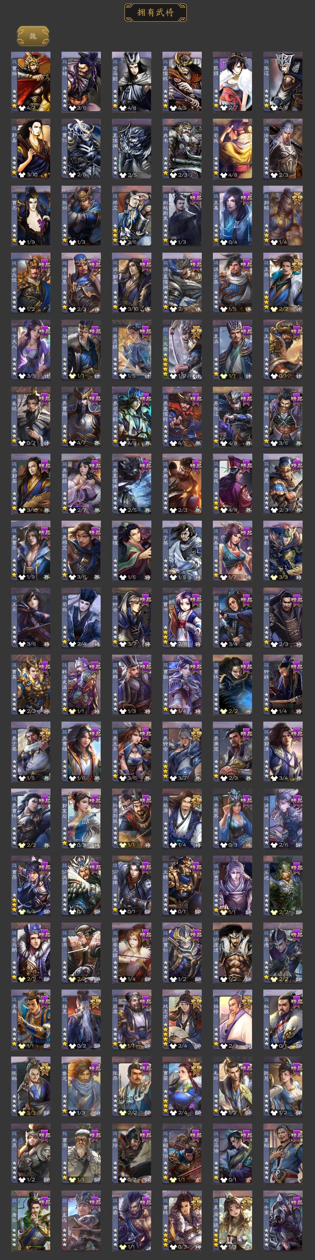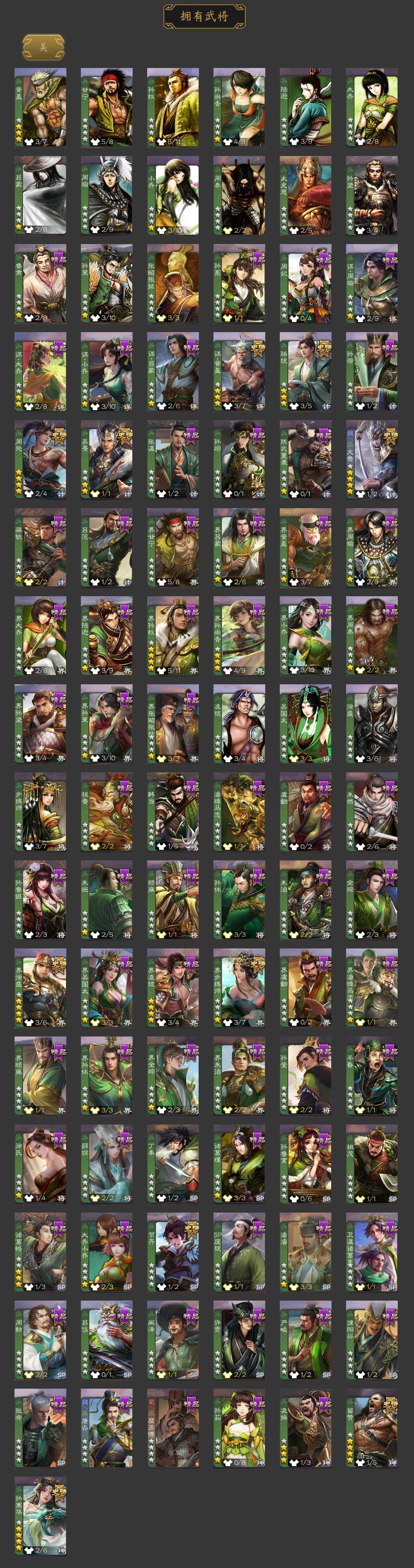 [15179319]【777】官阶:大将军;vip等级:vip11;史诗武将数量:55;动态皮肤数量:51;武将总数:425;史诗宝珠数量:4;将魂数量:6780;神将:10;魏国史诗武将:20;蜀国史诗武将:12;吴国史诗武将:9;群史诗武将:16 神赵云神陆逊神甘宁神张辽神郭嘉神太史慈神孙策神关羽神吕蒙神周瑜星周不疑王粲杨修文鸯界钟会界于禁嵇康郝昭陈琳曹婴曹纯戏志才关索马云騄谋赵云谋马超诸葛瞻周群赵襄沙摩柯界黄忠花鬘董允谋关羽谋黄盖周处吴景孙寒华骆统留赞界徐盛界步练师贺齐谋郭嘉谋公孙瓒裴秀左慈张让麹义南华老仙祢衡沮授界左慈界李儒公孙康张绣李傕阎象许攸神郭嘉-虎年清明动态神太史慈-勇撼日月动态神孙策-霸王再世动态神荀彧-虎年清明动态神吕蒙-心生万象神甘宁-万人辟易动态神陆逊-绽焰摧枯动态星周不疑-才广志宏动态钟会-龙年端午(动态)sp蔡文姬-兔年冬日动态荀彧-驱虎吞狼动态王粲-笔翰如流动态曹昂-竭战麟伤动态曹婴-兔年春节动态曹婴-锋芒毕露动态王元姬-鼠年冬至动态羊徽瑜-牛年中秋动态刘备-龙御天下动态卧龙诸葛-龙跃凤鸣动态关索-依心缱绻动态关银屏-兔年春节动态李丰-太仓聚粟动态周处-义除三害动态孙权-永开吴祚动态孙策-虎踞江东动态孙寒华-莲华熠熠动态孙寒华-威灵尽显动态孙权-吴王六剑动态孙尚香-星流霆击动态大乔-猪年七夕动态界大乔-猪年七夕动态界孙权-吴王六剑动态界孙尚香-星流霆击动态凌统-长风破浪动态徐盛-破军杀将动态步练师-牛年七夕动态界凌统-长风破浪动态界步练师-牛年七夕动态刘赞-灵魂歌王动态文鸯-势若万钧动态高顺-每战必克动态袁绍-声震寰宇动态麹义-扬刀立威动态貂蝉-鼠年七夕动态吕布-傲睨万物动态袁绍-一往无前动态许攸-盛气凌人动态界貂蝉-鼠年七夕动态界袁绍-一往无前动态李儒-鸠杀少帝动态界李儒-鸠杀少帝动态sp貂蝉-驭魂千机动态张鲁-虎年冬至动态刘焉-雄