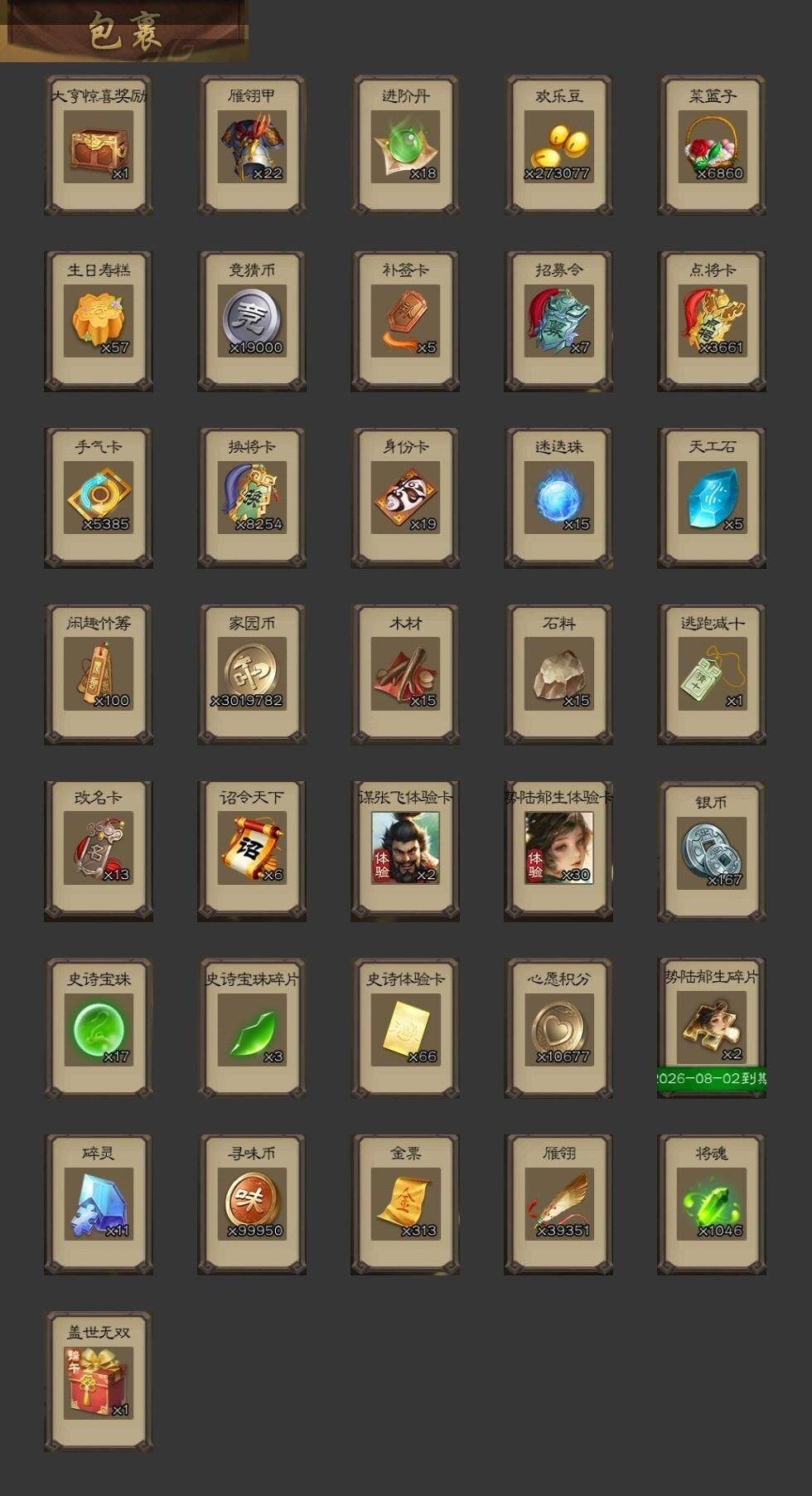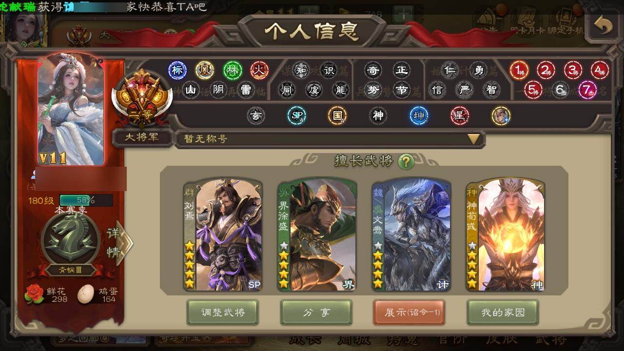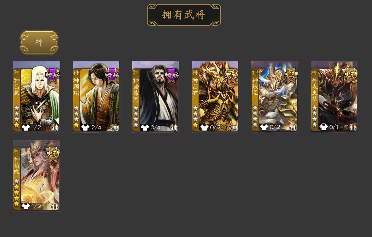 [15179394]【81】官阶:大将军;vip等级:vip11;史诗武将数量:54;动态皮肤数量:36;武将总数:406;史诗宝珠数量:17;将魂数量:1046;神将:7;魏国史诗武将:12;蜀国史诗武将:11;吴国史诗武将:7;群史诗武将:19 神吕布神张辽神太史慈神荀彧神吕蒙神周瑜神诸葛亮星周不疑王粲杨修文鸯魏-司马昭界钟会界于禁界曹真嵇康曹婴曹纯戏志才刘晔清河公主谋诸葛亮马云騄谋赵云谋马超诸葛瞻赵襄王平沙摩柯谯周界黄忠花鬘吴景留赞界朱然界徐盛贺齐势陆郁生势太史慈谋黄月英裴秀左慈郑玄张让苏飞审配麹义刘焉沮授界左慈界李儒公孙康卑弥呼谋张角张绣李傕许攸星董卓神荀彧-匡汉延祚动态神周瑜-波澜不惊神赵云-鳞振九霄神吕蒙-心生万象神曹操-天下归心神曹操-四方归心动态神赵云-神龙天降鲍三娘-情定缘起王元姬-婆娑起舞(动态)星周不疑-才广志宏动态曹婴-兔年春节动态司马昭-昭威淮南(动态)星徐晃-斧引霹雳动态清河公主-魅影萦心动态黄忠-烈箭贯云动态)黄月英-明良千古动态界黄月英-明良千古动态马良-荡然由心动态诸葛果-蛇年限定动态卧龙诸葛-火烧博望动态吕蒙-剑起惊澜动态徐盛-破军杀将动态孙寒华-蛇年限定动态鲁肃-蛇年端午动态文鸯-势若万钧动态麹义-扬刀立威动态吕布-虓虎之勇动态界吕布-虓虎之勇动态刘焉-雄踞益州动态庞德公-超脱于世动态sp赵云-威名尽显动态皇甫嵩-奋钺振旅动态祢衡-狷介疏狂动态张鲁-安民护祚动态刘焉-龙兴蜀川动态蔡文姬-以身证道(动态)左慈-蛇年限定动态