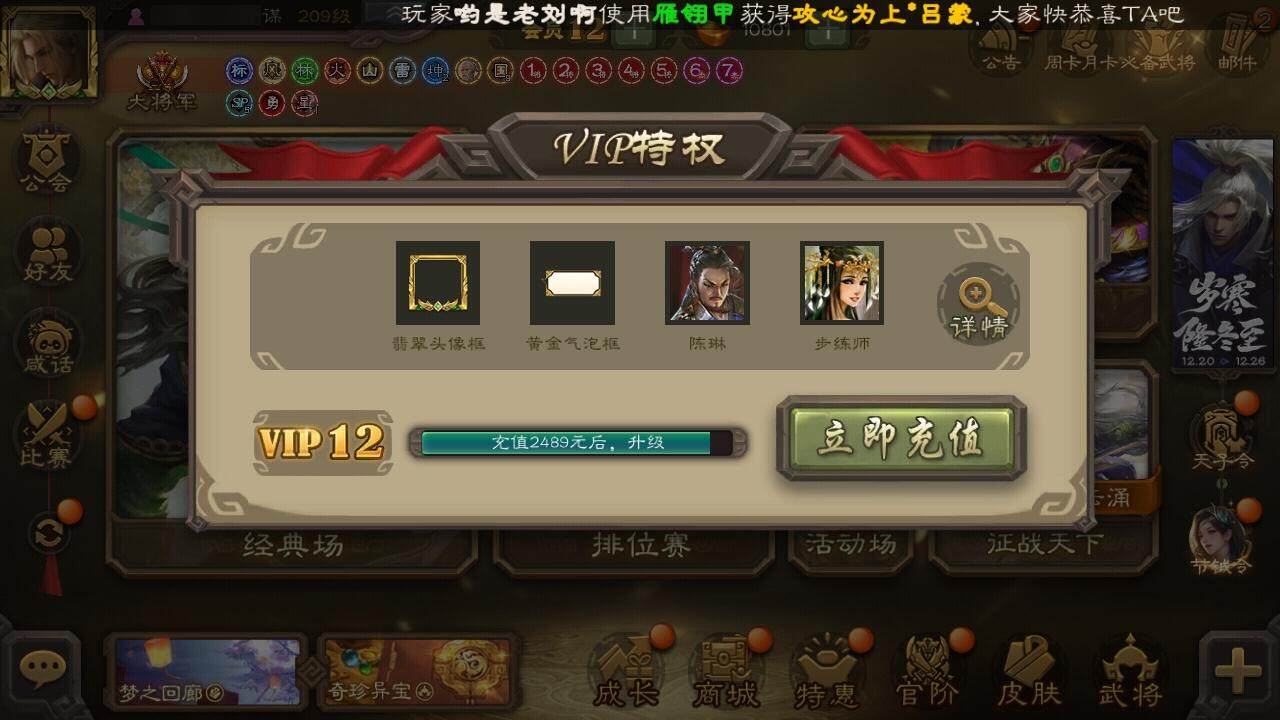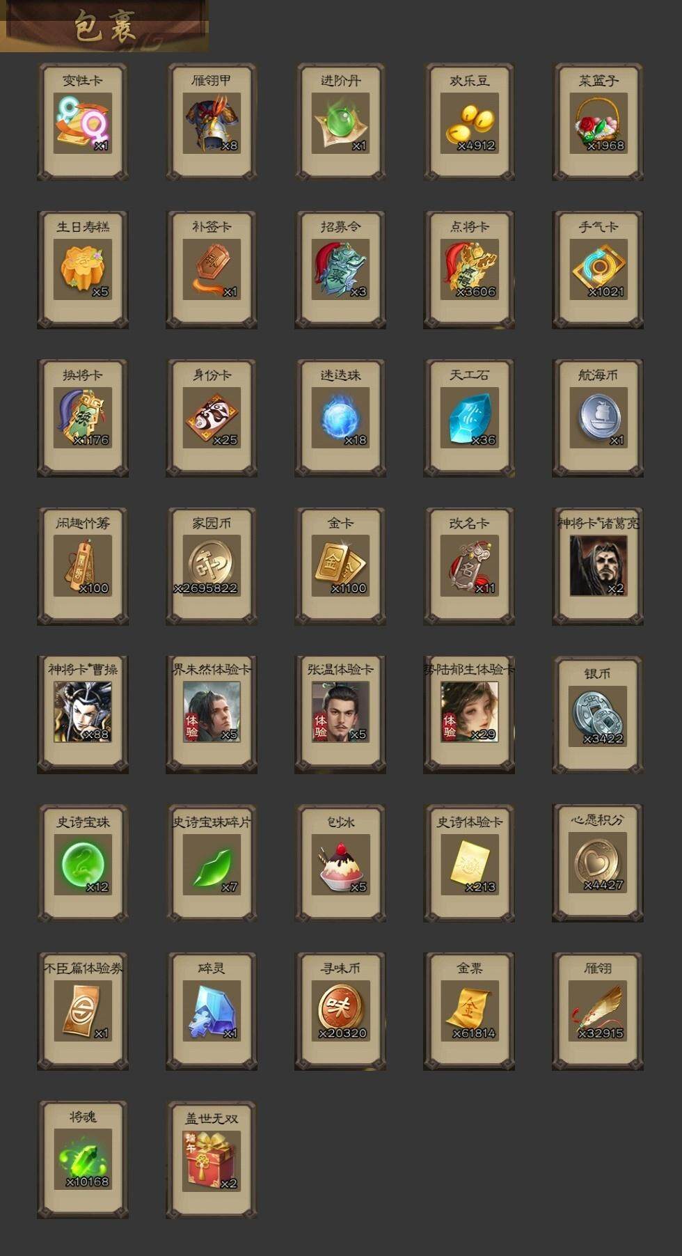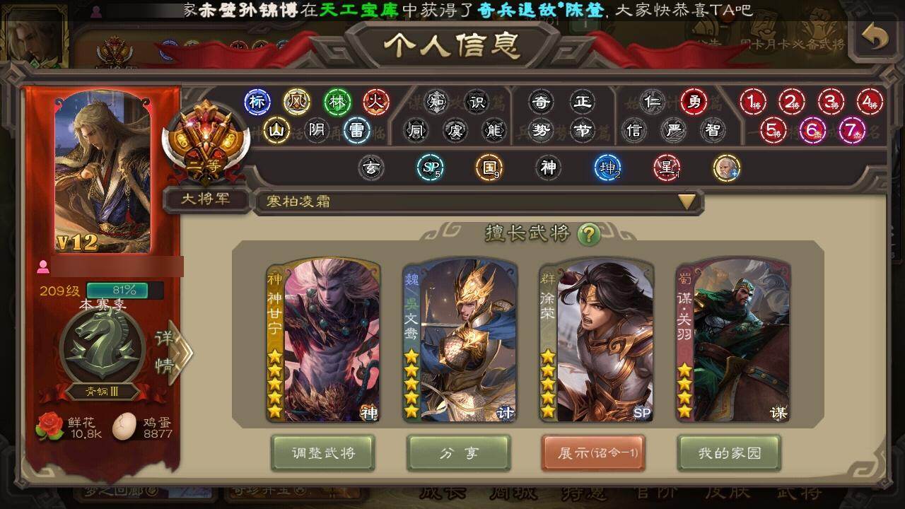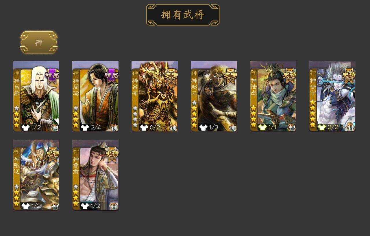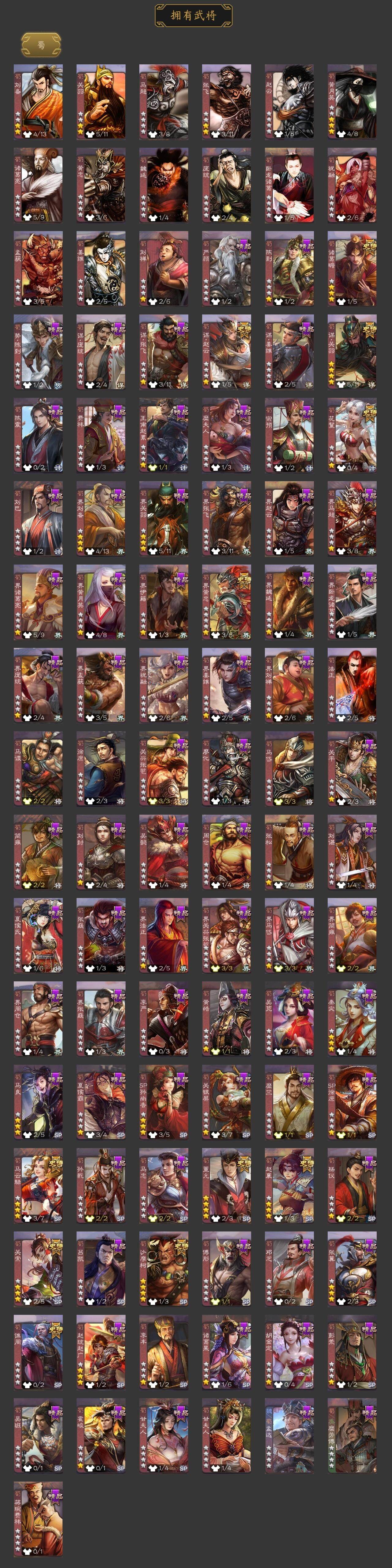 [15179509]【135】官阶:大将军;vip等级:vip12;史诗武将数量:62;动态皮肤数量:51;武将总数:428;史诗宝珠数量:12;将魂数量:10168;神将:8;魏国史诗武将:31;蜀国史诗武将:11;吴国史诗武将:6;群史诗武将:21 神吕布神赵云神陆逊神甘宁神张辽神吕蒙神周瑜神鲁肃sp司马昭星周不疑杨修文鸯王元姬王凌马钧界钟会嵇康郝昭陈琳曹婴曹纯戏志才刘晔清河公主关索马云騄谋赵云诸葛瞻赵襄沙摩柯谯周界黄忠花鬘董允谋关羽谋孙策吴景留赞界徐盛贺齐势陆郁生左慈张仲景张让徐荣星黄忠星甘宁陶谦苏飞司马徽审配麹义庞德公南华老仙祢衡沮授界左慈界李儒公孙康卑弥呼张绣许攸神鲁肃-九州为局神张辽-威震江东神太史慈-勇撼日月动态神甘宁-战破无间神甘宁-万人辟易动态神陆逊-绽焰摧枯动态神吕蒙-兼资文武动态神周瑜-陵光引灵动态神曹操-天下归心神赵云-战龙在野动态sp司马昭-鼠年冬至(动态)郭嘉-以身证道(动态)曹丕-气荡山河(动态)甄姬-明珠耀躯(动态)sp蔡文姬-兔年冬日动态邓艾-神兵天降动态界邓艾-神兵天降动态张春华-雪中舞刃动态钟会-谋谟之勋动态钟繇-稳定关右动态界钟会-谋谟之勋动态辛宪英-鼠年春节动态戏志才-举棋若定动态曹婴-锋芒毕露动态朱灵-以战破氐动态王元姬-鼠年冬至动态清河公主-魅影萦心动态诸葛亮-龙年限定动态关羽-以身证道(动态)刘备-龙骧麟振动态马超-牛年春节动态张飞-据水断桥动态黄月英-鼠年春节动态诸葛亮-明良千古动态界刘备-龙骧麟振动态界张飞-据水断桥动态界马超-牛年春节动态界诸葛亮-明良千古动态界黄月英-鼠年春节动态关银屏-鼠年中秋动态马云騄-牛年春节动态关索-鼠年中秋动态关索-虎年七夕动态周处-义除三害动态陆逊-龙年七夕动态孙寒华-莲华熠熠动态文鸯-破宇开天动态孙权-猪年端午动态孙尚香-星流霆击动态大乔-鼠年春分动态周瑜-鼠年春节动态孙策-猪年七夕动态鲁肃-联刘抗曹动态