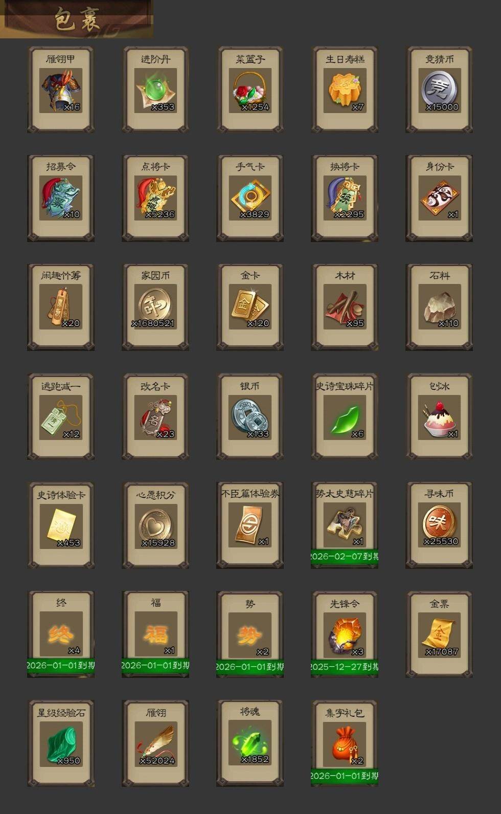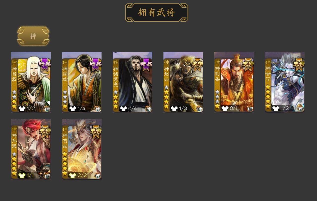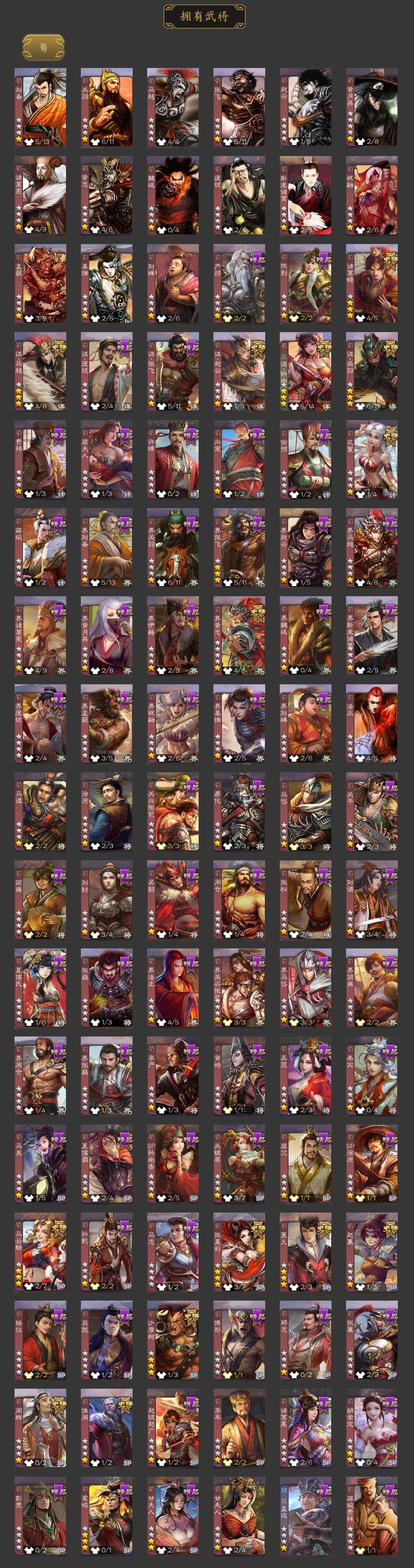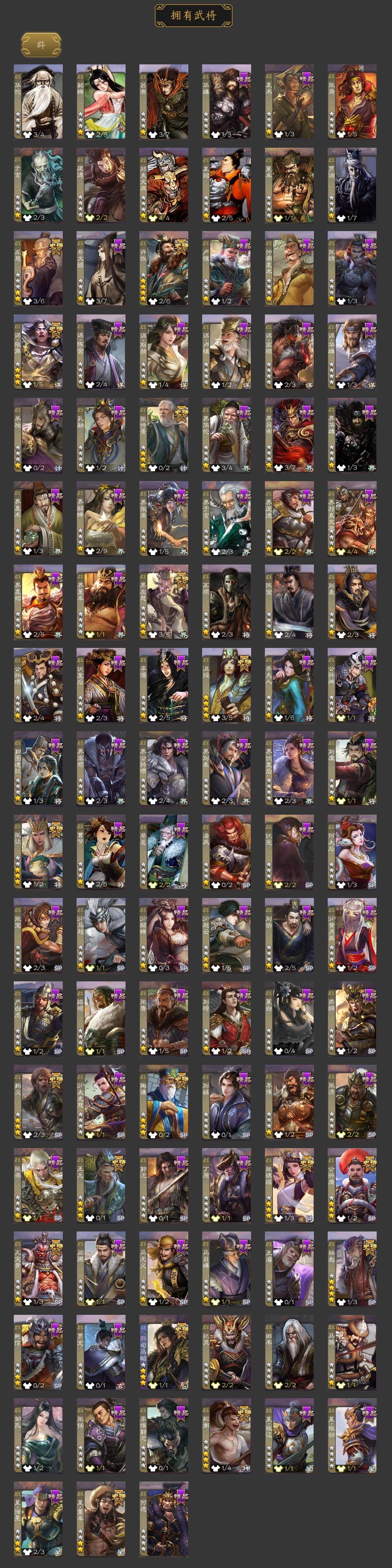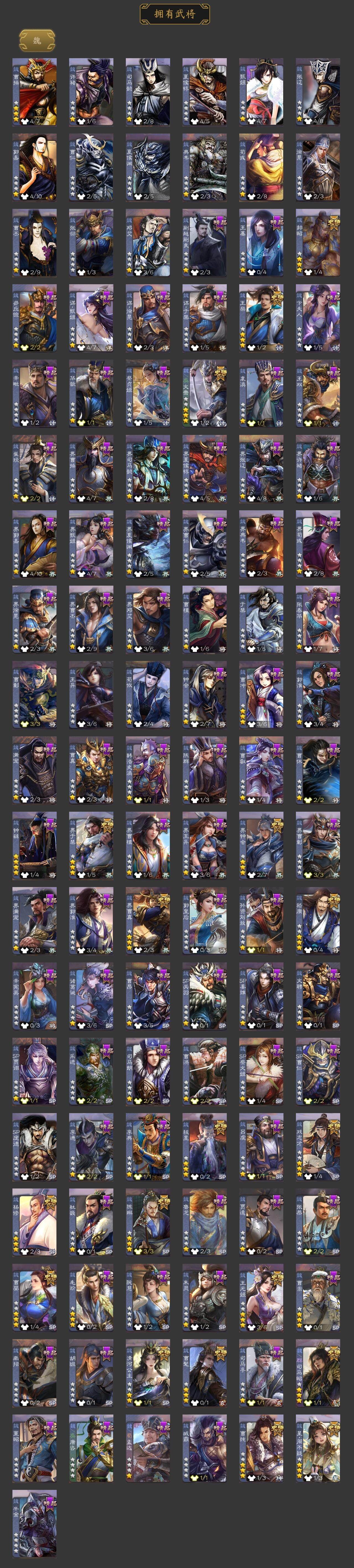 [15179893]【419】官阶:大将军;vip等级:vip11;史诗武将数量:58;动态皮肤数量:51;武将总数:421;史诗宝珠数量:0;将魂数量:1852;神将:8;魏国史诗武将:35;蜀国史诗武将:15;吴国史诗武将:5;群史诗武将:18 神赵云神刘备神甘宁神孙策神荀彧神吕蒙神周瑜神诸葛亮曹髦星周不疑王粲杨修文鸯王元姬魏-司马昭界钟会界于禁界曹真嵇康郝昭陈琳曹婴曹纯戏志才清河公主马云騄谋孙尚香谋赵云谋马超诸葛瞻周群赵襄张星彩沙摩柯谯周界黄忠花鬘董允谋关羽周处骆统留赞界朱然界徐盛左慈张仲景张让张琪瑛杨彪王允陶谦麹义祢衡沮授界左慈公孙康鲍信谋张角张绣李傕许攸星董卓神太史慈-勇撼日月动态神孙策-霸王再世动态神荀彧-虎年清明动态神荀彧-匡汉延祚动态神吕蒙-心生万象神甘宁-万人辟易动态神赵云-战龙在野动态sp司马昭-鼠年冬至(动态)王元姬-婆娑起舞(动态)星周不疑-才广志宏动态甄姬-明珠耀躯(动态)sp蔡文姬-兔年冬日动态荀彧-驱虎吞狼动态邓艾-神兵天降动态王粲-笔翰如流动态界邓艾-神兵天降动态钟会-谋谟之勋动态钟繇-稳定关右动态界钟会-谋谟之勋动态曹昂-竭战麟伤动态朱灵-以战破氐动态曹纯-虎年春节动态王元姬-鼠年冬至动态司马昭-昭威淮南(动态)星徐晃-斧引霹雳动态清河公主-魅影萦心动态卧龙诸葛-龙跃凤鸣动态关索-依心缱绻动态马超-牛年春节动态张飞-明良千古动态诸葛亮-虎年中秋动态黄忠-明良千古动态诸葛瞻-绵竹之殇动态界马超-牛年春节动态关银屏-兔年春节动态马云騄-牛年春节动态张星彩-猪年中秋动态李丰-太仓聚粟动态诸葛果-蛇年限定动态太史慈-涤荡江东动态周处-义除三害动态吕蒙-剑起惊澜动态陆逊-龙年七夕动态黄盖-兔年端午动态孙权-猪年端午动态孙尚香-星流霆击动态孙策-猪年七夕动态界孙权-猪年端午动态界孙尚香-星流霆击动态界孙策-猪年七夕动态徐盛-破军杀将动态孙茹-烟水悠悠动态