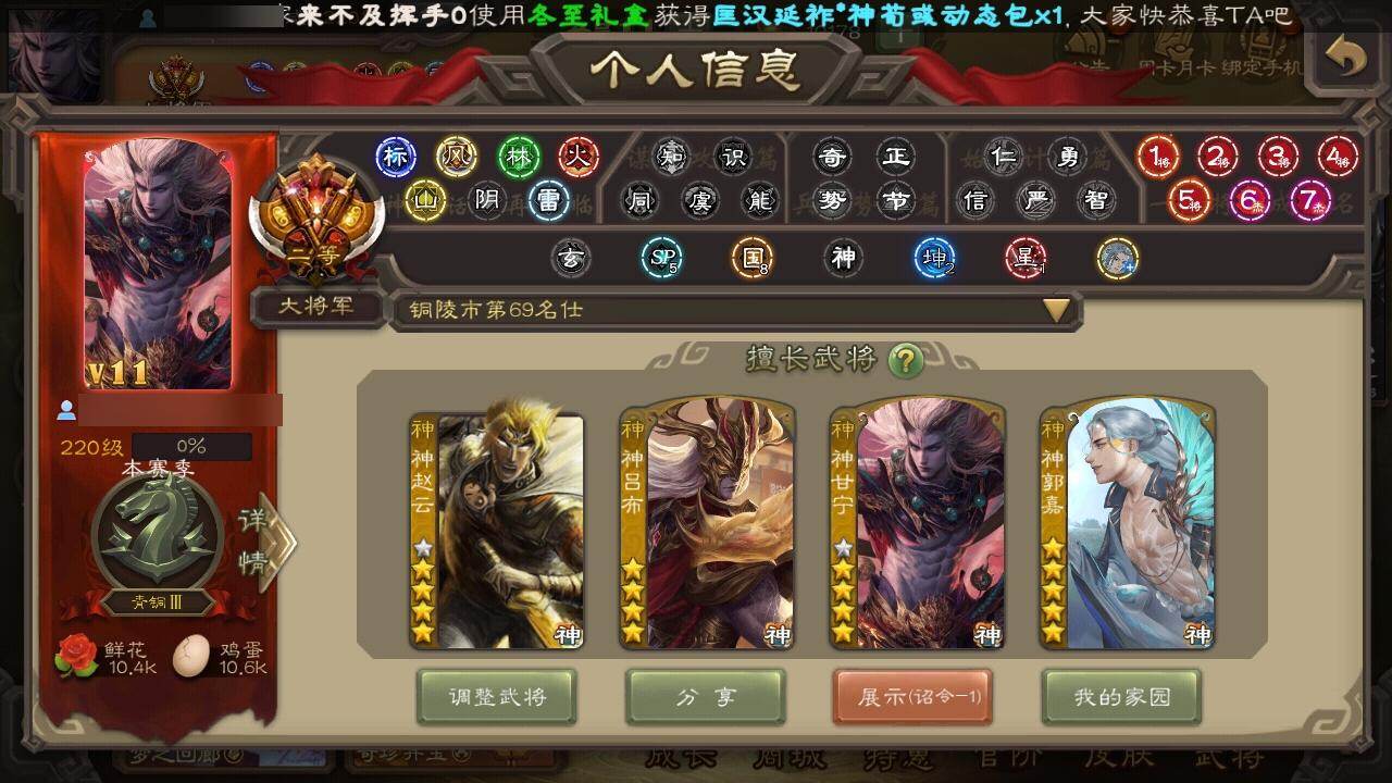 [15179988]【337】官阶:大将军;vip等级:vip11;史诗武将数量:62;动态皮肤数量:52;武将总数:423;史诗宝珠数量:17;将魂数量:15200;神将:9;魏国史诗武将:28;蜀国史诗武将:12;吴国史诗武将:8;群史诗武将:19 神吕布神赵云神陆逊神刘备神甘宁神张辽神郭嘉神吕蒙神周瑜sp司马昭星周不疑王粲杨修王元姬王朗马钧界钟会界于禁界曹真嵇康郝昭陈琳曹纯戏志才刘晔关索马云騄谋赵云谋马超诸葛瞻周群赵襄张星彩沙摩柯界黄忠花鬘鲍三娘谋黄盖吴景骆统留赞界朱然界徐盛界步练师贺齐谋公孙瓒左慈张让星黄忠王允苏飞审配麹义庞德公祢衡刘焉沮授界左慈界李儒公孙康卑弥呼张绣李傕许攸神郭嘉-虎年清明动态神荀彧-虎年清明动态神甘宁-战破无间神甘宁-万人辟易动态神吕蒙-兼资文武动态神周瑜-陵光引灵动态神曹操-天下归心神吕布-冠绝天下动态神赵云-战龙在野动态曹丕-气荡山河(动态)甄姬-明珠耀躯(动态)许褚-兔年端午动态许褚-虎啸生风动态司马懿-牛年立冬动态荀彧-驱虎吞狼动态邓艾-神兵天降动态界司马懿-牛年立冬动态界许褚-虎啸生风动态界邓艾-神兵天降动态钟会-谋谟之勋动态界钟会-谋谟之勋动态戏志才-举棋若定动态曹纯-虎年春节动态王元姬-鼠年冬至动态刘备-龙御天下动态卧龙诸葛-龙跃凤鸣动态刘备-龙骧麟振动态马超-牛年春节动态张飞-据水断桥动态黄月英-明良千古动态诸葛亮-明良千古动态界刘备-龙骧麟振动态界张飞-据水断桥动态界马超-牛年春节动态界诸葛亮-明良千古动态界黄月英-明良千古动态sp孙尚香-明良千古动态关银屏-虎年端午动态马云騄-猪年大雪动态赵襄-猪年春节动态关索-鼠年中秋动态鲍三娘-虎年七夕动态李丰-太仓聚粟动态胡金定-明良千古动态太史慈-涤荡江东动态周处-义除三害动态吕蒙-剑起惊澜动态孙策-虎踞江东动态黄盖-鏖战赤壁动态孙尚香-星流霆击动态大乔-猪年七夕动态大乔-绝世之姿动