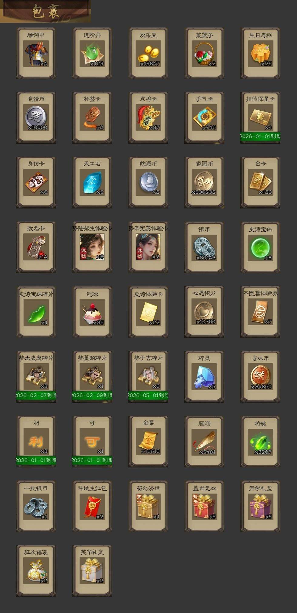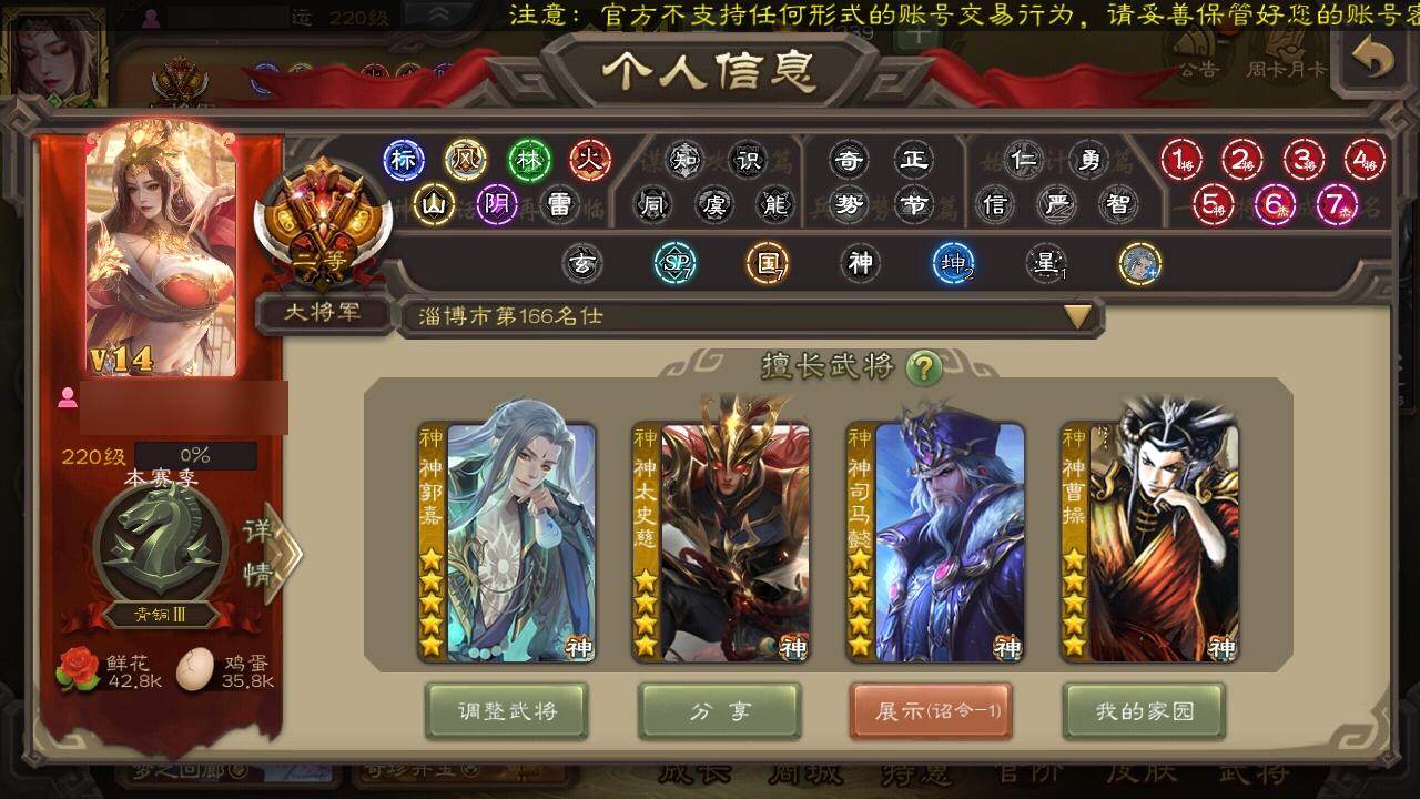 [15180029]【514】官阶:大将军;vip等级:vip14;史诗武将数量:52;动态皮肤数量:41;武将总数:400;史诗宝珠数量:8;将魂数量:3207;神将:12;魏国史诗武将:30;蜀国史诗武将:10;吴国史诗武将:4;群史诗武将:17 神曹操神吕布神赵云神司马懿神陆逊神刘备神郭嘉神太史慈神关羽神吕蒙神周瑜神诸葛亮sp司马昭杨修文鸯王元姬马钧界钟会嵇康陈琳曹纯戏志才刘晔清河公主关索马云騄谋赵云周群赵襄张星彩王平界黄忠花鬘董允孙皓留赞界徐盛贺齐谋貂蝉左慈张让王允陶谦司马徽麹义庞德公祢衡刘焉沮授界李儒公孙康卑弥呼张绣李傕许攸神郭嘉-虎年清明动态神周瑜-陵光引灵动态神诸葛亮-孟章诛邪动态神司马懿-徐图大略神曹操-天下归心神曹操-玄天通冥动态神吕布-监兵噬魅动态神赵云-战龙在野动态钟会-龙年端午(动态)许褚-兔年端午动态司马懿-鹰视狼顾动态曹丕-猪年端午动态张郃-背水一战动态邓艾-神兵天降动态王基-独秉固志动态界司马懿-鹰视狼顾动态界曹丕-猪年端午动态界邓艾-神兵天降动态张春华-宣穆夜袭动态钟会-谋谟之勋动态界钟会-谋谟之勋动态辛宪英-鼠年春节动态马钧-能工巧匠动态清河公主-魅影萦心动态诸葛亮-龙年限定动态马超-牛年春节动态马超-西凉雄狮动态张飞-猪年中秋动态赵云-截江救主动态黄月英-鼠年春节动态魏延-麒麟生角动态刘禅-猪年端午动态界张飞-猪年中秋动态界赵云-截江救主动态界马超-牛年春节动态界马超-西凉雄狮动态界黄月英-鼠年春节动态界魏延-麒麟生角动态界刘禅-猪年端午动态夏侯氏-猪年中秋动态赵襄-猪年春节动态关索-虎年七夕动态诸葛果-虎年中秋动态卧龙诸葛-火烧博望动态孙策-虎踞江东动态孙权-猪年端午动态陆逊-猪年圣诞动态大乔-猪年七夕动态界大乔-猪年七夕动态界陆逊-猪年圣诞动态界孙权-猪年端午动态孙茹-花容月貌动态孙茹-烟水悠悠动态刘赞-抗音而歌动态灵雎-霜刃绚练