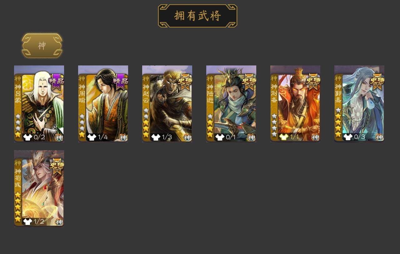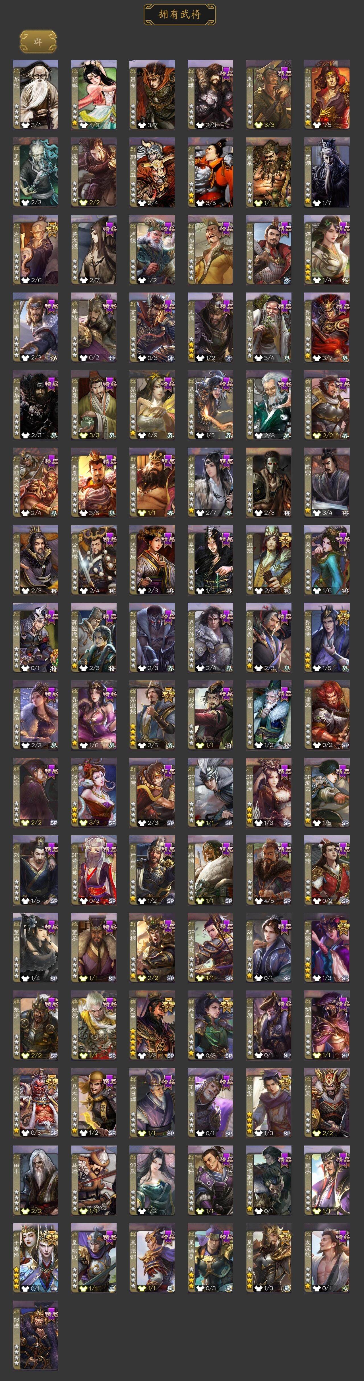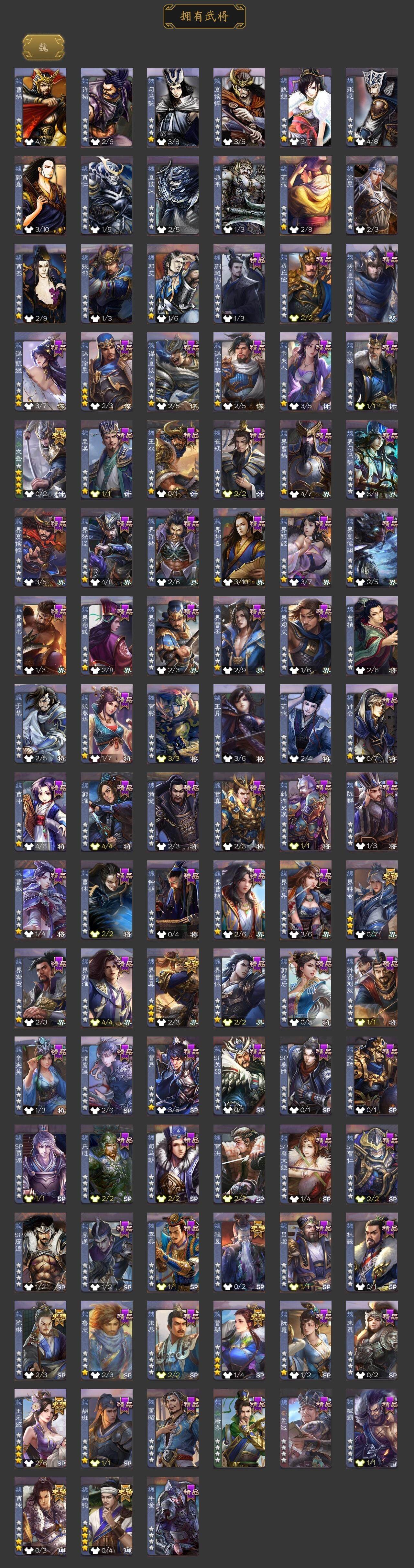 [15180319]【992】官阶:大将军;vip等级:vip11;史诗武将数量:39;动态皮肤数量:33;武将总数:383;史诗宝珠数量:0;将魂数量:584;神将:7;魏国史诗武将:10;蜀国史诗武将:7;吴国史诗武将:7;群史诗武将:10 神赵云神陆逊神刘备神郭嘉神荀彧神吕蒙神周瑜文鸯王元姬马钧界钟会界曹真陈琳曹婴曹纯谋黄忠谋夏侯氏谋赵云谋马超沙摩柯界黄忠花鬘吴景孙寒华骆统留赞界朱然界徐盛界步练师十常侍裴秀界沮授左慈星黄忠苏飞刘焉沮授界李儒卑弥呼神张辽-威震江东神荀彧-虎年清明动态神刘备-龙兴海内神关羽-佑子伐吴神曹操-天下归心神赵云-神龙天降曹植-龙年中秋动态sp蔡文姬-兔年冬日动态甄姬-牛年清明动态界甄姬-牛年清明动态曹婴-兔年春节动态刘备-龙御天下动态诸葛亮-龙年限定动态卧龙诸葛-龙跃凤鸣动态刘备-龙骧麟振动态关羽-明良千古动态马超-明良千古动态界刘备-龙骧麟振动态夏侯氏-明良千古动态sp孙尚香-明良千古动态关银屏-兔年春节动态关索-虎年七夕动态李丰-太仓聚粟动态诸葛果-仙池起舞动态孙策-虎踞江东动态孙寒华-莲华熠熠动态孙尚香-兔年春节动态孙尚香-星流霆击动态大乔-猪年七夕动态界大乔-猪年七夕动态界孙尚香-星流霆击动态朱然-剑舞枫飞动态鲁肃-蛇年端午动态曹节-龙年中秋动态灵雎-霜刃绚练动态貂蝉-舞惑群心动态卑弥呼-呼风唤雨动态貂蝉-绝世倾城动态袁绍-一往无前动态谋刘赪-明良千古动态界貂蝉-绝世倾城动态界袁绍-一往无前动态何太后-蛇蝎为心动态sp貂蝉-驭魂千机动态张鲁-虎年冬至动态刘焉-雄踞益州动态张鲁-安民护祚动态