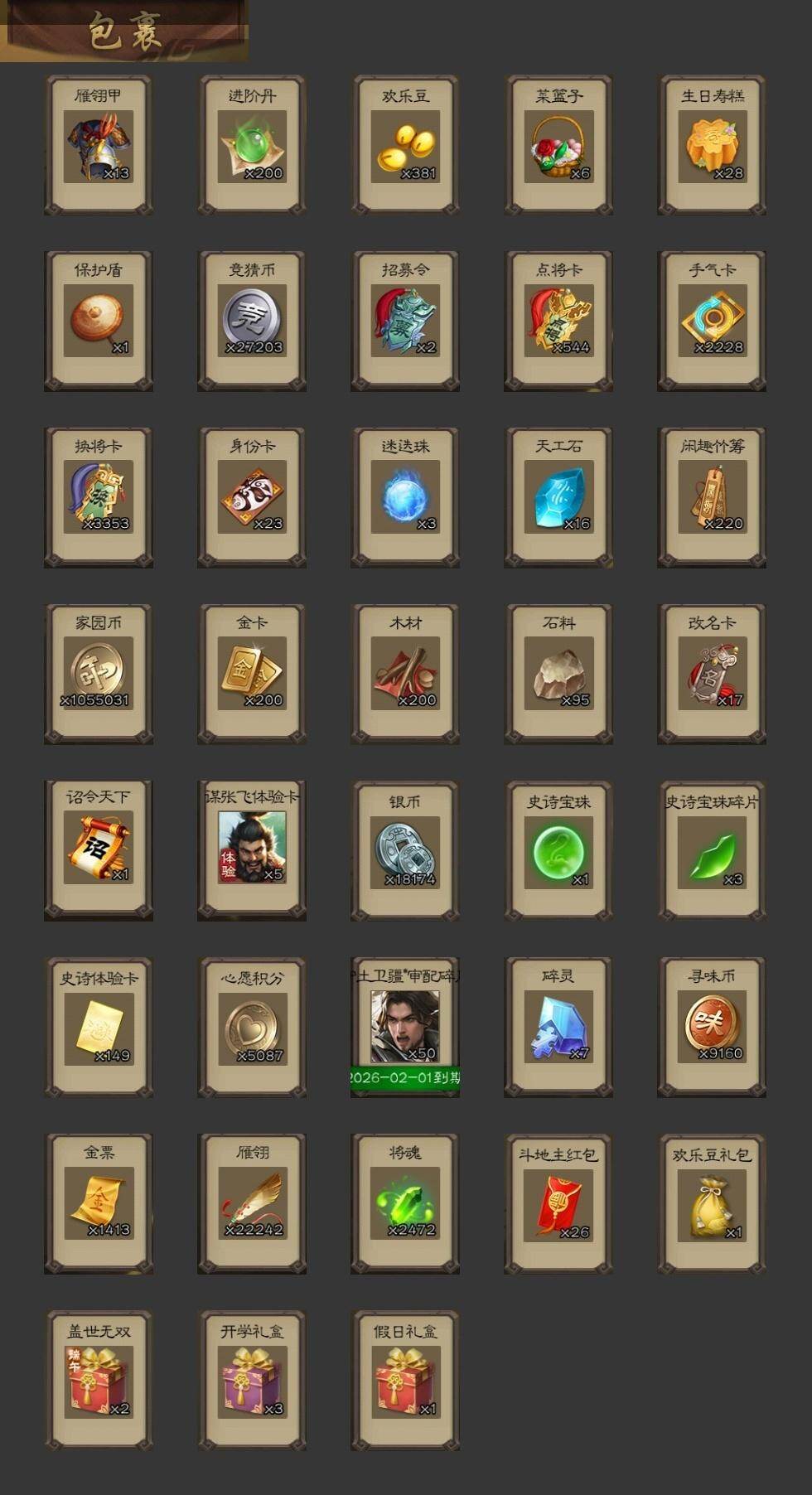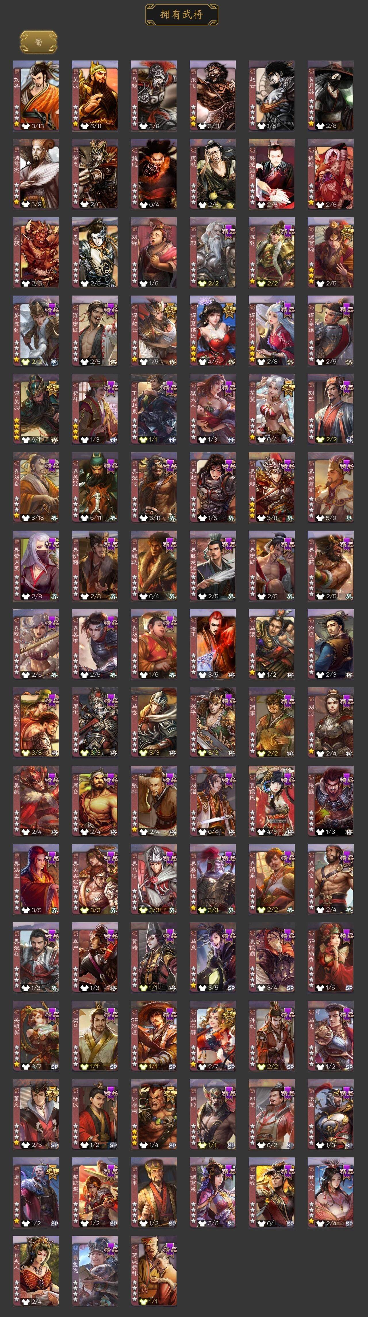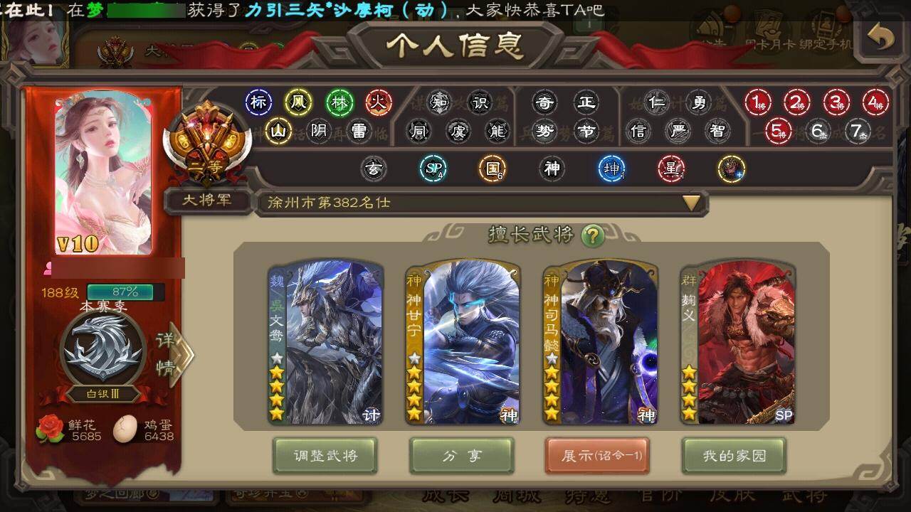 [15180340]【502】官阶:大将军;vip等级:vip10;史诗武将数量:43;动态皮肤数量:41;武将总数:397;史诗宝珠数量:1;将魂数量:2472;神将:7;魏国史诗武将:20;蜀国史诗武将:9;吴国史诗武将:7;群史诗武将:13 神吕布神赵云神司马懿神陆逊神甘宁神张辽神郭嘉星周不疑杨修王元姬界钟会嵇康曹婴曹纯戏志才程昱马云騄谋夏侯氏谋赵云诸葛瞻沙摩柯谯周花鬘董允谋关羽孙寒华留赞界徐盛贺齐势陆郁生文鸯谋公孙瓒左慈麹义刘焉沮授界左慈界李儒公孙康谋张角星董卓兀突骨司马昭神吕蒙神周瑜势夏侯尚sp关羽sp曹仁sp蔡文姬乐进曹昂诸葛诞朱灵文聘sp姜维张春华钟会曹冲郭淮满宠界王异界曹操界司马懿界夏侯惇界张辽界许褚界郭嘉李典曹真韩浩史涣陈群曹叡曹休钟繇司马朗王基李通郭皇后孙资刘放辛宪英界甄姬吕虔鲁芝蒯越蒯良界典韦界荀彧界徐晃杜畿界曹丕毌丘俭界邓艾张恭界曹植界满宠界郭淮卞夫人华歆蔡贞姬袁涣崔琰毛玠谋于禁谋甄姬谋荀彧牵招胡班李昭焦伯司马伷谋郭嘉谋夏侯渊牛金界夏侯渊臧霸唐咨董昭势陈到sp孙尚香关银屏夏侯霸马良关兴张苞廖化界马岱关平简雍刘封界法正界关兴张苞界刘备界关羽界张飞界赵云界马超sp徐庶吴懿周仓张松刘谌夏侯氏糜竺马忠孙乾李严黄皓界黄月英界诸葛亮赵统赵广严颜界伊籍界卧龙诸葛界庞统界孟获界祝融陈到界姜维界刘禅张翼杨仪界廖化邓芝傅肜界简雍费祎糜夫人王甫赵累界周仓刘巴谋庞统谋黄月英界张嶷谋姜维霍峻诸葛果界魏延蒋琬费祎甘夫人鲁肃孙茹凌操大乔小乔诸葛恪诸葛瑾孙鲁育程普韩当潘璋马忠虞翻朱然界周泰界甘宁界吕蒙界黄盖界周瑜界大乔界陆逊孙鲁班朱桓顾雍孙休朱治全琮阚泽孙登岑昏界孙权界孙尚香孙亮严畯界孙坚吕岱周鲂周妃界孙策界张昭张纮许贡卫温诸葛直界吴国太界凌统界韩当界程普界虞翻界潘璋马忠孙邵桥公陈武董袭蒋钦吕范界顾雍界孙鲁班谋韩当谋吕蒙谋甘宁谋周瑜谋