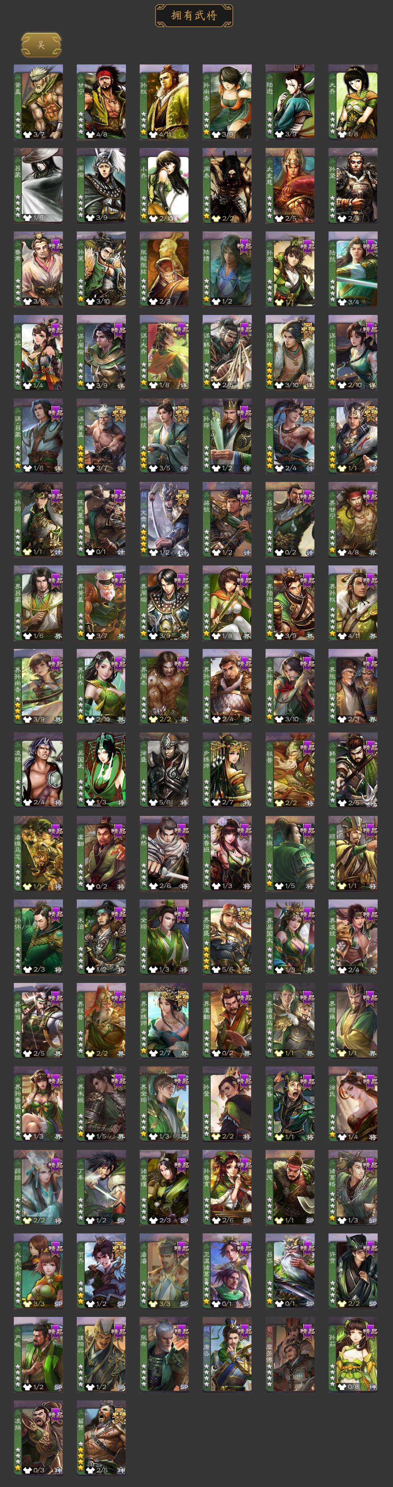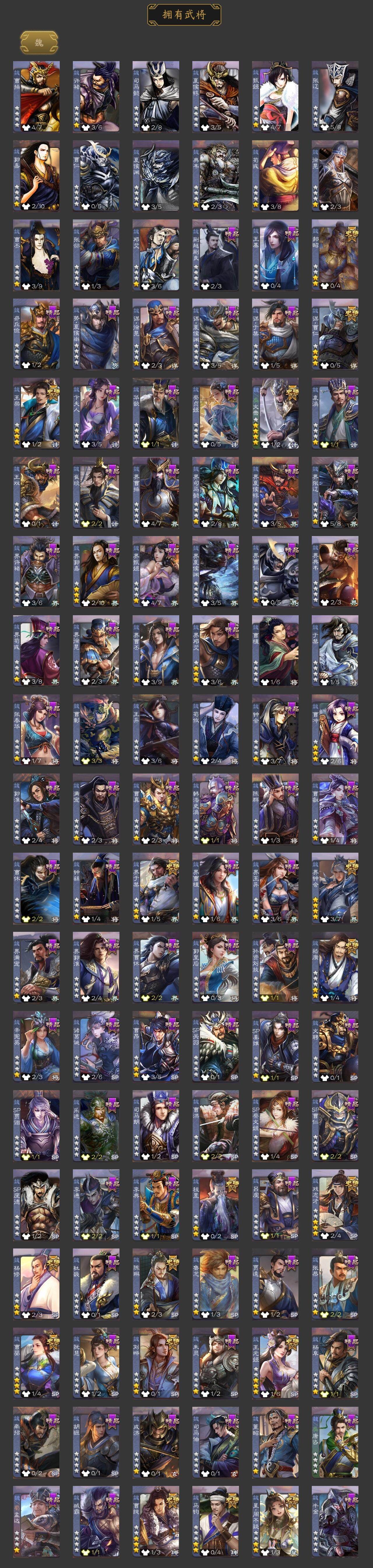 [15180864]【137】官阶:大将军;vip等级:vip15;史诗武将数量:67;动态皮肤数量:45;武将总数:440;史诗宝珠数量:0;将魂数量:224;神将:10;魏国史诗武将:20;蜀国史诗武将:12;吴国史诗武将:9;群史诗武将:27 神赵云神张辽神郭嘉神太史慈神孙策神荀彧神关羽神吕蒙神周瑜神诸葛亮星周不疑谋曹仁王粲杨修文鸯王元姬马钧界钟会界于禁嵇康郝昭陈琳曹婴曹纯戏志才刘晔关索谋诸葛亮马云騄谋黄忠谋赵云诸葛瞻赵襄沙摩柯谯周界黄忠花鬘董允谋黄盖谋孙策周处吴景骆统留赞界徐盛界步练师贺齐谋黄月英十常侍谋貂蝉裴秀界沮授左慈郑玄张让杨彪王允陶谦苏飞审配麹义南华老仙祢衡沮授界左慈界李儒杜预卑弥呼鲍信张绣李傕许攸陈珪星董卓神张辽-威震江东神郭嘉-倚星折月动态神孙策-霸王再世动态神荀彧-匡汉延祚动态神刘备-龙兴海内神甘宁-万人辟易动态神诸葛亮-观星唤雨神曹操-天下归心神赵云-战龙在野动态神司马懿-鉴往知来动态sp司马昭-鼠年冬至(动态)星周不疑-才广志宏动态钟会-潜蛟觊天动态曹丕-气荡山河(动态)甄姬-明珠耀躯(动态)sp蔡文姬-兔年冬日动态许褚-兔年端午动态戏志才-举棋若定动态曹婴-兔年春节动态曹纯-虎年春节动态花鬘-依心缱绻动态卧龙诸葛-龙跃凤鸣动态关羽-以身证道(动态)关羽-明良千古动态黄月英-明良千古动态黄忠-明良千古动态界黄月英-明良千古动态诸葛果-蛇年限定动态周处-义除三害动态孙权-永开吴祚动态孙寒华-威灵尽显动态黄盖-鏖战赤壁动态孙尚香-兔年春节动态孙策-长沙桓王动态界黄盖-鏖战赤壁动态界孙策-长沙恒王动态徐盛-破军杀将动态孙鲁育-牛年端午动态刘赞-灵魂歌王动态文鸯-势若万钧动态曹节-龙年中秋动态蔡夫人-计上心来动态灵雎-霜刃绚练动态貂蝉-舞惑群心动态袁绍-声震寰宇动态左慈-道法显威(动态)杜预-弼朝博虬动态南华老仙-冠绝天下动态貂蝉-绝世倾城动态吕布-虓虎之勇动态