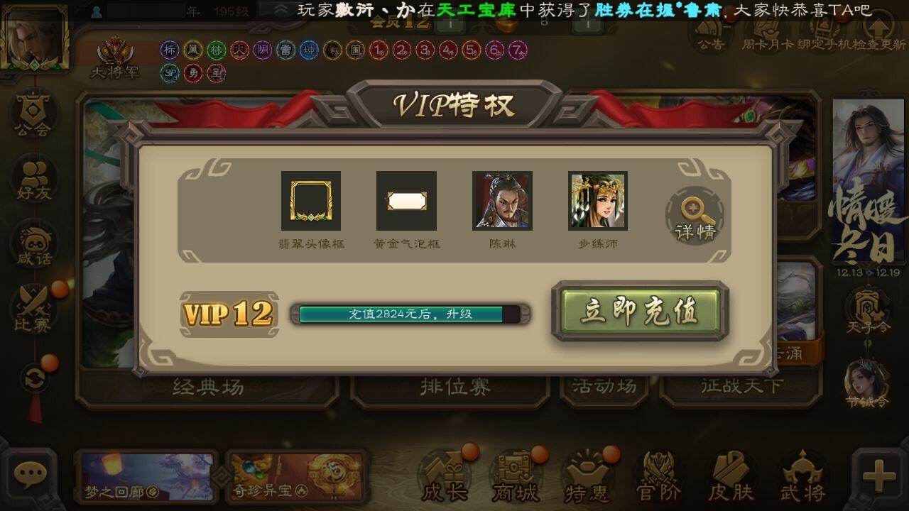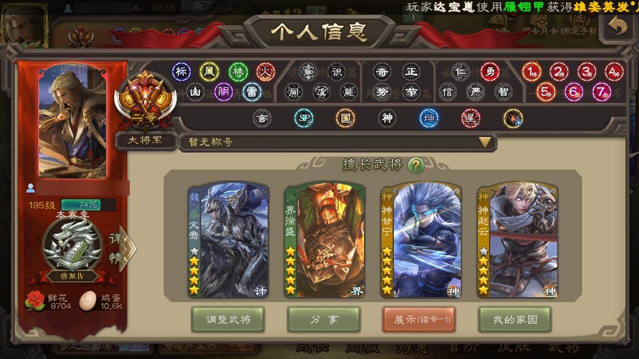 [15180907]【166】官阶:大将军;vip等级:vip12;史诗武将数量:61;动态皮肤数量:50;武将总数:441;史诗宝珠数量:0;将魂数量:686;神将:8;魏国史诗武将:36;蜀国史诗武将:13;吴国史诗武将:10;群史诗武将:21 神赵云神甘宁神张辽神太史慈神吕蒙神周瑜神诸葛亮神鲁肃sp司马昭曹髦星周不疑谋曹仁杨修文鸯王元姬界钟会界于禁嵇康郝昭陈琳曹纯戏志才刘晔清河公主关索马云騄谋赵云诸葛瞻周群张星彩王平沙摩柯谯周傅佥界黄忠花鬘董允张奋谋黄盖谋孙策孙皓骆统留赞界徐盛界步练师贺齐势太史慈谋黄月英谋荀彧十常侍左慈张让星黄忠苏飞麹义祢衡刘焉沮授界左慈界李儒杜预鲍信谋张角张绣阎象许攸陈珪势于吉神鲁肃-九州为局神张辽-威震江东神郭嘉-虎年清明动态神太史慈-勇撼日月动态神刘备-龙兴海内神周瑜-波澜不惊神赵云-鳞振九霄神甘宁-万人辟易动态神曹操-天下归心神曹操-四方归心动态神赵云-神龙天降王元姬-婆娑起舞(动态)郭嘉-以身证道(动态)羊徽瑜-月耀华裳(动态)星周不疑-才广志宏动态钟繇-安民护祚(动态)曹丕-气荡山河(动态)甄姬-明珠耀躯(动态)曹叡-睥睨天下动态sp蔡文姬-兔年冬日动态司马懿-牛年立冬动态界司马懿-牛年立冬动态张春华-牛年立冬动态张春华-雪中舞刃动态戏志才-举棋若定动态曹纯-虎年春节动态王元姬-鼠年冬至动态司马昭-昭威淮南(动态)清河公主-魅影萦心动态诸葛亮-龙年限定动态卧龙诸葛-龙跃凤鸣动态费祎-安民护祚(动态)关索-依心缱绻动态关羽-明良千古动态马超-牛年春节动态马超-虎年冬至动态诸葛瞻-绵竹之殇动态界马超-牛年春节动态sp孙尚香-猪年圣诞动态诸葛果-蛇年限定动态太史慈-涤荡江东动态周处-义除三害动态吕蒙-剑起惊澜动态陆逊-龙年七夕动态黄盖-以身证道动态孙权-兔年中秋动态孙权-永开吴祚动态大乔-猪年七夕动态周妃-笼中箜响动态界大乔-猪年七夕动态徐盛-破军杀将动态刘赞-灵魂歌王动态