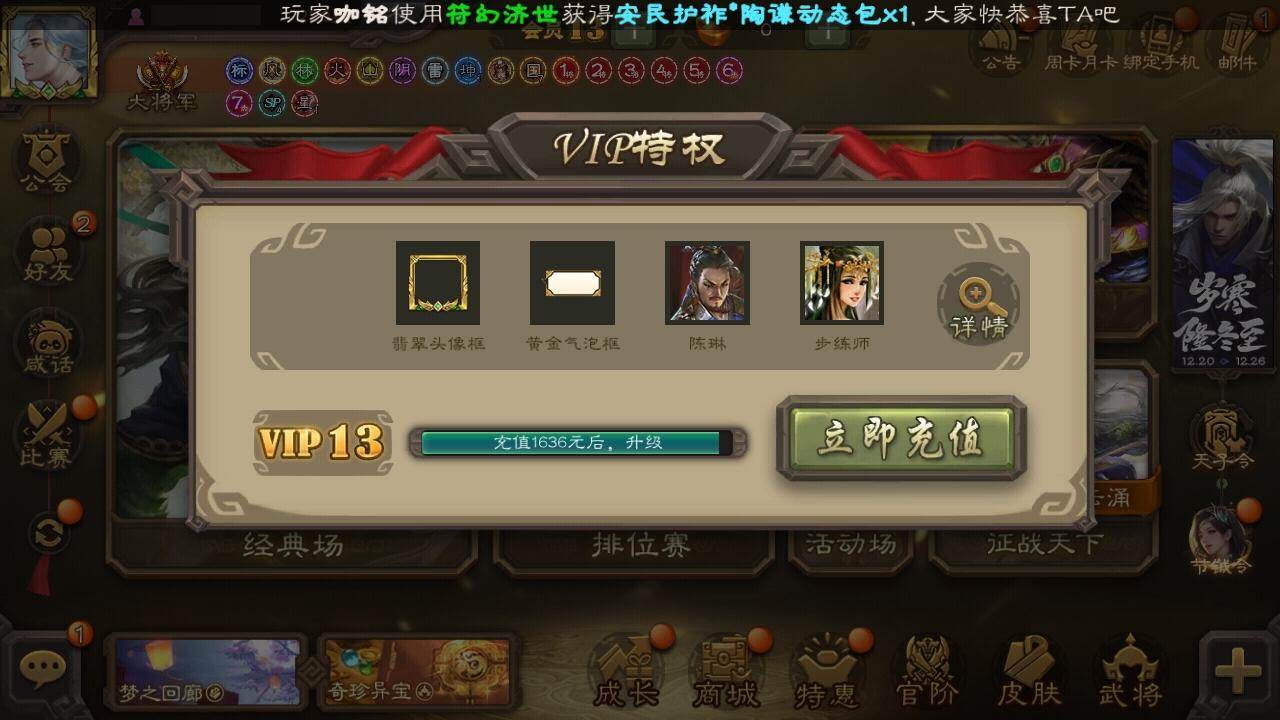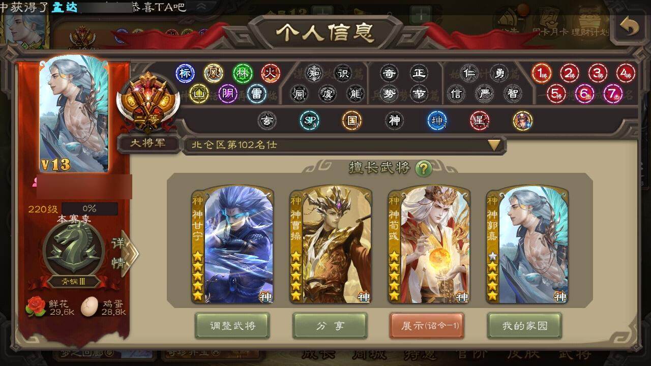 [15181010]【60】官阶:大将军;vip等级:vip13;史诗武将数量:54;动态皮肤数量:28;武将总数:411;史诗宝珠数量:0;将魂数量:1692;神将:13;魏国史诗武将:22;蜀国史诗武将:8;吴国史诗武将:7;群史诗武将:17 神曹操神吕布神赵云神陆逊神刘备神甘宁神张辽神郭嘉神孙策神荀彧神吕蒙神周瑜神诸葛亮杨修羊徽瑜王朗界钟会界于禁界曹真嵇康郝昭陈琳曹婴曹纯戏志才关索马云騄谋赵云诸葛瞻赵襄张星彩王平界黄忠周处骆统留赞界朱然界徐盛界步练师贺齐界沮授左慈张让星黄忠星甘宁苏飞麹义祢衡刘焉沮授界左慈界李儒公孙康卑弥呼张绣李傕许攸神郭嘉-虎年清明动态神荀彧-虎年清明动态神甘宁-万人辟易动态神吕蒙-兼资文武动态神周瑜-陵光引灵动态神诸葛亮-孟章诛邪动态神曹操-天下归心神曹操-玄天通冥动态神吕布-监兵噬魅动态神赵云-战龙在野动态曹植-龙年中秋动态钟繇-安民护祚(动态)荀彧-驱虎吞狼动态郝昭-死守陈仓动态钟会-谋谟之勋动态界钟会-谋谟之勋动态戏志才-举棋若定动态曹婴-锋芒毕露动态王朗-龙袭星落动态曹纯-长坂败备动态羊徽瑜-牛年中秋动态费祎-安民护祚(动态)马超-牛年春节动态赵云-牛年春节动态界赵云-牛年春节动态界马超-牛年春节动态关银屏-鼠年中秋动态马云騄-牛年春节动态关索-鼠年中秋动态太史慈-涤荡江东动态孙茹-龙年七夕动态陆逊-龙年七夕动态周瑜-蛇年端午动态陆逊-蛇年清明动态张角-迅雷风烈动态左慈-役使鬼神动态界张角-迅雷风烈动态刘焉-雄踞益州动态苏飞-肝胆相照动态星甘宁-肝胆相照动态