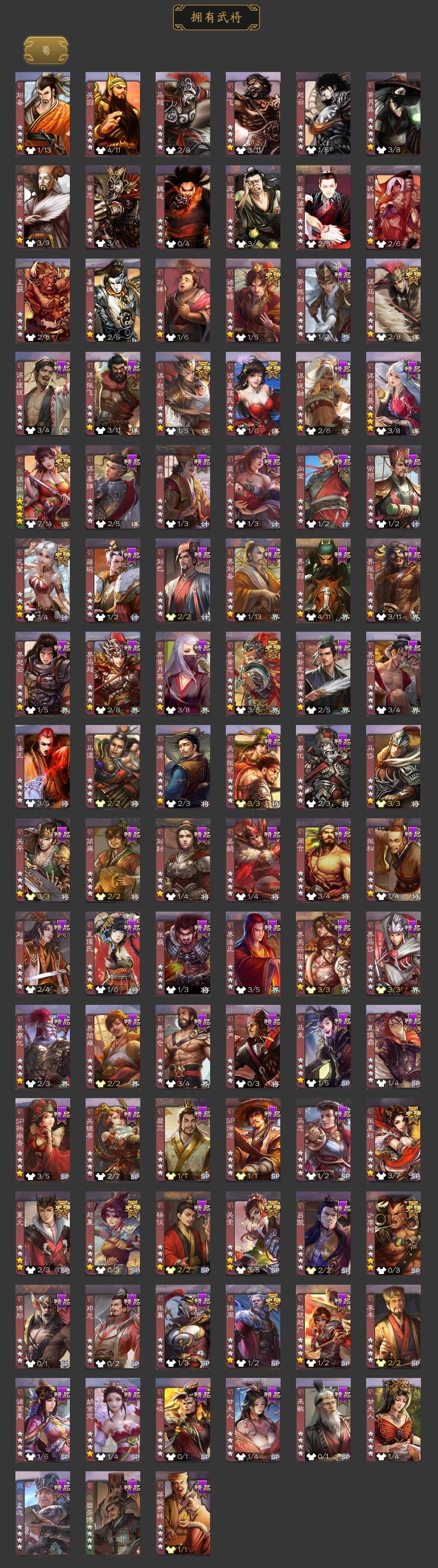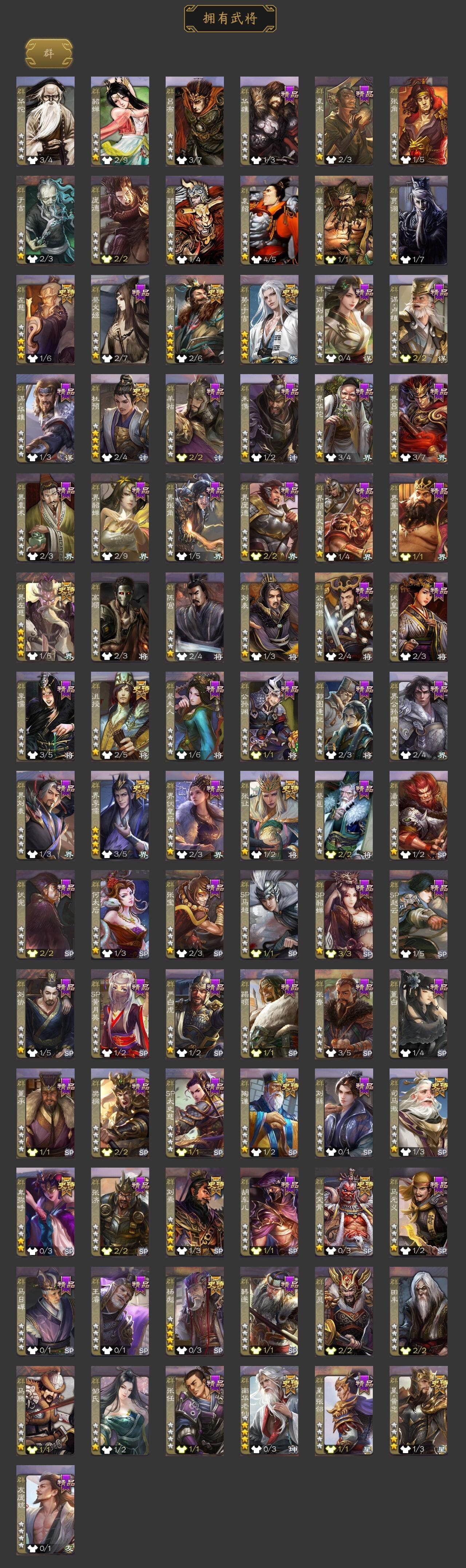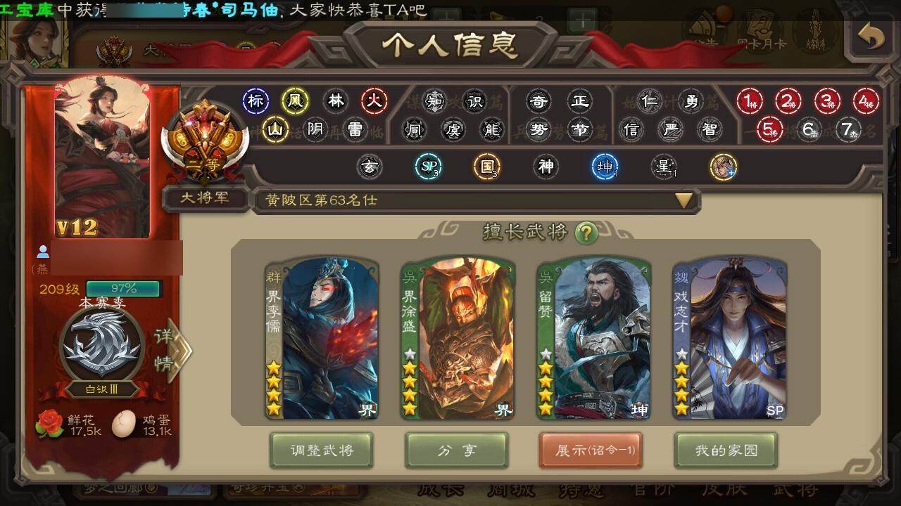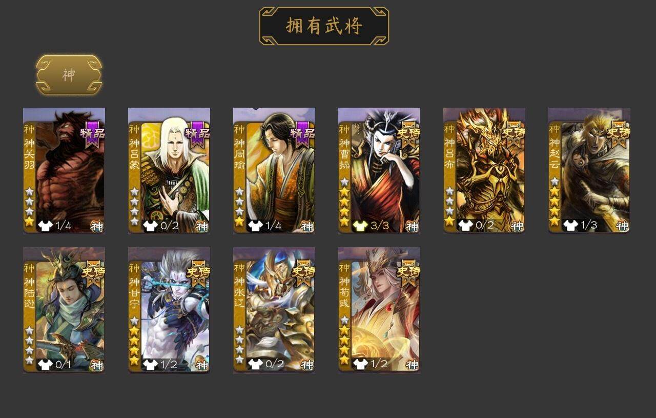 [15181219]【317】官阶:大将军;vip等级:vip12;史诗武将数量:54;动态皮肤数量:46;武将总数:364;史诗宝珠数量:0;将魂数量:625;神将:10;魏国史诗武将:31;蜀国史诗武将:14;吴国史诗武将:4;群史诗武将:16 神曹操神吕布神赵云神陆逊神甘宁神张辽神荀彧神关羽神吕蒙神周瑜张昌蒲王粲谋曹操杨修文鸯马钧界钟会界于禁界曹真嵇康郝昭曹纯戏志才关索谋孙尚香谋夏侯氏谋赵云谋马超诸葛瞻赵襄张星彩沙摩柯谯周界黄忠花鬘董允周处留赞界徐盛贺齐谋黄月英左慈张让杨彪星黄忠陶谦司马徽南华老仙刘焉沮授界左慈界李儒杜预卑弥呼许攸势于吉神关羽-链狱鬼神神郭嘉-虎年清明动态神荀彧-匡汉延祚动态神甘宁-万人辟易动态神曹操-天下归心神曹操-玄天通冥动态神曹操-四方归心动态神赵云-战龙在野动态钟会-潜蛟觊天动态星周不疑-龙年清明动态sp蔡文姬-兔年冬日动态郭嘉-十胜十败动态荀彧-驱虎吞狼动态邓艾-神兵天降动态王粲-笔翰如流动态界郭嘉-十胜十败动态界邓艾-神兵天降动态张春华-雪中舞刃动态曹昂-竭战麟伤动态戏志才-举棋若定动态朱灵-以战破氐动态马钧-能工巧匠动态司马昭-昭威淮南(动态)星徐晃-斧引霹雳动态花鬘-依心缱绻动态刘备-龙御天下动态卧龙诸葛-龙跃凤鸣动态关索-依心缱绻动态关羽-明良千古动态马超-虎年冬至动态黄月英-明良千古动态黄忠-明良千古动态界黄月英-明良千古动态夏侯氏-明良千古动态sp孙尚香-明良千古动态张星彩-虎年端午动态鲍三娘-虎年七夕动态李丰-太仓聚粟动态胡金定-明良千古动态孙策-兔年清明动态周处-义除三害动态孙策-虎踞江东动态孙权-吴王六剑动态孙尚香-兔年春节动态孙尚香-星流霆击动态小乔-采莲江南动态界孙权-吴王六剑动态界孙尚香-星流霆击动态界小乔-采莲江南动态徐盛-破军杀将动态刘赞-灵魂歌王动态许攸-火烧乌巢动态袁绍-声震寰宇动态杜预-龙吟破竹动态袁绍