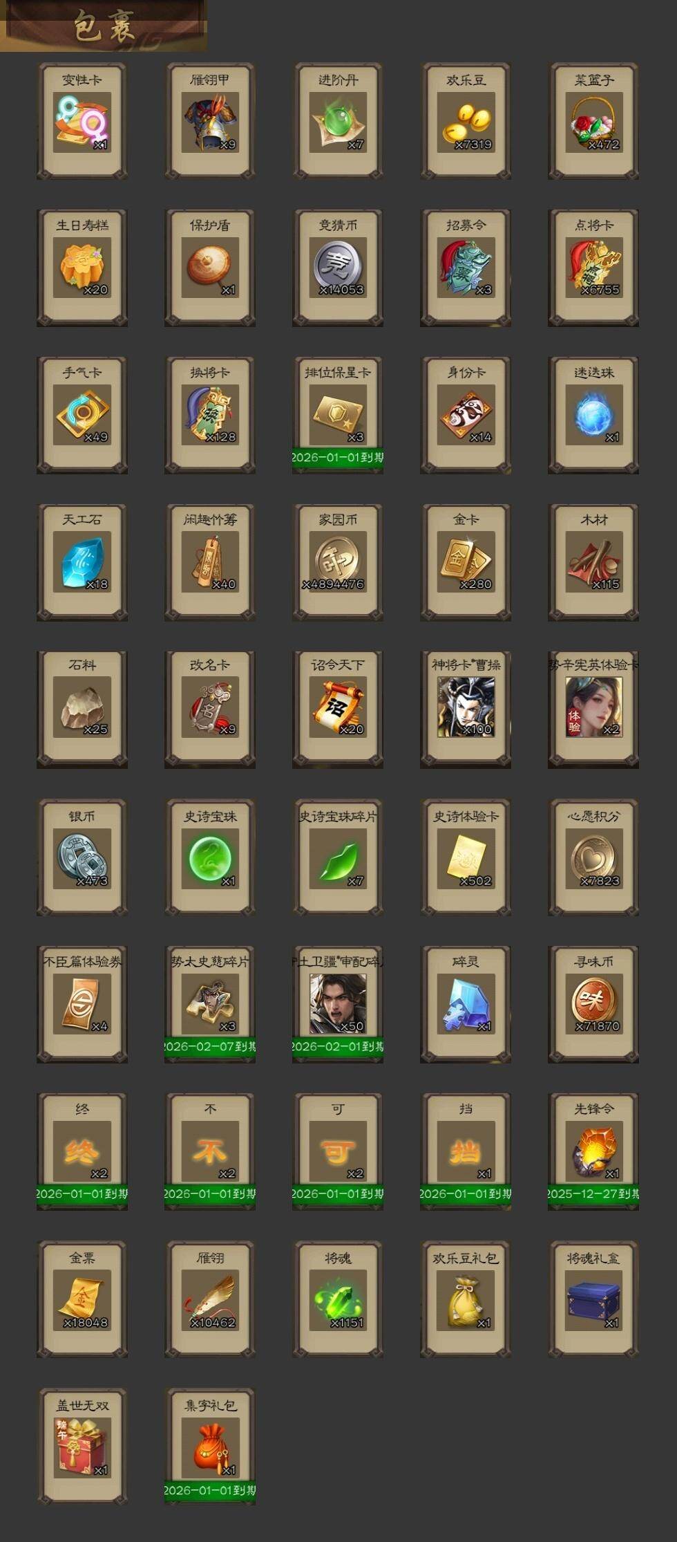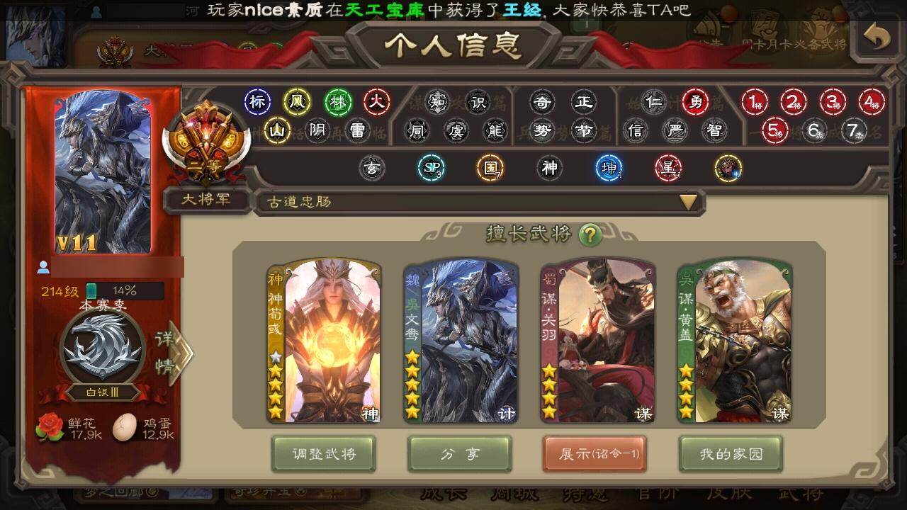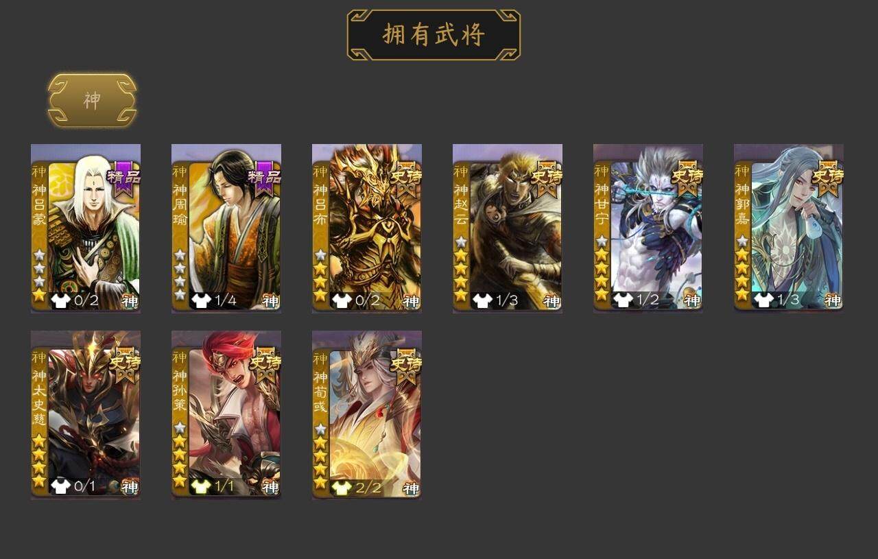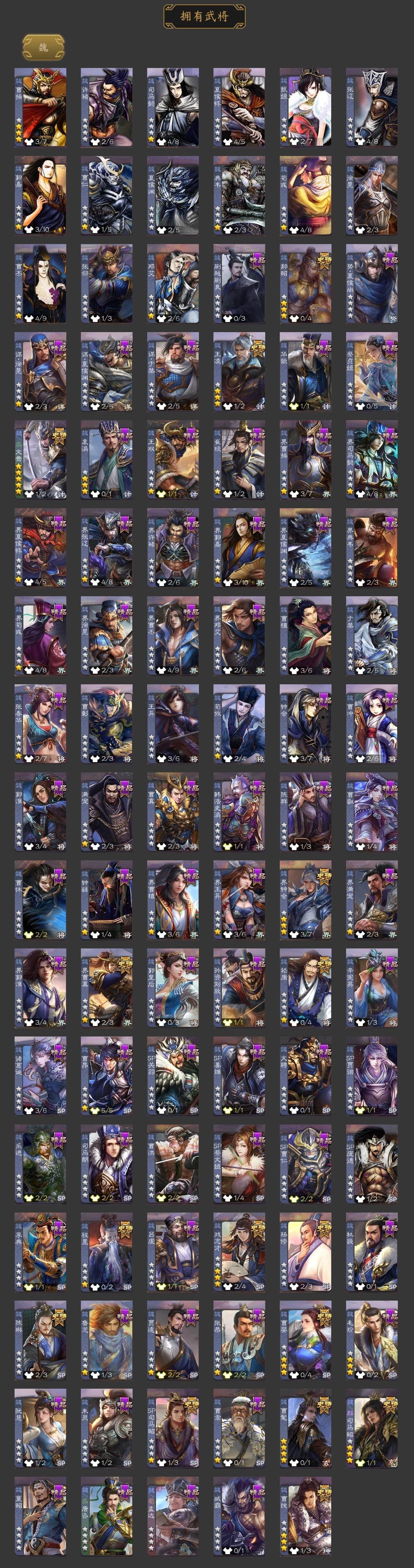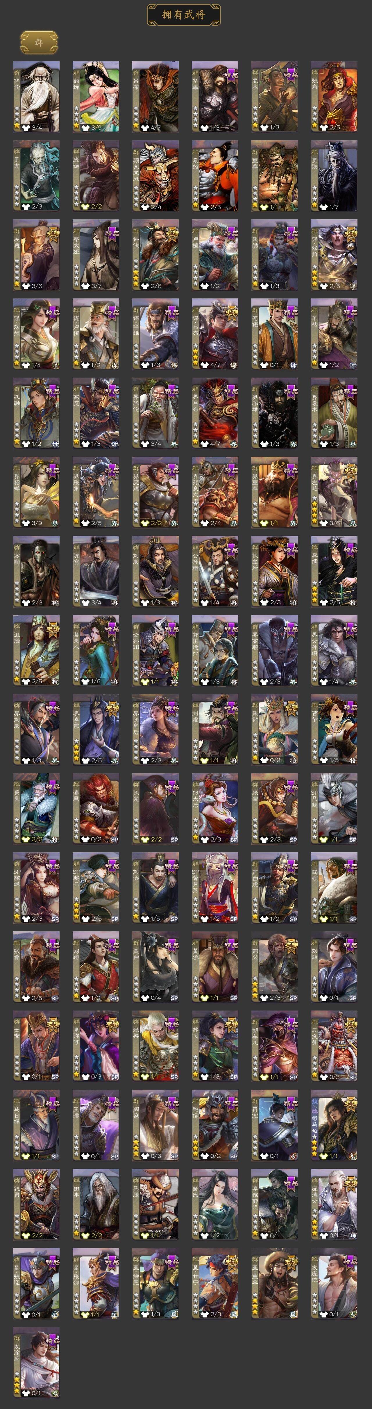 [15181246]【407】官阶:大将军;vip等级:vip11;史诗武将数量:61;动态皮肤数量:53;武将总数:416;史诗宝珠数量:1;将魂数量:1151;神将:9;魏国史诗武将:41;蜀国史诗武将:15;吴国史诗武将:9;群史诗武将:18 神吕布神赵云神甘宁神郭嘉神太史慈神孙策神荀彧神吕蒙神周瑜sp司马昭曹髦杨修文鸯王凌魏-司马昭界钟会界曹真嵇康郝昭陈琳曹婴曹纯戏志才马云騄谋孙尚香谋黄忠谋赵云谋马超诸葛瞻周群沙摩柯谯周傅佥界黄忠花鬘董允谋关羽谋黄盖吴景孙寒华骆统留赞界朱然界徐盛界步练师贺齐左慈张让星甘宁苏飞麹义庞德公沮授界左慈界李儒卑弥呼鲍信谋张角张绣阎象许攸谋吕布友徐庶星董卓神郭嘉-虎年清明动态神孙策-霸王再世动态神荀彧-虎年清明动态神荀彧-匡汉延祚动态神甘宁-万人辟易动态神陆逊-绽焰摧枯动态神曹操-天下归心神赵云-战龙在野动态星周不疑-才广志宏动态曹植-龙年中秋动态曹丕-龙年中秋动态sp蔡文姬-兔年冬日动态司马懿-牛年立冬动态荀彧-驱虎吞狼动态曹丕-牛年清明动态邓艾-神兵天降动态王粲-笔翰如流动态界司马懿-牛年立冬动态界曹丕-牛年清明动态界邓艾-神兵天降动态张春华-雪中舞刃动态钟会-谋谟之勋动态界钟会-谋谟之勋动态曹昂-竭战麟伤动态戏志才-举棋若定动态朱灵-以战破氐动态曹纯-虎年春节动态王元姬-鼠年冬至动态司马昭-昭威淮南(动态)星徐晃-斧引霹雳动态花鬘-依心缱绻动态诸葛亮-龙年限定动态关羽-明良千古动态马超-虎年冬至动态夏侯氏-明良千古动态sp孙尚香-猪年圣诞动态关银屏-兔年春节动态张星彩-虎年端午动态关索-虎年七夕动态鲍三娘-虎年七夕动态李丰-太仓聚粟动态胡金定-明良千古动态诸葛果-蛇年限定动态陆逊-龙年七夕动态孙策-虎踞江东动态孙寒华-莲华熠熠动态周瑜-免年清明动态黄盖-鏖战赤壁动态孙权-牛年七夕动态孙权-吴王六剑动态孙尚香-兔年春节动态大乔-猪