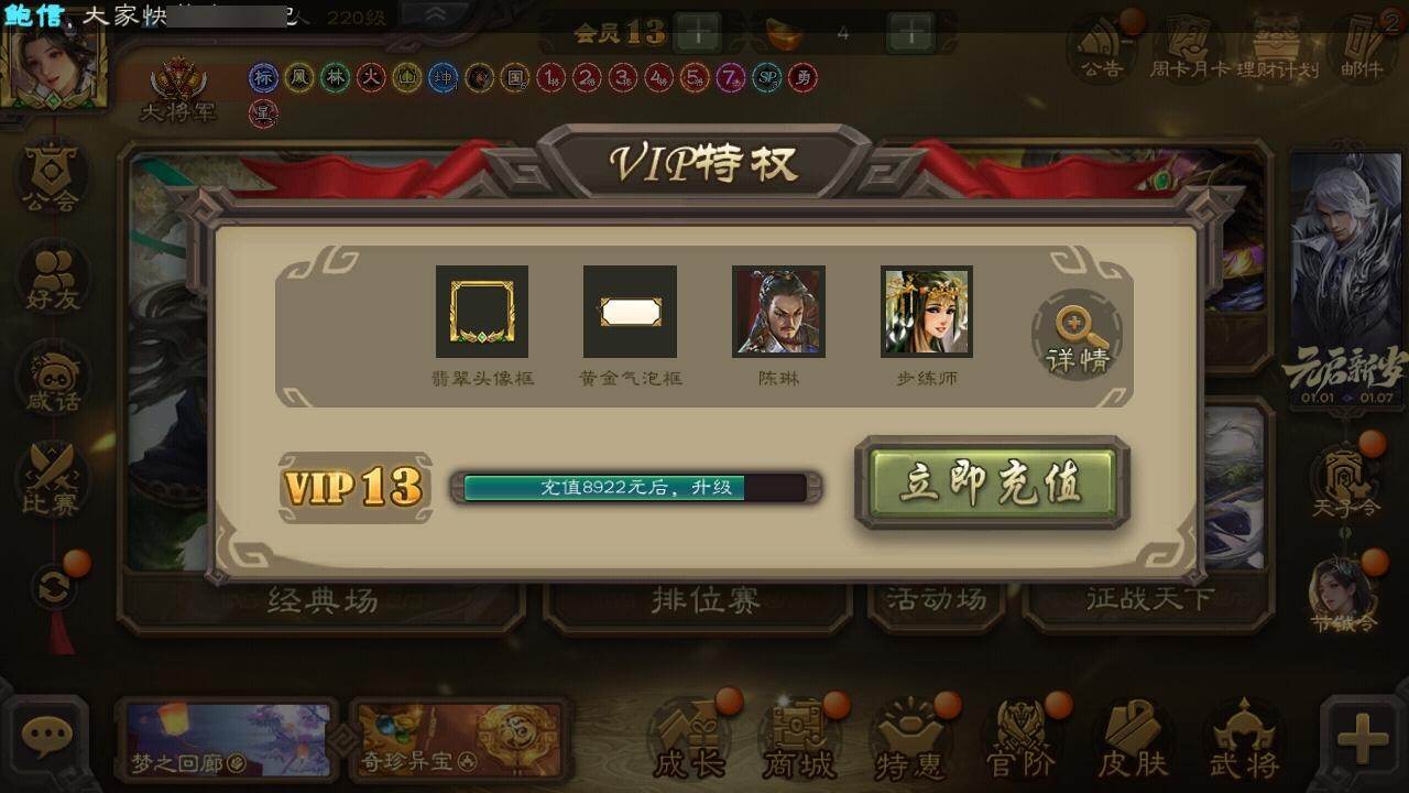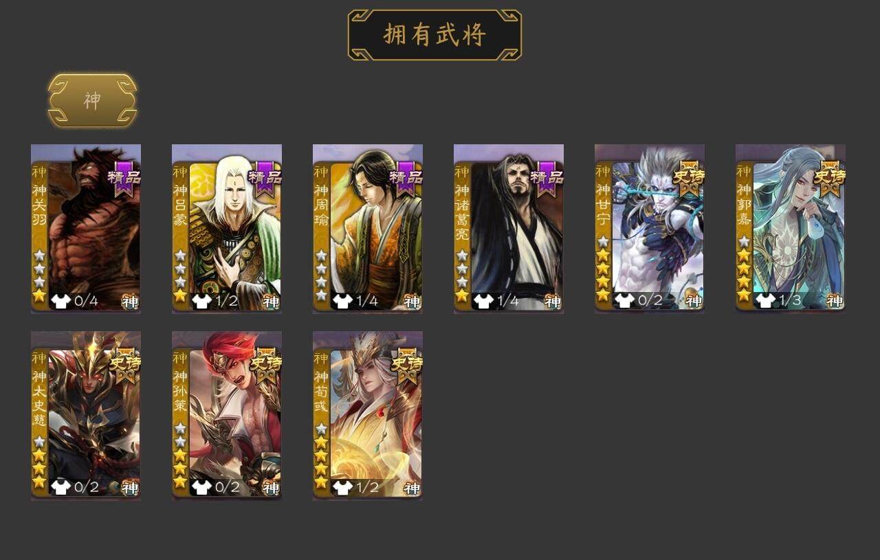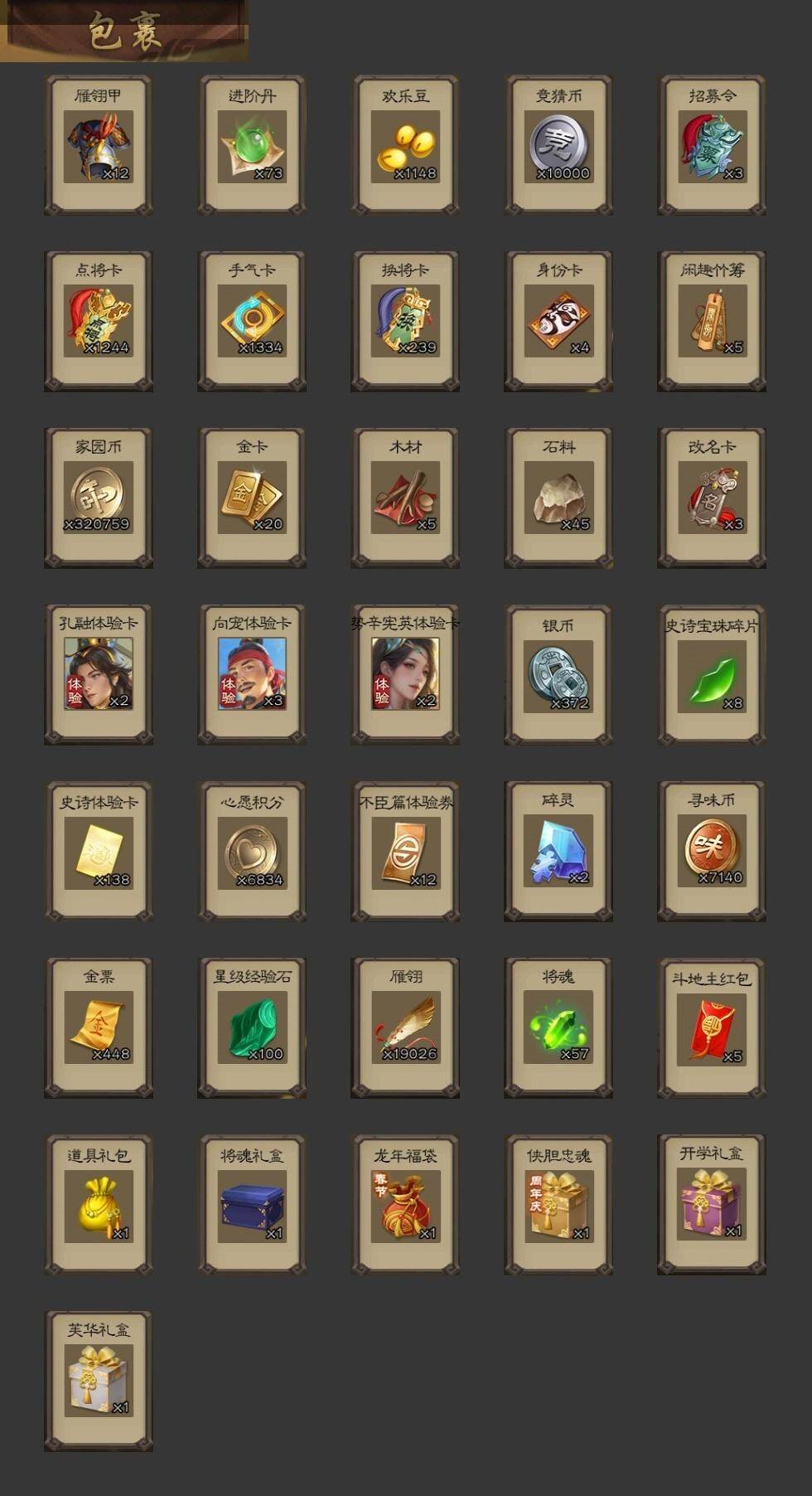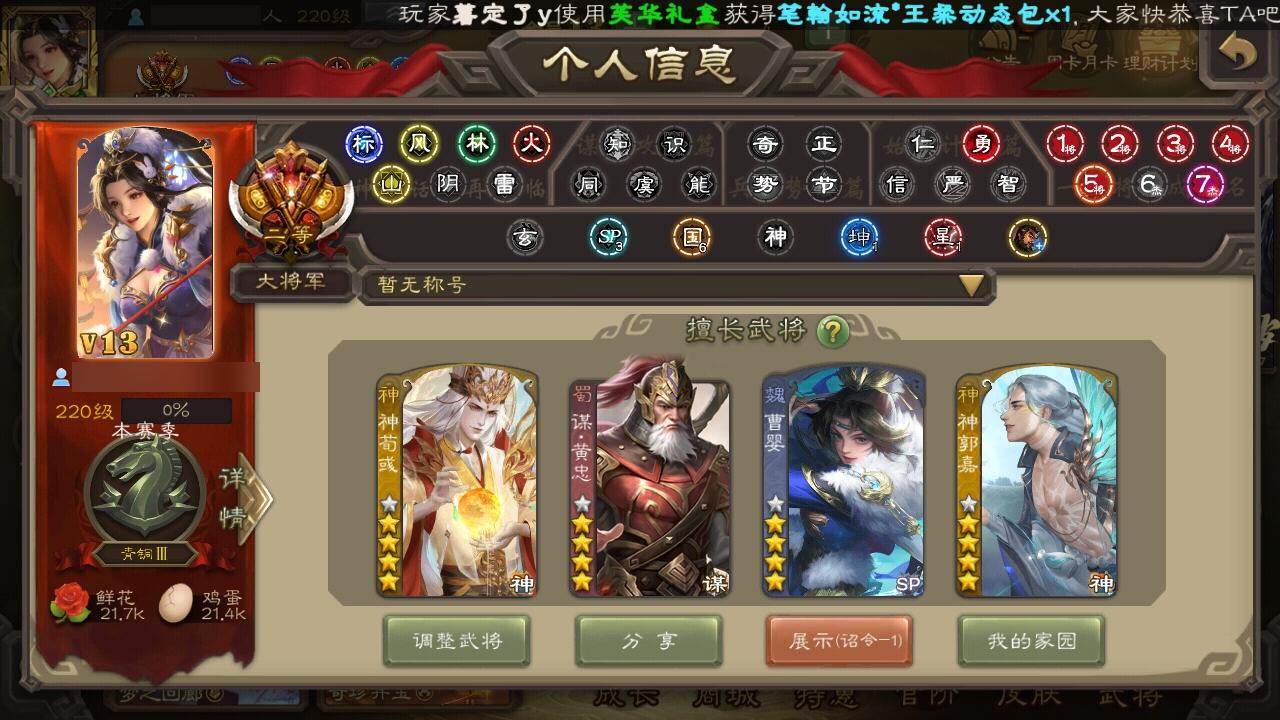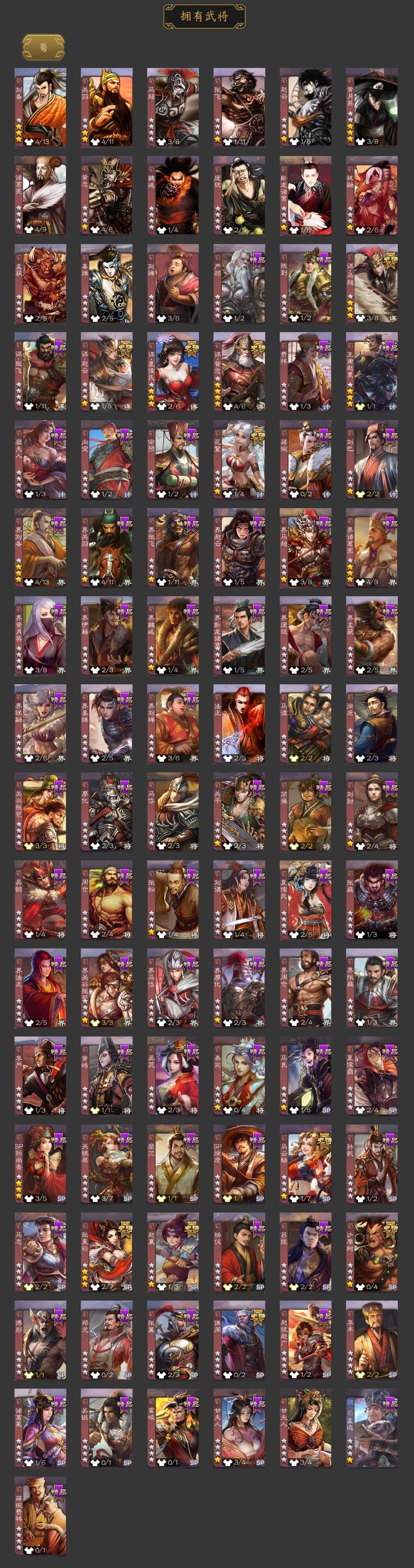 [15181385]【333】官阶:大将军;vip等级:vip13;史诗武将数量:48;动态皮肤数量:24;武将总数:412;史诗宝珠数量:0;将魂数量:57;神将:6;魏国史诗武将:19;蜀国史诗武将:10;吴国史诗武将:8;群史诗武将:15 神甘宁神郭嘉神太史慈神孙策神荀彧神诸葛亮王粲杨修王元姬马钧嵇康郝昭陈琳曹婴曹纯刘晔程昱马云騄谋黄忠谋夏侯氏谋赵云谋马超赵襄张星彩沙摩柯谯周花鬘孙寒华骆统留赞界朱然界徐盛界步练师文鸯十常侍界沮授皇甫嵩左慈星黄忠王允麹义祢衡刘焉沮授界左慈界李儒许攸兀突骨士燮神吕蒙神周瑜神关羽sp关羽sp曹仁sp蔡文姬乐进曹昂诸葛诞朱灵文聘sp姜维张春华钟会曹冲郭淮满宠界王异界曹操界司马懿界夏侯惇界张辽界许褚界郭嘉李典曹真韩浩史涣陈群曹叡曹休钟繇司马朗王基李通郭皇后孙资刘放辛宪英界甄姬吕虔鲁芝蒯越蒯良界荀彧界徐晃杜畿界曹丕毌丘俭界邓艾贾逵界曹植界曹彰界满宠界郭淮卞夫人华歆蔡贞姬袁涣王双崔琰毛玠阮慧曹嵩谋徐晃谋于禁界曹休牵招胡班谋夏侯渊牛金界夏侯渊界曹仁臧霸唐咨sp孙尚香关银屏夏侯霸马良关兴张苞廖化界马岱关平简雍刘封界法正界关兴张苞界刘备界关羽界张飞界赵云界马超sp徐庶吴懿周仓张松刘谌夏侯氏糜竺马忠孙乾李严黄皓吴苋秦宓界黄月英界诸葛亮赵统赵广严颜界伊籍界卧龙诸葛界庞统界孟获界祝融陈到界姜维界刘禅吕凯张翼杨仪界廖化邓芝傅肜费祎糜夫人王甫赵累界周仓向宠宗预蒋琬刘巴界张嶷谋张飞吴班霍峻诸葛果界魏延蒋琬费祎甘夫人鲁肃孙茹凌操大乔小乔诸葛恪诸葛瑾孙鲁育程普韩当潘璋马忠虞翻朱然界周泰界甘宁界吕蒙界黄盖界周瑜界大乔界陆逊孙鲁班朱桓顾雍孙休朱治全琮步骘阚泽孙登岑昏徐氏薛综界孙权界孙尚香潘濬陆绩孙亮严畯吕岱周鲂周妃陆抗界孙策界张昭张纮许贡卫温诸葛直界吴国太界凌统界韩当界程普界虞翻界潘璋马忠孙邵桥公张温陈武董袭孙翊