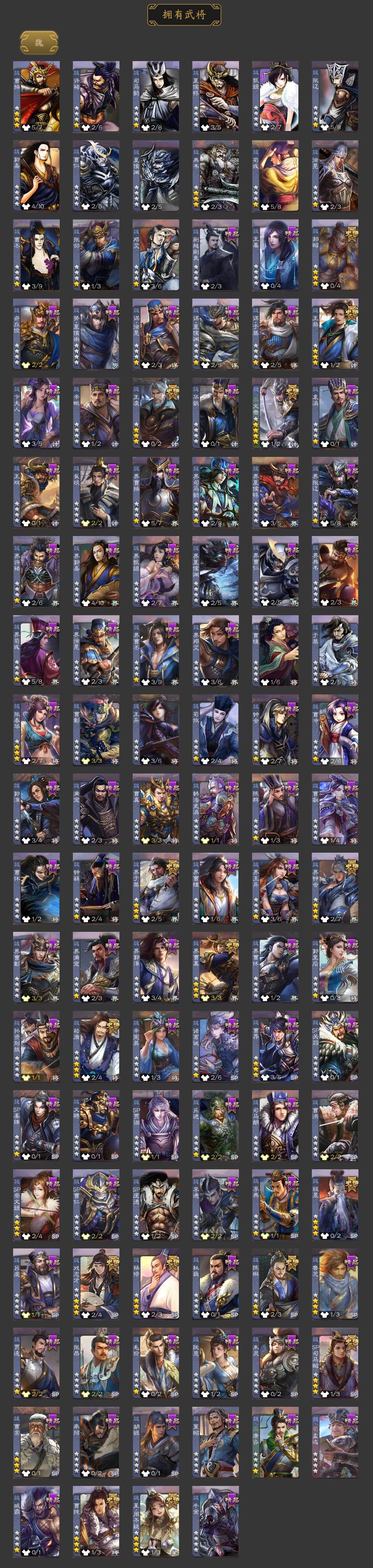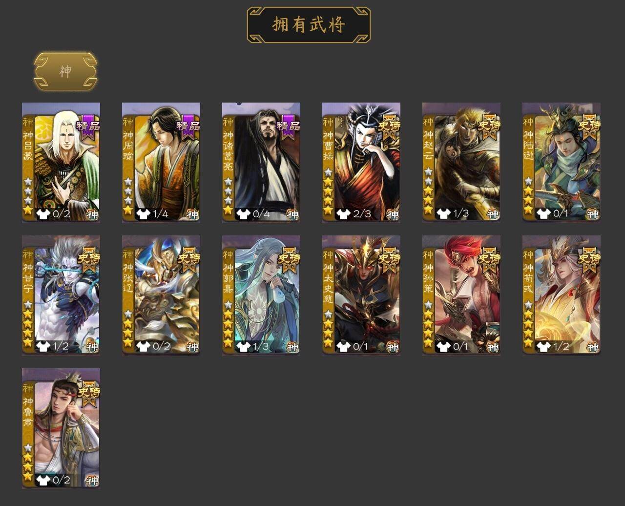 [15181703]【422】官阶:大将军;vip等级:vip12;史诗武将数量:59;动态皮肤数量:54;武将总数:429;史诗宝珠数量:0;将魂数量:62;神将:13;魏国史诗武将:32;蜀国史诗武将:11;吴国史诗武将:6;群史诗武将:19 神曹操神赵云神陆逊神甘宁神张辽神郭嘉神太史慈神孙策神荀彧神吕蒙神周瑜神诸葛亮神鲁肃sp司马昭星周不疑王粲杨修文鸯王凌界钟会界于禁界曹真嵇康郝昭陈琳曹纯戏志才马云騄谋黄忠谋赵云谋马超诸葛瞻王平沙摩柯谯周界黄忠花鬘董允周处骆统留赞界朱然界徐盛贺齐谋黄月英裴秀左慈张让星黄忠陶谦苏飞麹义南华老仙祢衡刘焉界左慈界李儒公孙康杜预鲍信张绣阎象许攸神郭嘉-虎年清明动态神荀彧-匡汉延祚动态神甘宁-万人辟易动态神曹操-天下归心神曹操-玄天通冥动态神赵云-战龙在野动态钟繇-安民护祚(动态)曹丕-气荡山河(动态)星周不疑-龙年清明动态sp蔡文姬-兔年冬日动态许褚-兔年端午动态曹丕-牛年清明动态邓艾-神兵天降动态界曹丕-牛年清明动态界邓艾-神兵天降动态张春华-雪中舞刃动态钟会-谋谟之勋动态曹真-虎年春节动态界钟会-谋谟之勋动态sp蔡文姬-冠绝天下动态戏志才-举棋若定动态曹婴-兔年春节动态曹纯-虎年春节动态刘备-龙御天下动态诸葛亮-龙年限定动态卧龙诸葛-龙跃凤鸣动态黄忠-烈箭贯云动态)诸葛亮-国之柱石(动态)关羽-明良千古动态诸葛瞻-绵竹之殇动态夏侯氏-明良千古动态张星彩-虎年端午动态关索-虎年七夕动态鲍三娘-虎年七夕动态鲍三娘-柳娇桃艳动态李丰-太仓聚粟动态诸葛果-虎年中秋动态诸葛果-蛇年限定动态周处-义除三害动态孙权-永开吴祚动态孙策-虎踞江东动态孙权-牛年七夕动态孙权-吴王六剑动态孙尚香-兔年春节动态孙尚香-星流霆击动态周妃-笼中箜响动态界孙权-牛年七夕动态界孙权-吴王六剑动态界孙尚香-星流霆击动态徐盛-破军杀将动态孙鲁育-牛年端午动态孙茹-烟水悠悠动态
