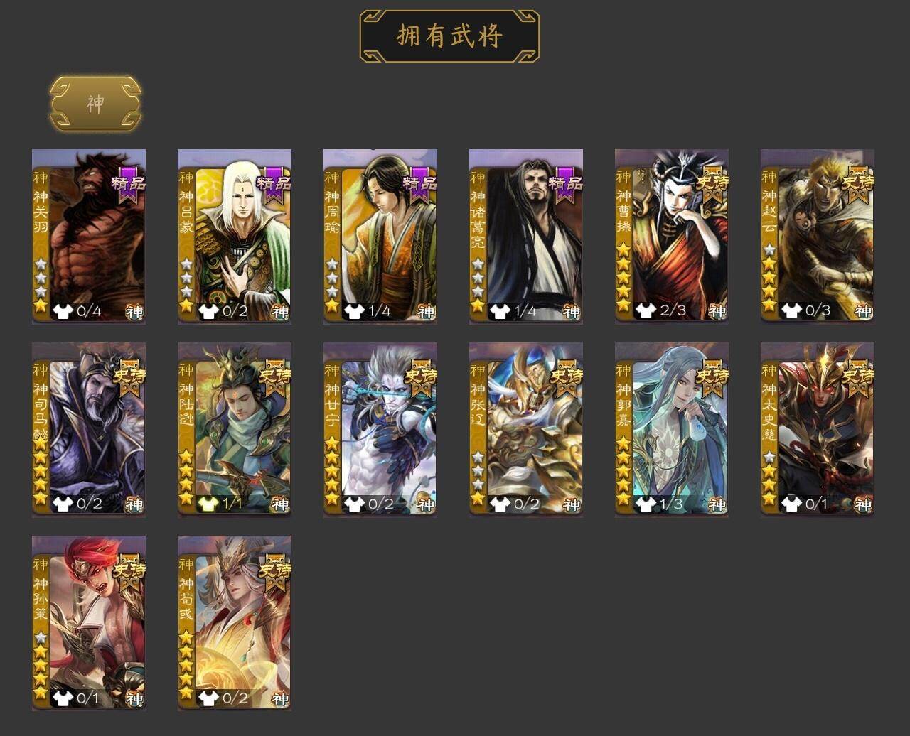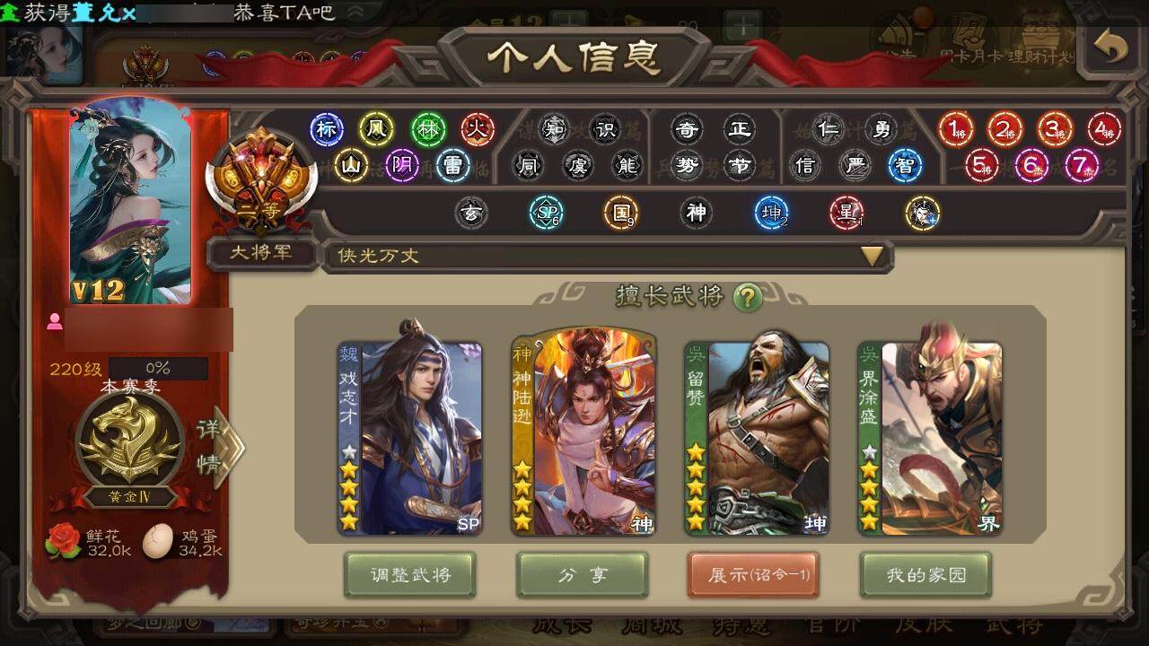 [15181717]【844】官阶:大将军;vip等级:vip12;史诗武将数量:66;动态皮肤数量:26;武将总数:440;史诗宝珠数量:30;将魂数量:222;神将:14;魏国史诗武将:20;蜀国史诗武将:11;吴国史诗武将:10;群史诗武将:18 神曹操神赵云神司马懿神陆逊神甘宁神张辽神郭嘉神太史慈神孙策神荀彧神关羽神吕蒙神周瑜神诸葛亮星周不疑王粲杨修羊徽瑜王元姬马钧界钟会界于禁界曹真嵇康郝昭陈琳曹纯戏志才刘晔清河公主马云騄谋赵云谋马超诸葛瞻周群赵襄张星彩王平沙摩柯花鬘董允周处吴景孙皓孙寒华骆统留赞界朱然界徐盛界步练师贺齐左慈张仲景张让杨彪星甘宁陶谦苏飞麹义庞德公祢衡刘焉沮授界李儒公孙康杜预张绣李傕许攸神郭嘉-虎年清明动态神陆逊-绽焰摧枯动态神诸葛亮-风舞魔鸟动态神曹操-天下归心神曹操-玄天通冥动态郭嘉-以身证道(动态)曹植-龙年中秋动态曹丕-猪年端午动态邓艾-神兵天降动态界曹丕-猪年端午动态界邓艾-神兵天降动态于禁-威严毅重动态界于禁-威严毅重动态界曹植-鼠年端午动态杨修-鼠年端午动态清河公主-魅影萦心动态刘备-明良千古动态关羽-啸风从龙动态关羽-明良千古动态马超-虎年冬至动态黄月英-虎年中秋动态诸葛亮-明良千古动态刘禅-猪年端午动态界刘备-明良千古动态界关羽-啸风从龙动态界诸葛亮-明良千古动态界刘禅-猪年端午动态胡金定-明良千古动态孙权-猪年端午动态孙权-吴王六剑动态大乔-鼠年春分动态周妃-笼中箜响动态界大乔-鼠年春分动态界孙权-猪年端午动态界孙权-吴王六剑动态孙鲁班-牛年端午动态界孙鲁班-牛年端午动态徐氏-琪花瑶草动态孙鲁育-牛年端午动态孙茹-烟水悠悠动态貂蝉-鼠年七夕动态吕布-鼠年七夕动态左慈-役使鬼神动态界吕布-鼠年七夕动态界貂蝉-鼠年七夕动态张鲁-虎年冬至动态苏飞-肝胆相照动态星甘宁-肝胆相照动态左慈-蛇年限定动态