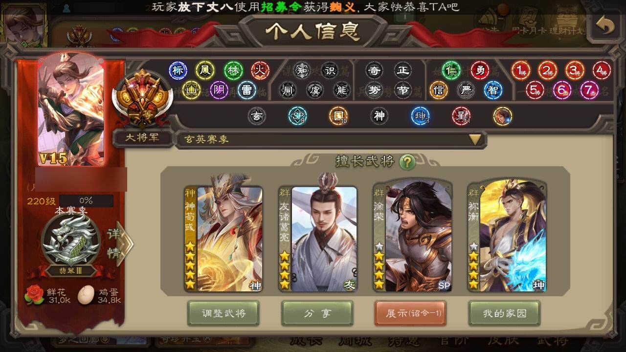 [15181846]【998】官阶:大将军;vip等级:vip15;史诗武将数量:86;动态皮肤数量:56;武将总数:465;史诗宝珠数量:0;将魂数量:222;神将:13;魏国史诗武将:49;蜀国史诗武将:14;吴国史诗武将:10;群史诗武将:31 神吕布神赵云神刘备神甘宁神张辽神郭嘉神太史慈神孙策神荀彧神关羽神吕蒙神周瑜神诸葛亮sp司马昭曹髦张昌蒲王粲杨修羊徽瑜文鸯王元姬王凌王朗司马师马钧界钟会界于禁界曹真嵇康郝昭陈琳曹纯戏志才刘晔关索马云騄谋黄忠谋赵云谋马超诸葛瞻周群赵襄张星彩王平沙摩柯谯周花鬘董允周处吴景孙皓孙寒华骆统留赞界朱然界徐盛界步练师贺齐皇甫嵩左慈郑玄张仲景张让张琪瑛杨彪徐荣星黄忠星甘宁王允陶谦苏飞司马徽审配麹义庞德公南华老仙祢衡刘璋沮授界左慈界李儒公孙康杜预陈登卑弥呼张绣李傕许攸友诸葛亮神荀彧-虎年清明动态神陆逊-绽焰摧枯动态神诸葛亮-风舞魔鸟动态神周瑜-焰腾麒麟动态神诸葛亮-观星唤雨神曹操-天下归心神赵云-战龙在野动态sp司马昭-鼠年冬至(动态)钟繇-安民护祚(动态)许褚-虎啸生风动态甄姬-牛年清明动态甄姬-洛水神韵动态郭嘉-十胜十败动态曹丕-牛年清明动态邓艾-神兵天降动态界许褚-虎啸生风动态界郭嘉-十胜十败动态界甄姬-牛年清明动态界甄姬-洛水神韵动态界曹丕-牛年清明动态界邓艾-神兵天降动态于禁-威严毅重动态钟会-谋谟之勋动态曹真-虎年春节动态界于禁-威严毅重动态界曹植-鼠年端午动态界钟会-谋谟之勋动态程昱-泰山捧日动态杨修-鼠年端午动态朱灵-以战破氐动态王元姬-鼠年冬至动态羊徽瑜-牛年中秋动态司马师-牛年中秋动态刘备-明良千古动态关羽-明良千古动态马超-明良千古动态赵云-明亮千古动态诸葛亮-虎年中秋动态诸葛亮-明良千古动态刘禅-猪年端午动态诸葛瞻-绵竹之殇动态界刘备-明良千古动态界诸葛亮-明良千古动态界刘禅-猪年端午动态夏侯氏-明良千古动态