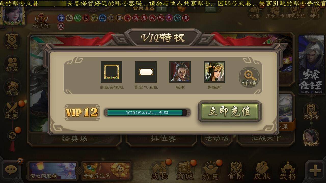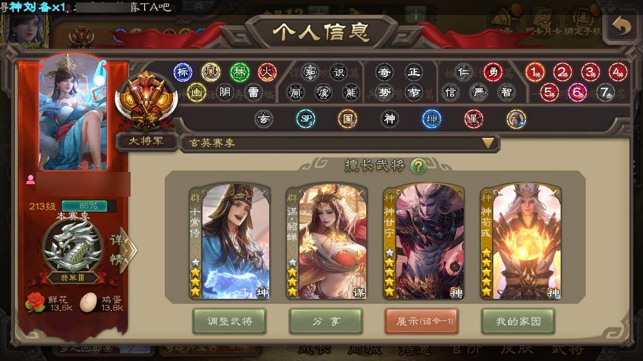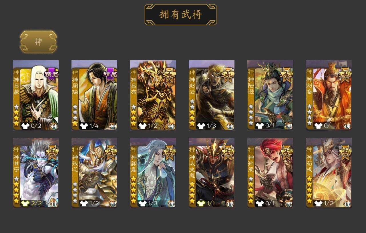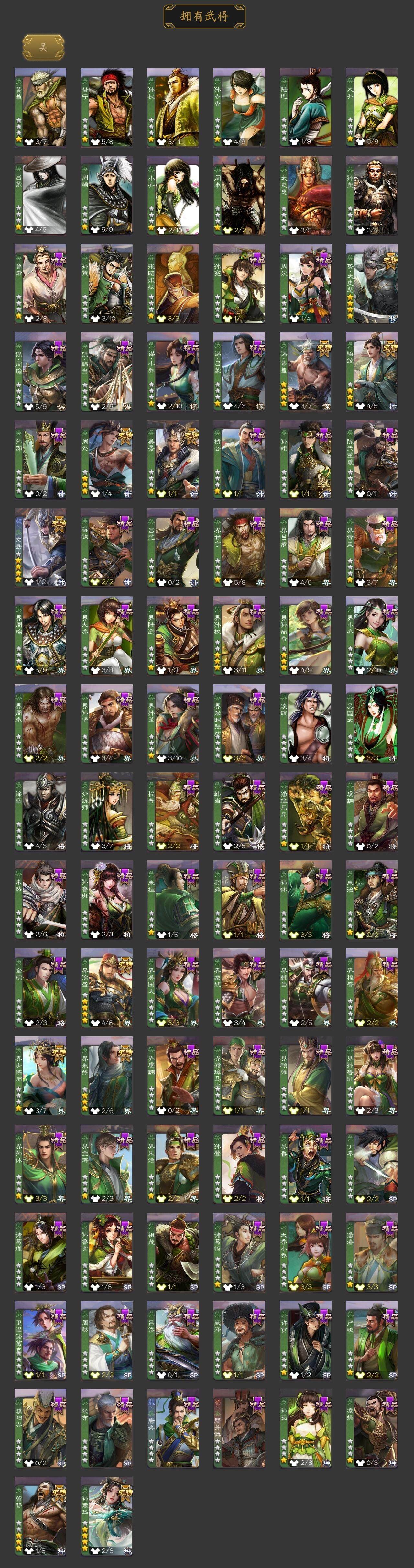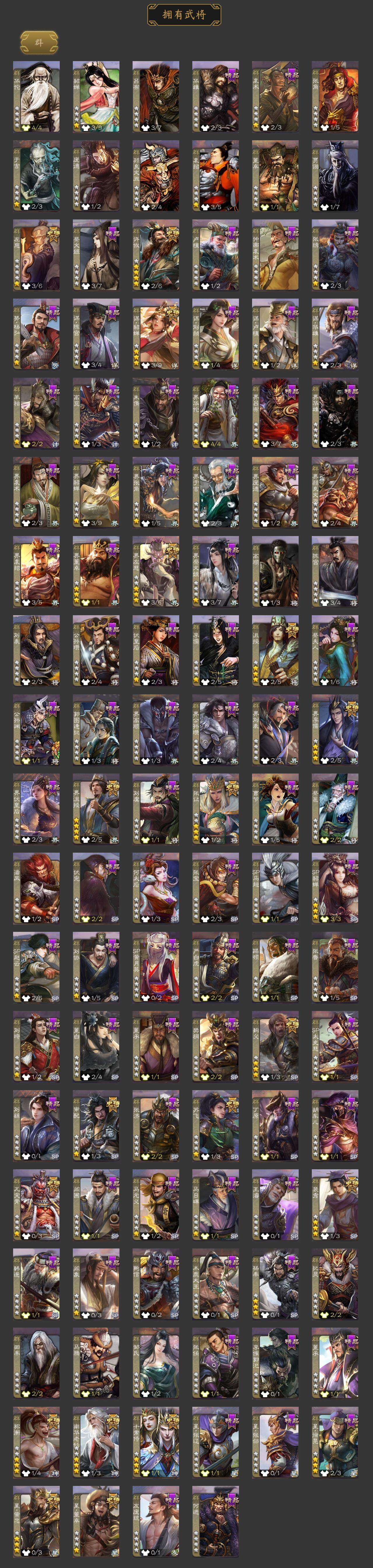 [15182003]【376】官阶:大将军;vip等级:vip12;史诗武将数量:70;动态皮肤数量:59;武将总数:440;史诗宝珠数量:0;将魂数量:1416;神将:12;魏国史诗武将:28;蜀国史诗武将:14;吴国史诗武将:10;群史诗武将:20 神吕布神赵云神陆逊神刘备神甘宁神张辽神郭嘉神太史慈神孙策神荀彧神吕蒙神周瑜曹髦星周不疑谋曹仁王粲杨修文鸯王元姬王朗界钟会界于禁界曹真嵇康郝昭陈琳曹纯戏志才清河公主关索谋诸葛亮马云騄谋黄忠谋夏侯氏谋赵云谋马超赵襄张星彩沙摩柯谯周界黄忠花鬘董允谋黄盖周处吴景孙寒华骆统留赞界朱然界徐盛界步练师势太史慈十常侍谋貂蝉裴秀界沮授左慈张让星黄忠苏飞审配麹义南华老仙祢衡沮授界左慈界李儒鲍信张绣阎象许攸星董卓神鲁肃-九州为局神郭嘉-虎年清明动态神太史慈-勇撼日月动态神荀彧-匡汉延祚动态神张辽-散敌擒孙神甘宁-战破无间神甘宁-万人辟易动态神曹操-天下归心神吕布-冠绝天下动态神赵云-战龙在野动态钟繇-安民护祚(动态)曹丕-气荡山河(动态)星周不疑-龙年清明动态甄姬-明珠耀躯(动态)甄姬-牛年清明动态荀彧-驱虎吞狼动态界甄姬-牛年清明动态张春华-雪中舞刃动态钟会-谋谟之勋动态界钟会-谋谟之勋动态戏志才-举棋若定动态曹婴-兔年春节动态曹纯-虎年春节动态清河公主-魅影萦心动态刘备-龙御天下动态卧龙诸葛-龙跃凤鸣动态黄忠-烈箭贯云动态)费祎-安民护祚(动态)刘备-龙骧麟振动态关羽-明良千古动态马超-西凉雄狮动态马超-虎年冬至动态界刘备-龙骧麟振动态界马超-西凉雄狮动态夏侯氏-明良千古动态关银屏-兔年春节动态关索-虎年七夕动态鲍三娘-虎年七夕动态李丰-太仓聚粟动态太史慈-涤荡江东动态周处-义除三害动态吕蒙-剑起惊澜动态黄盖-以身证道动态孙权-永开吴祚动态周瑜-兔年七夕动态孙策-虎踞江东动态孙寒华-莲华熠熠动态周瑜-免年清明动态孙权-冠绝天下动态孙尚香-兔年春节动态