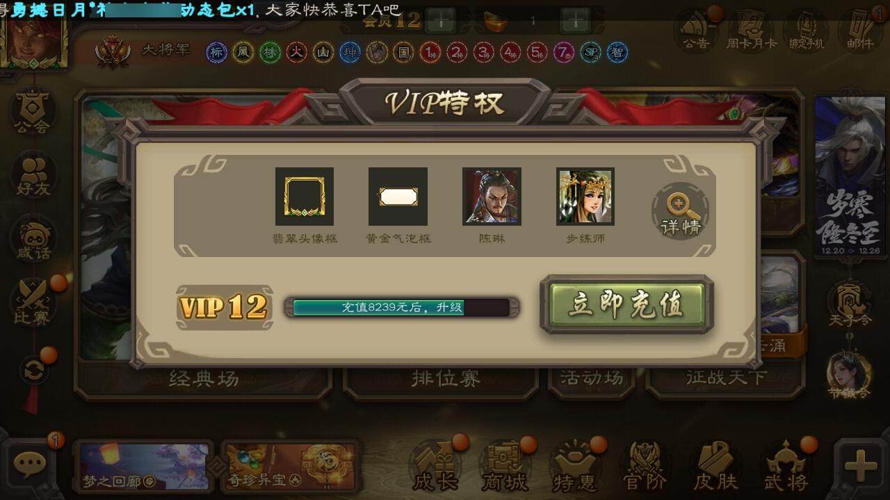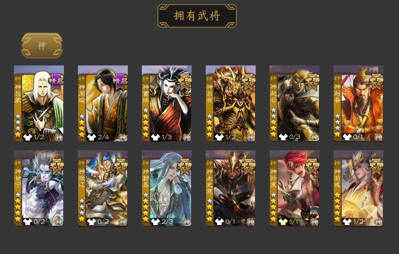 [15182015]【48】官阶:大将军;vip等级:vip12;史诗武将数量:60;动态皮肤数量:37;武将总数:402;史诗宝珠数量:0;将魂数量:905;神将:12;魏国史诗武将:20;蜀国史诗武将:14;吴国史诗武将:9;群史诗武将:12 神曹操神吕布神赵云神刘备神甘宁神张辽神郭嘉神太史慈神孙策神荀彧神吕蒙神周瑜王粲杨修文鸯马钧界钟会界于禁界曹真嵇康郝昭陈琳曹纯戏志才刘晔关索谋刘备马云騄谋黄忠谋夏侯氏谋赵云谋马超诸葛瞻赵襄张星彩王平谯周傅佥花鬘谋黄盖周处孙皓孙寒华骆统留赞界徐盛界步练师贺齐界沮授左慈杨彪星黄忠星甘宁王允陶谦司马徽刘焉沮授界李儒杜预神郭嘉-虎年清明动态神郭嘉-倚星折月动态神孙策-霸王再世动态神荀彧-虎年清明动态神陆逊-绽焰摧枯动态神吕蒙-兼资文武动态神周瑜-陵光引灵动态神诸葛亮-观星唤雨神诸葛亮-孟章诛邪动态神曹操-玄天通冥动态神吕布-冠绝天下动态sp司马昭-鼠年冬至(动态)sp蔡文姬-兔年冬日动态荀彧-驱虎吞狼动态邓艾-神兵天降动态王粲-笔翰如流动态界邓艾-神兵天降动态张春华-雪中舞刃动态曹婴-兔年春节动态曹纯-虎年春节动态马钧-能工巧匠动态王元姬-鼠年冬至动态诸葛亮-龙年限定动态卧龙诸葛-龙跃凤鸣动态关羽-明良千古动态马超-牛年春节动态赵云-牛年春节动态黄忠-明良千古动态界赵云-牛年春节动态界马超-牛年春节动态夏侯氏-明良千古动态关银屏-兔年春节动态马云騄-猪年大雪动态张星彩-临军对阵动态关索-鼠年中秋动态关索-虎年七夕动态鲍三娘-虎年七夕动态李丰-太仓聚粟动态胡金定-明良千古动态太史慈-涤荡江东动态周处-义除三害动态陆逊-龙年七夕动态孙权-牛年七夕动态陆逊-猪年圣诞动态小乔-猪年大雪动态界陆逊-猪年圣诞动态界孙权-牛年七夕动态徐盛-破军杀将动态步练师-牛年七夕动态界步练师-牛年七夕动态刘赞-灵魂歌王动态陆逊-蛇年清明动态貂蝉-鼠年七夕动态