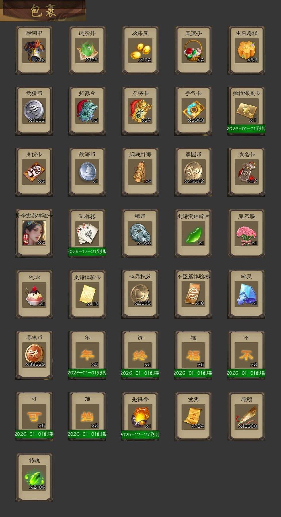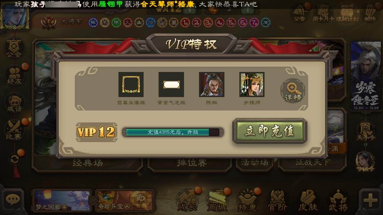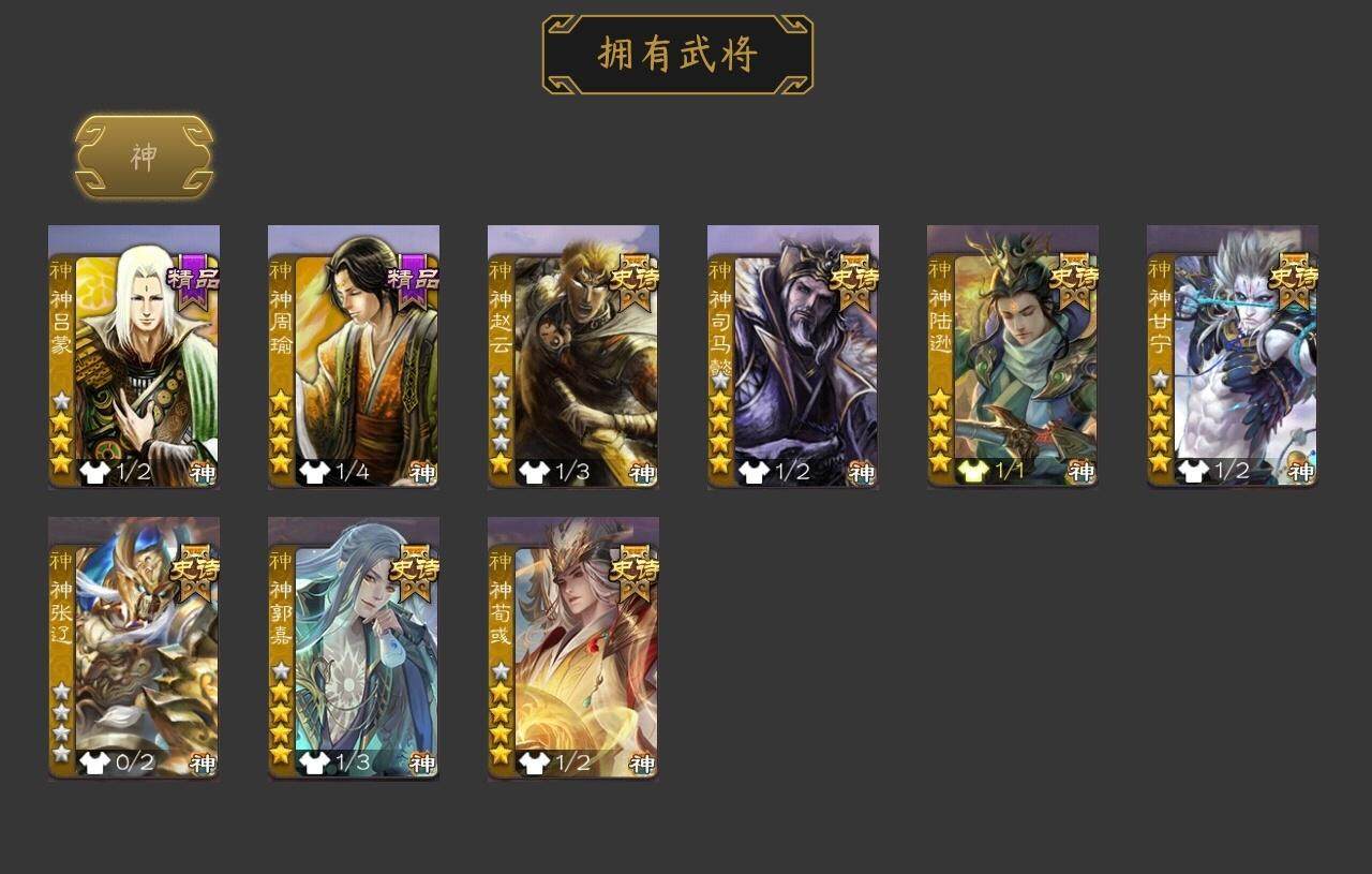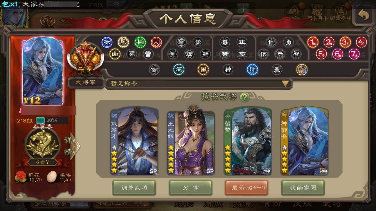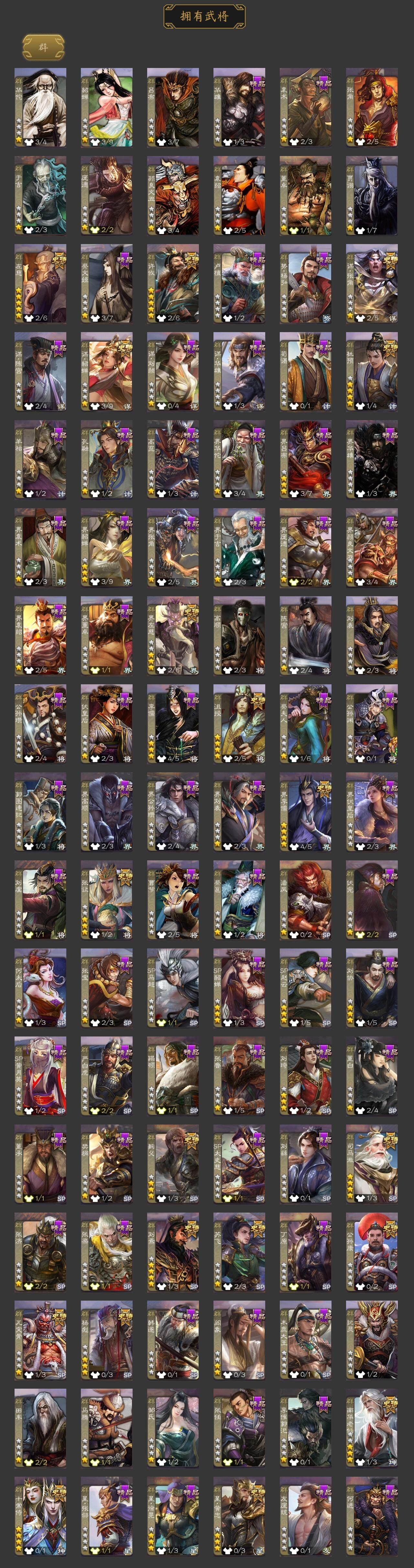 [15182054]【697】官阶:大将军;vip等级:vip12;史诗武将数量:64;动态皮肤数量:52;武将总数:411;史诗宝珠数量:0;将魂数量:2186;神将:9;魏国史诗武将:23;蜀国史诗武将:11;吴国史诗武将:7;群史诗武将:19 神赵云神司马懿神陆逊神甘宁神张辽神郭嘉神荀彧神吕蒙神周瑜sp司马昭曹髦星周不疑王粲杨修文鸯王元姬王朗马钧界钟会界于禁嵇康郝昭陈琳曹婴曹纯戏志才刘晔谋曹丕关索马云騄谋赵云诸葛瞻赵襄张星彩沙摩柯谯周界黄忠花鬘董允周处骆统留赞界朱然界徐盛界步练师贺齐十常侍谋貂蝉左慈张让杨彪星黄忠苏飞司马徽麹义南华老仙刘焉沮授界左慈界李儒公孙康杜预谋张角阎象许攸神郭嘉-倚星折月动态神荀彧-匡汉延祚动态神甘宁-万人辟易动态神陆逊-绽焰摧枯动态神关羽-血海罗刹动态神吕蒙-兼资文武动态神诸葛亮-孟章诛邪动态神曹操-天下归心神赵云-战龙在野动态神司马懿-鉴往知来动态星周不疑-才广志宏动态曹丕-气荡山河(动态)甄姬-明珠耀躯(动态)邓艾-神兵天降动态界邓艾-神兵天降动态钟会-谋谟之勋动态界钟会-谋谟之勋动态辛宪英-鼠年春节动态程昱-泰山捧日动态戏志才-举棋若定动态曹婴-锋芒毕露动态朱灵-以战破氐动态曹纯-长坂败备动态诸葛亮-龙年限定动态关羽-明良千古动态马超-牛年春节动态张飞-猪年中秋动态张飞-据水断桥动态赵云-牛年春节动态黄月英-木牛流马动态刘禅-猪年端午动态诸葛瞻-绵竹之殇动态界张飞-猪年中秋动态界张飞-据水断桥动态界赵云-牛年春节动态界马超-牛年春节动态界黄月英-木牛流马动态界刘禅-猪年端午动态关银屏-鼠年中秋动态赵襄-猪年春节动态关索-鼠年中秋动态胡金定-明良千古动态诸葛果-蛇年限定动态太史慈-涤荡江东动态周处-义除三害动态吕蒙-剑起惊澜动态陆逊-龙年七夕动态文鸯-破宇开天动态周瑜-免年清明动态黄盖-鏖战赤壁动态陆逊-猪年圣诞动态周瑜-鼠年春节动