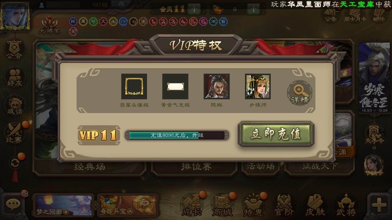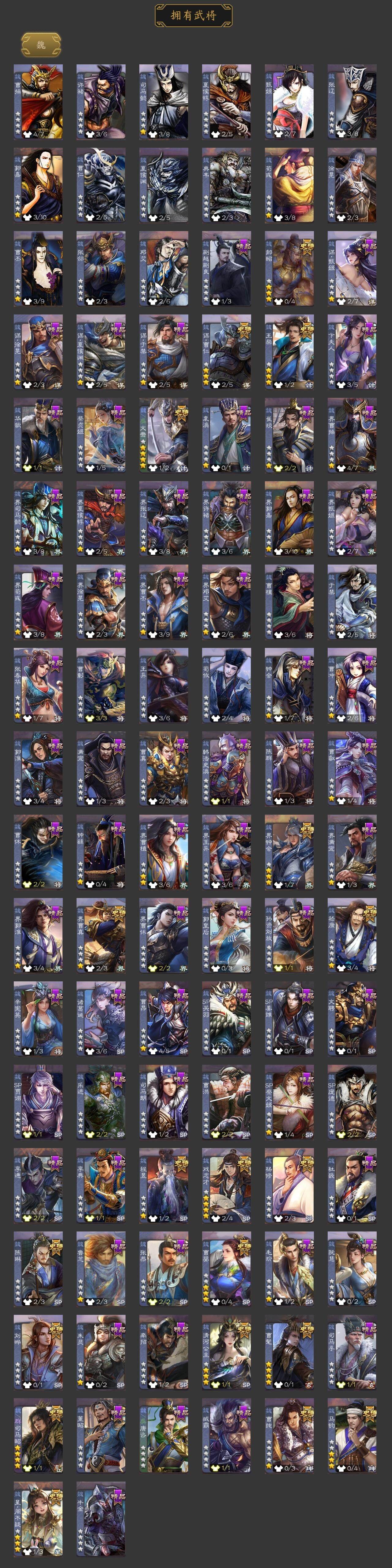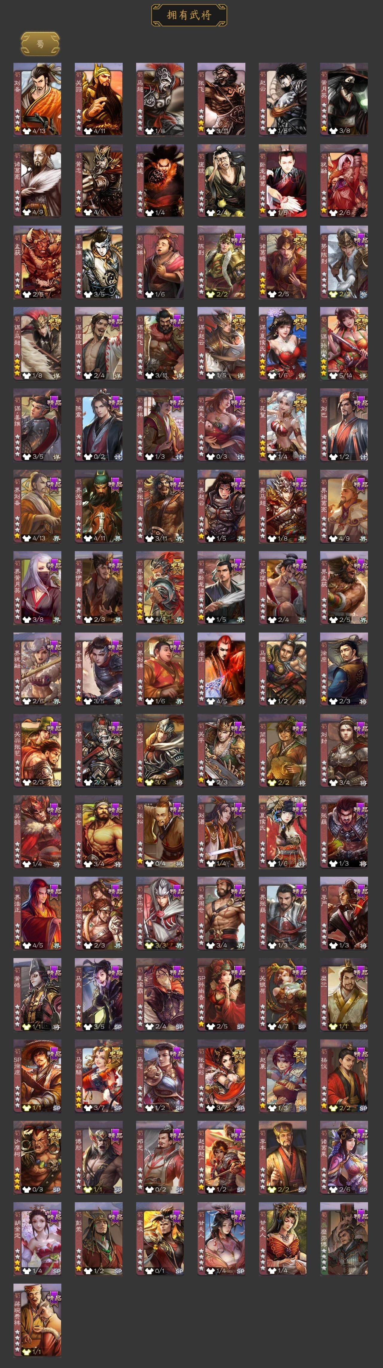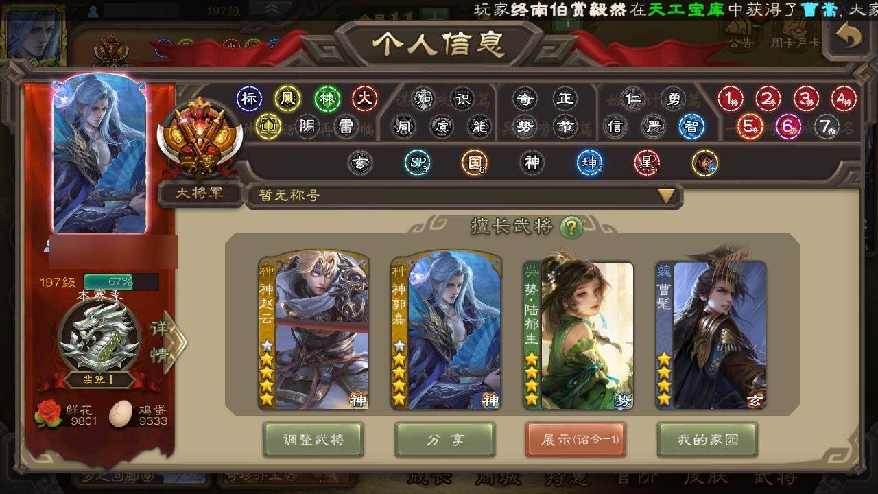 [15182082]【637】官阶:大将军;vip等级:vip11;史诗武将数量:62;动态皮肤数量:46;武将总数:390;史诗宝珠数量:0;将魂数量:547;神将:10;魏国史诗武将:20;蜀国史诗武将:12;吴国史诗武将:10;群史诗武将:14 神吕布神赵云神刘备神甘宁神张辽神郭嘉神太史慈神荀彧神吕蒙神周瑜曹髦星周不疑谋曹仁王粲杨修文鸯魏-司马昭马钧界钟会界曹真嵇康郝昭陈琳曹婴曹纯戏志才刘晔清河公主马云騄谋孙尚香谋夏侯氏谋赵云谋马超诸葛瞻赵襄张星彩沙摩柯界黄忠花鬘谋黄盖吴景孙寒华骆统留赞界徐盛界步练师贺齐势陆郁生势太史慈左慈张让陶谦审配麹义祢衡刘焉沮授界左慈界李儒杜预张绣许攸星董卓神郭嘉-虎年清明动态神郭嘉-倚星折月动态神荀彧-虎年清明动态神刘备-龙兴海内神赵云-鳞振九霄神吕布-监兵噬魅动态星周不疑-才广志宏动态曹丕-龙年中秋动态曹丕-牛年清明动态界曹丕-牛年清明动态界曹植-鼠年端午动态戏志才-举棋若定动态司马昭-昭威淮南(动态)嵇康-龙生九子动态星徐晃-斧引霹雳动态清河公主-魅影萦心动态花鬘-依心缱绻动态刘备-龙御天下动态关羽-明良千古动态黄月英-虎年中秋动态黄忠-明良千古动态夏侯氏-猪年中秋动态sp孙尚香-明良千古动态关银屏-兔年春节动态马云騄-明良千古动态张星彩-虎年端午动态李丰-太仓聚粟动态胡金定-明良千古动态孙茹-龙年七夕动态黄盖-兔年端午动态孙权-永开吴祚动态孙策-虎踞江东动态孙寒华-莲华熠熠动态周瑜-免年清明动态孙尚香-兔年春节动态大乔-猪年七夕动态小乔-猪年大雪动态界大乔-猪年七夕动态界小乔-猪年大雪动态孙鲁育-牛年端午动态孙茹-蛇年清明动态周瑜-蛇年端午动态文鸯-势若万钧动态灵雎-霜刃绚练动态袁绍-声震寰宇动态左慈-道法显威(动态)麹义-扬刀立威动态杜预-龙吟破竹动态蔡文姬-泪捻琵琶动态界蔡文姬-泪捻琵琶动态sp赵云-威名尽显动态皇甫嵩-奋钺振旅动态
